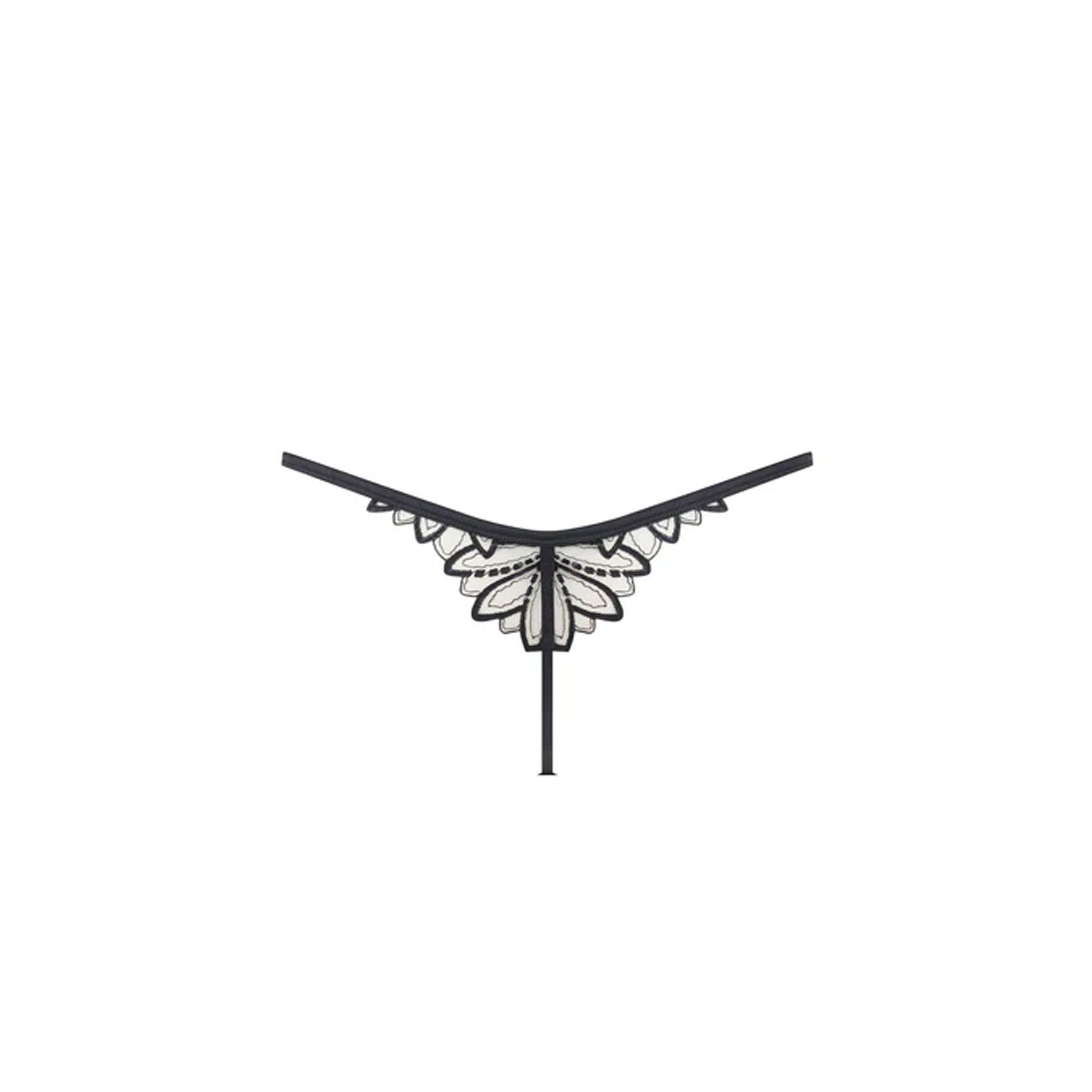 - Geometric floral embroidered design, sheer mesh, satin bindings, rear triangle keyhole detail, low-rise, minimal G-string back