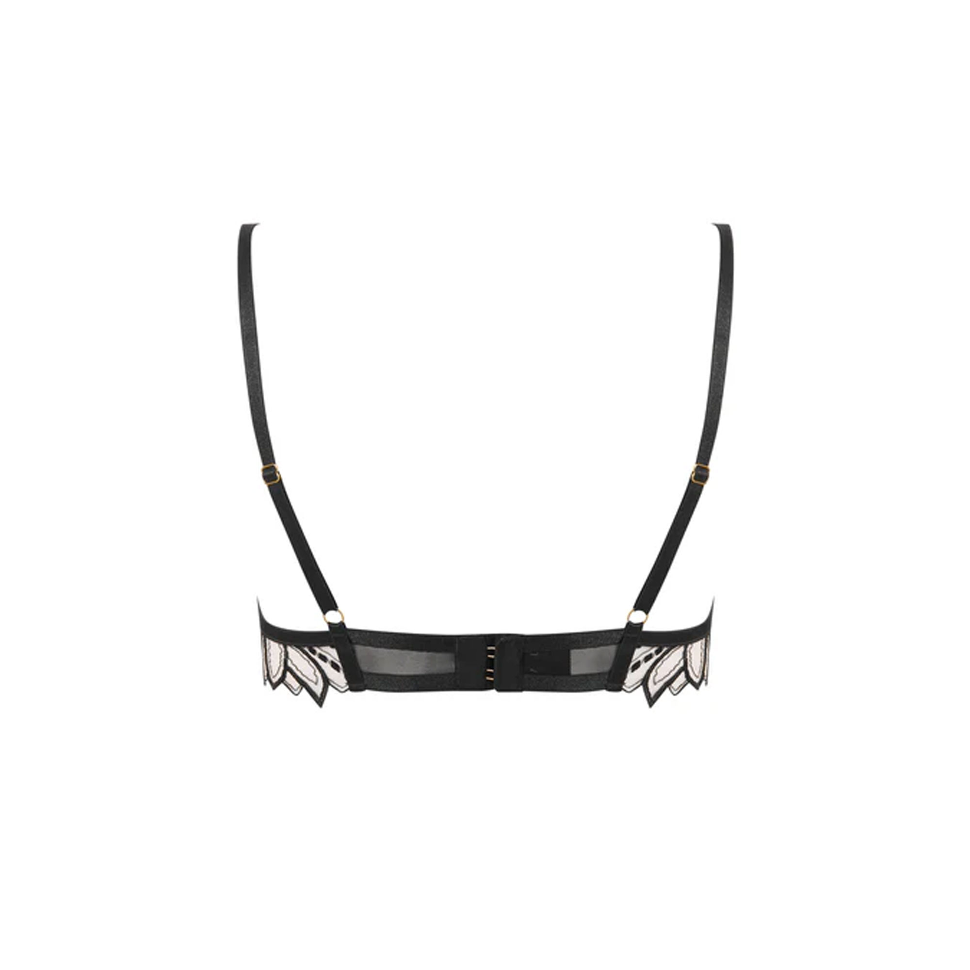 - Padded and push-up cups for lift and definition, botanical embroidery, sheer mesh panels through the underband and wings, smooth adjustable straps, rear hook-and-eye fastening