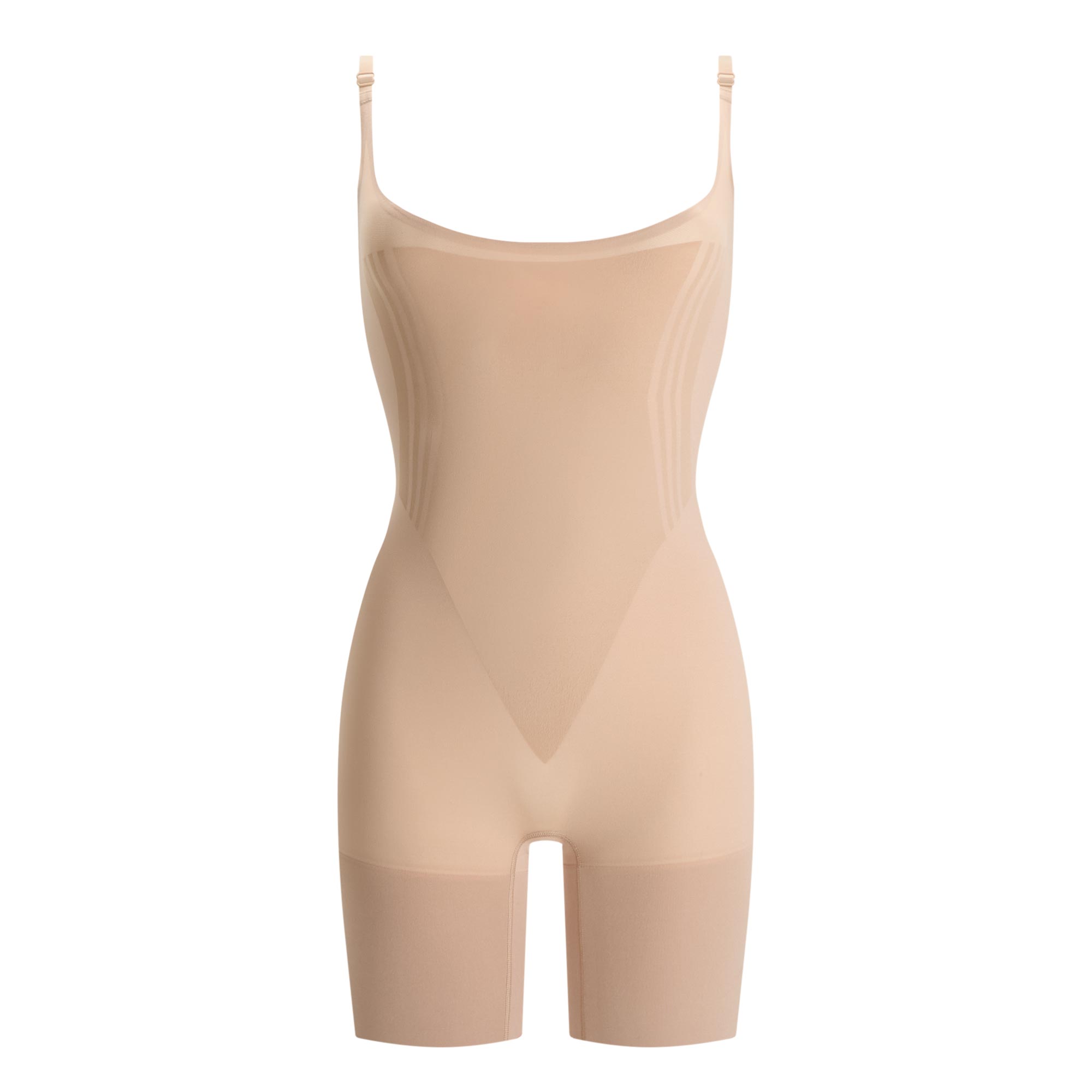 - Open-bust, adjustable straps, bonded underarm openings, double gusset, mid-thigh length, invisible leg openings