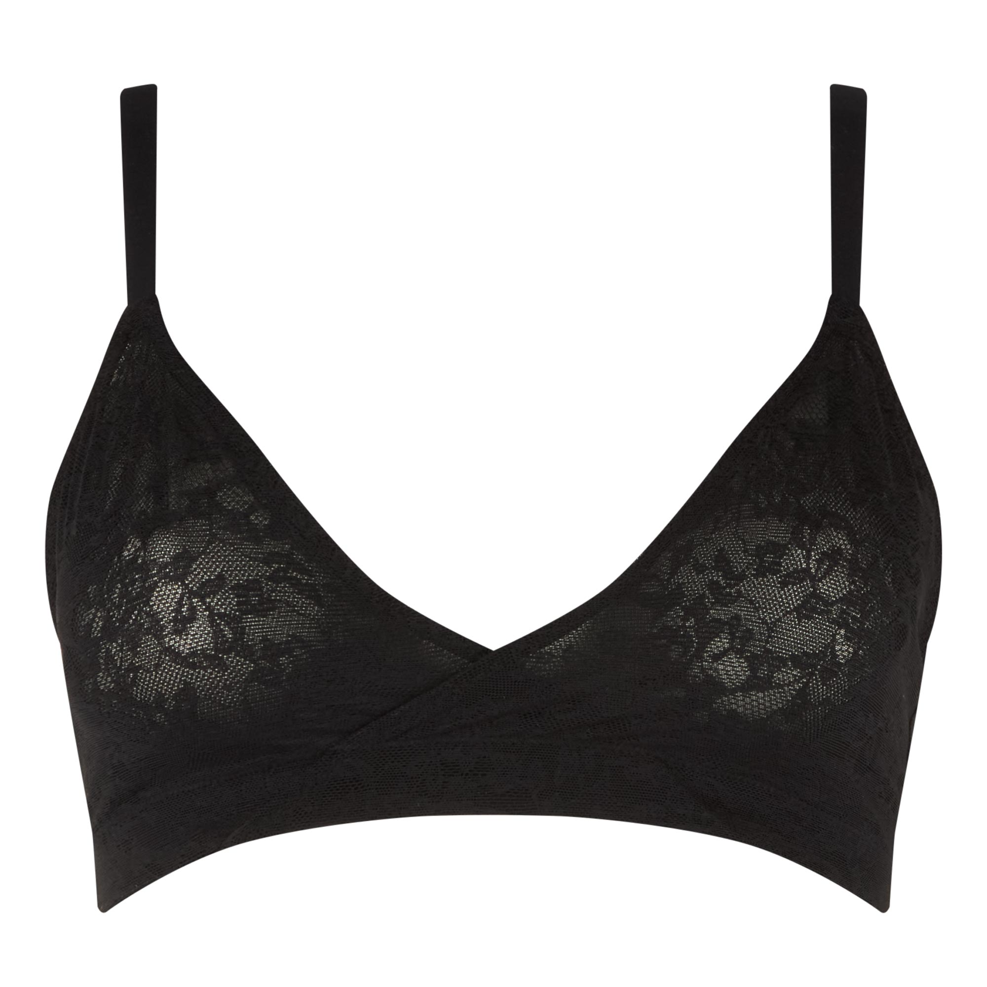 - Crossover front, adjustable straps, hook and eye fastening, elasticated underband, floral lace, sheer finish