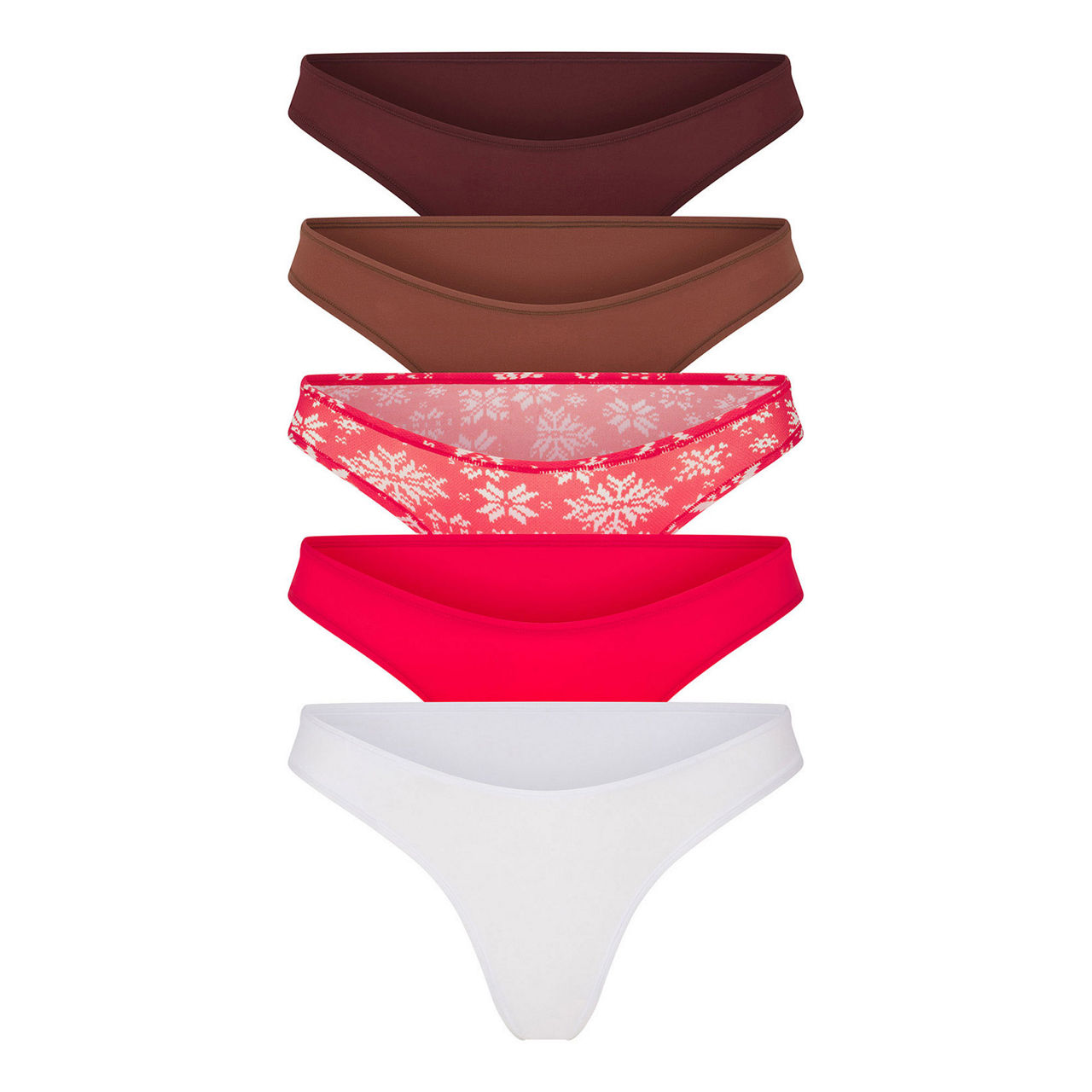 This 5-pack bundle of SKIMS’ ultra-soft and stretchy, no-dig thongs is available for a limited time in seasonal shades.