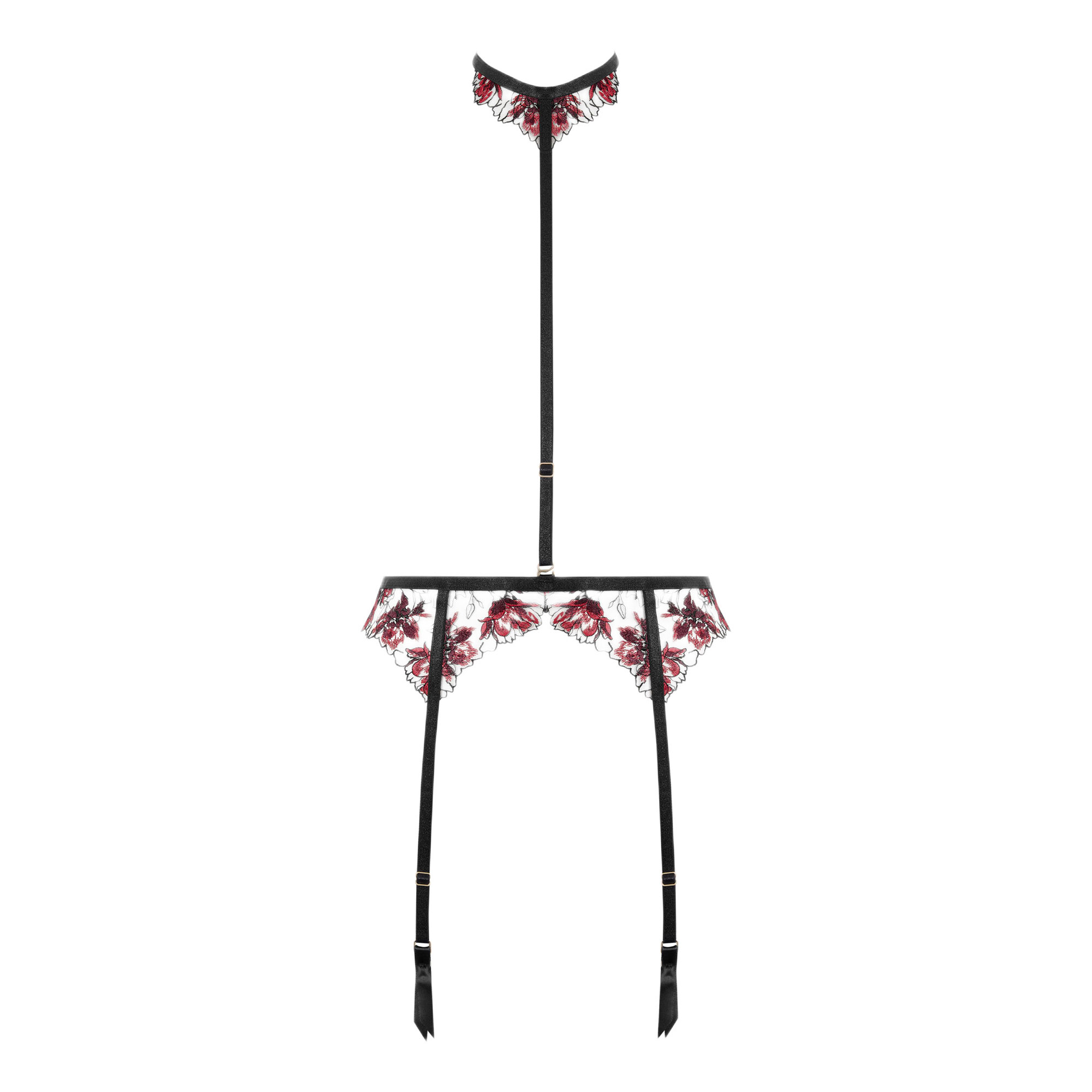 - Suspender belt skirt, sheer mesh detailing, tonal floral embroidery, adjustable thigh stocking straps, detachable neck collar, attached body harness
