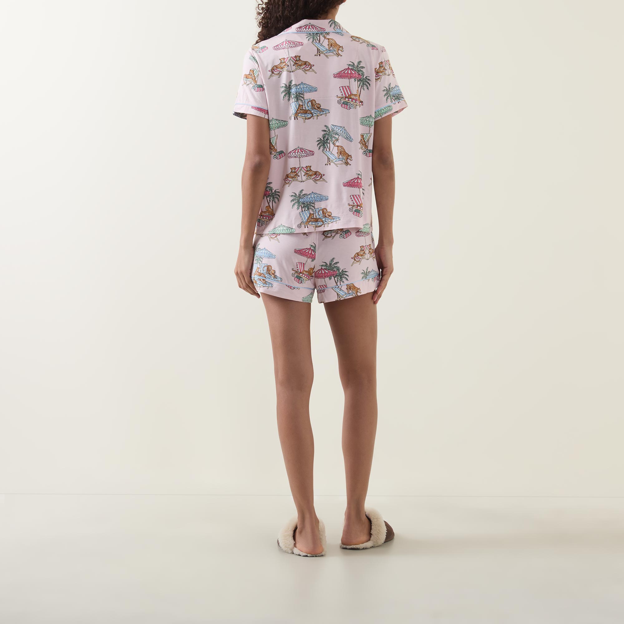- Shorts: Elasticated waistband, side entry pockets, contrast piped details, lounging leopards print
