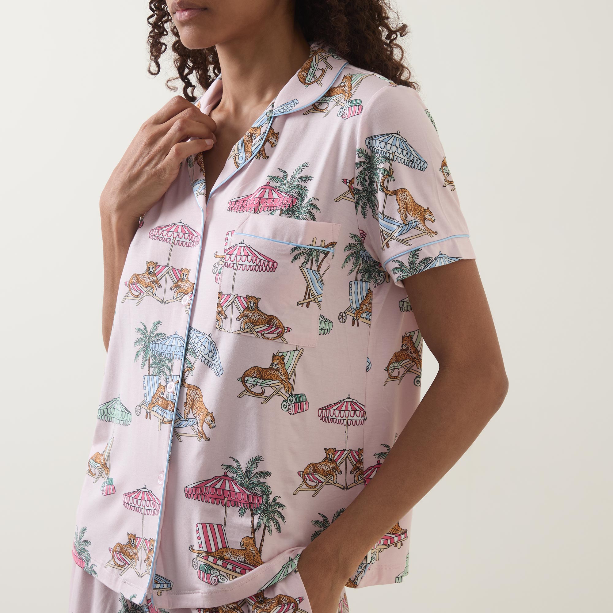 - Top: Revere collar, short sleeves, straight hemline, button fastening, chest pocket, piped detailing, branded tab at side seams, lounging leopards print