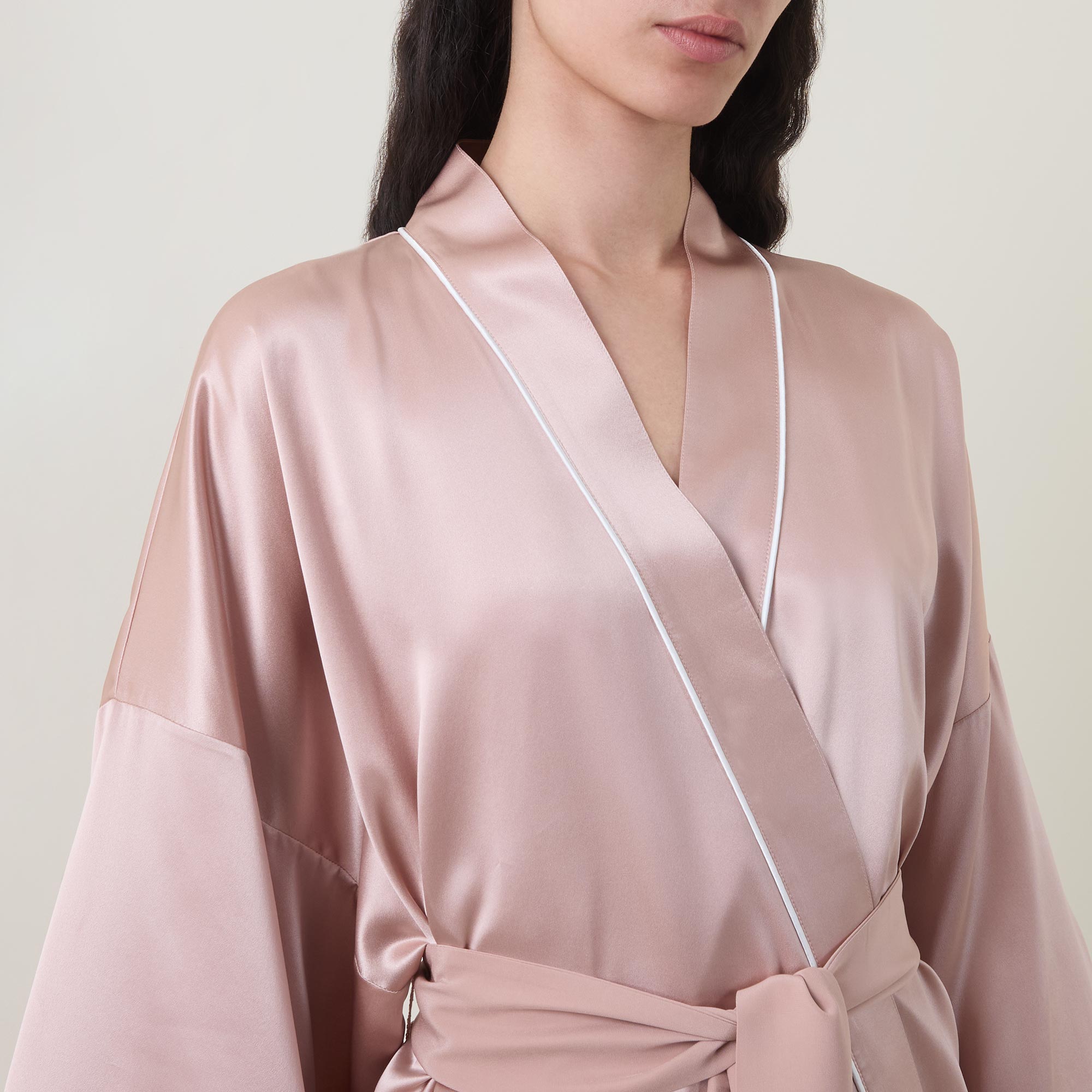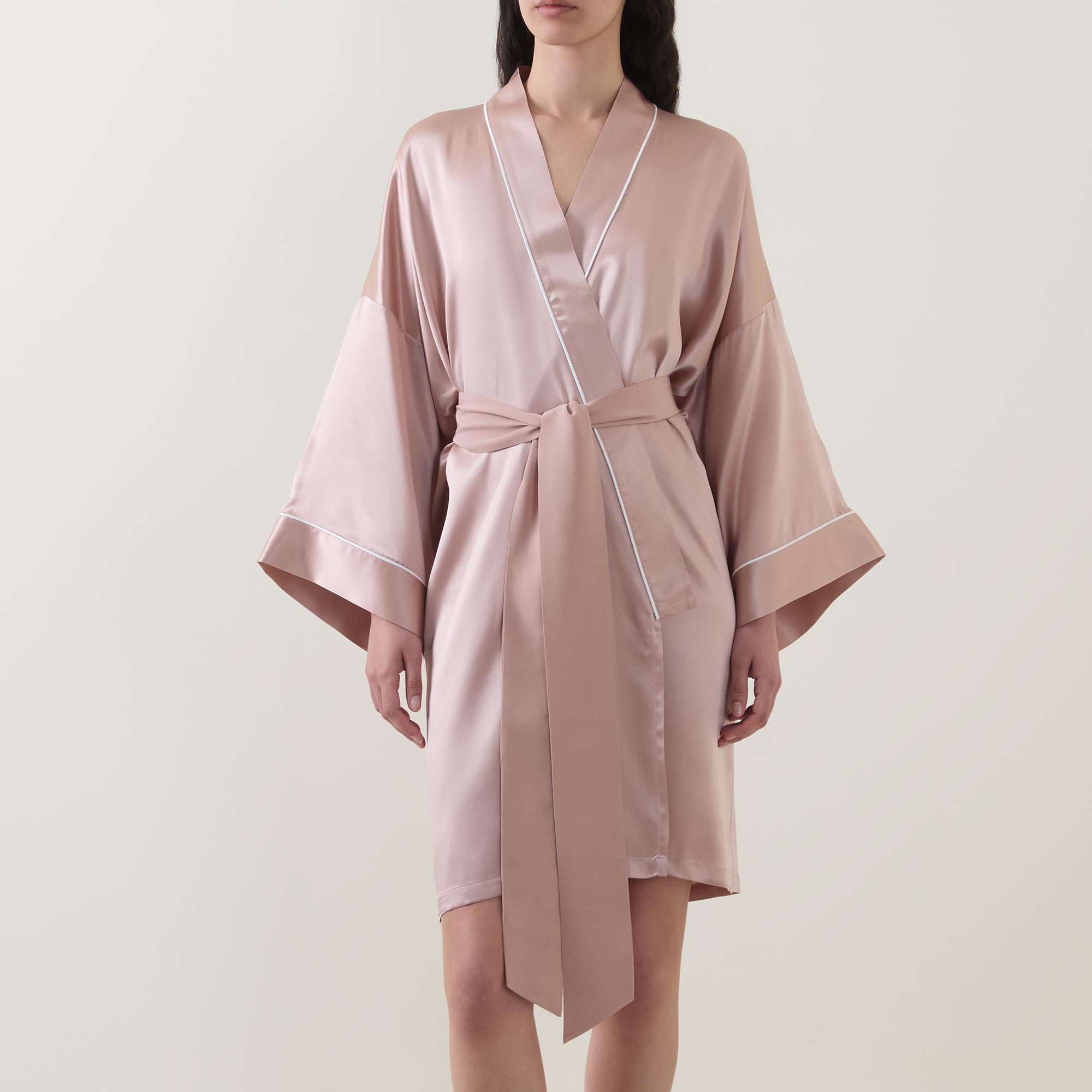 • Kimono sleeves, wrap front, tie belt, piped trims