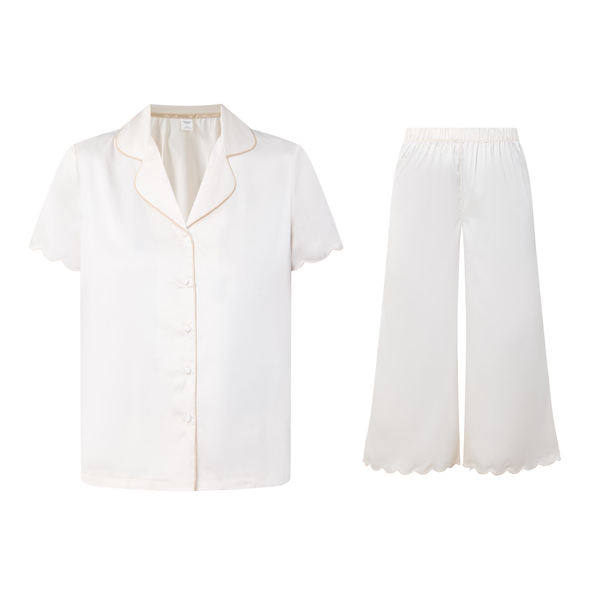 - Bottoms: Cropped length, elasticated waistband, rear patch pocket, scalloped edges, contrast piping details, smooth satin fabric