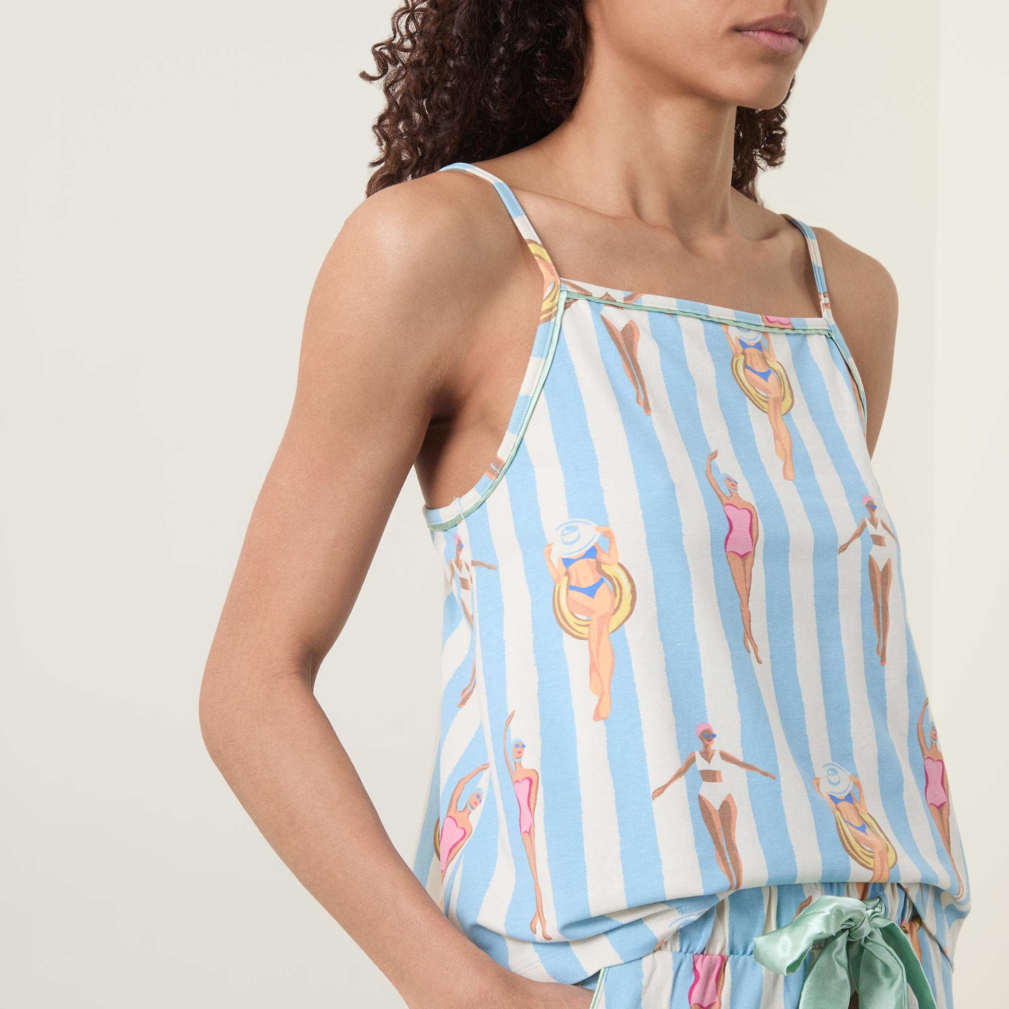 - Cami: Squared neckline, adjustable straps, straight hemline, tonal piping, swimming society and stripe print