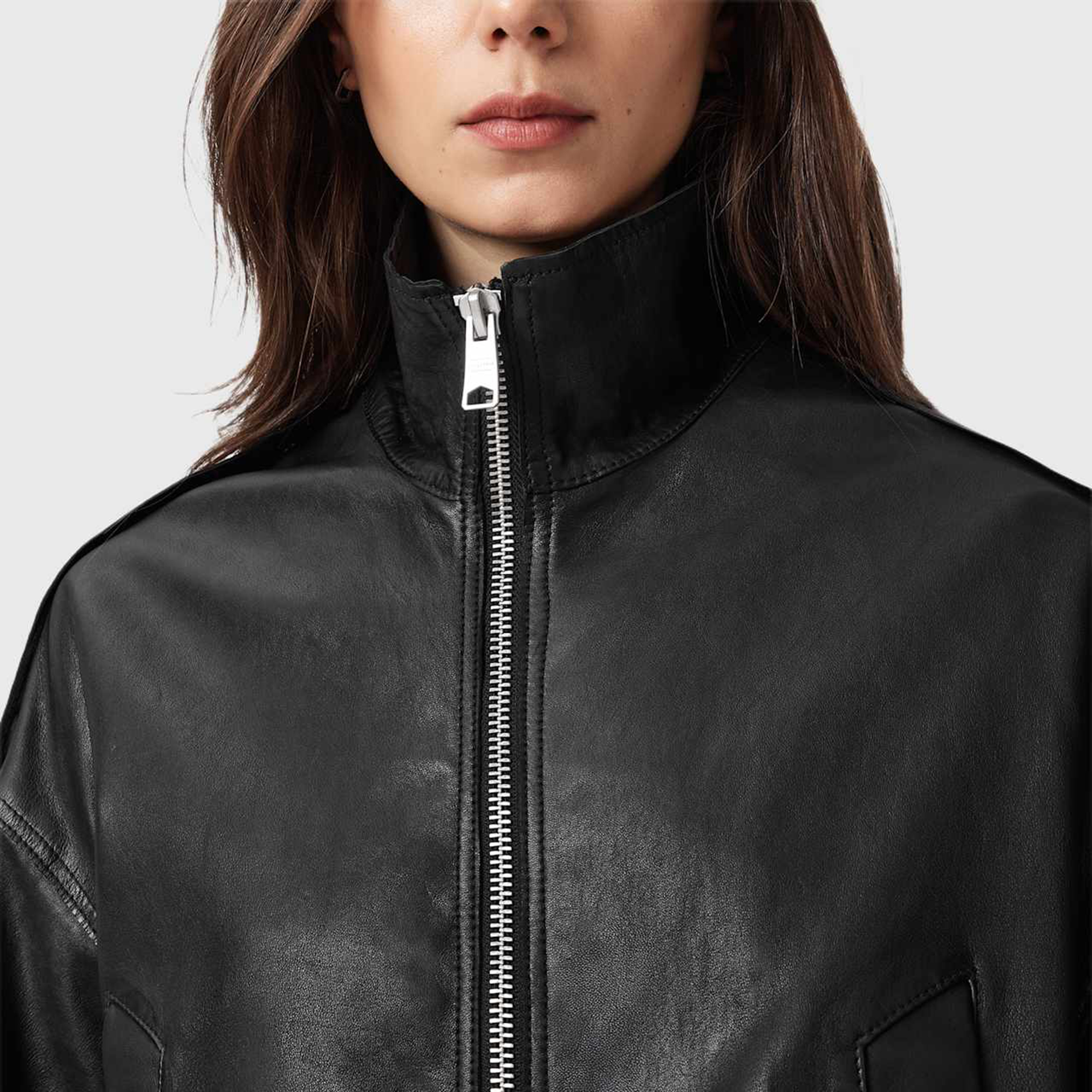 - Large epaulettes, popper details at the shoulders, front metal zip fastening, self leather puller, welt pockets