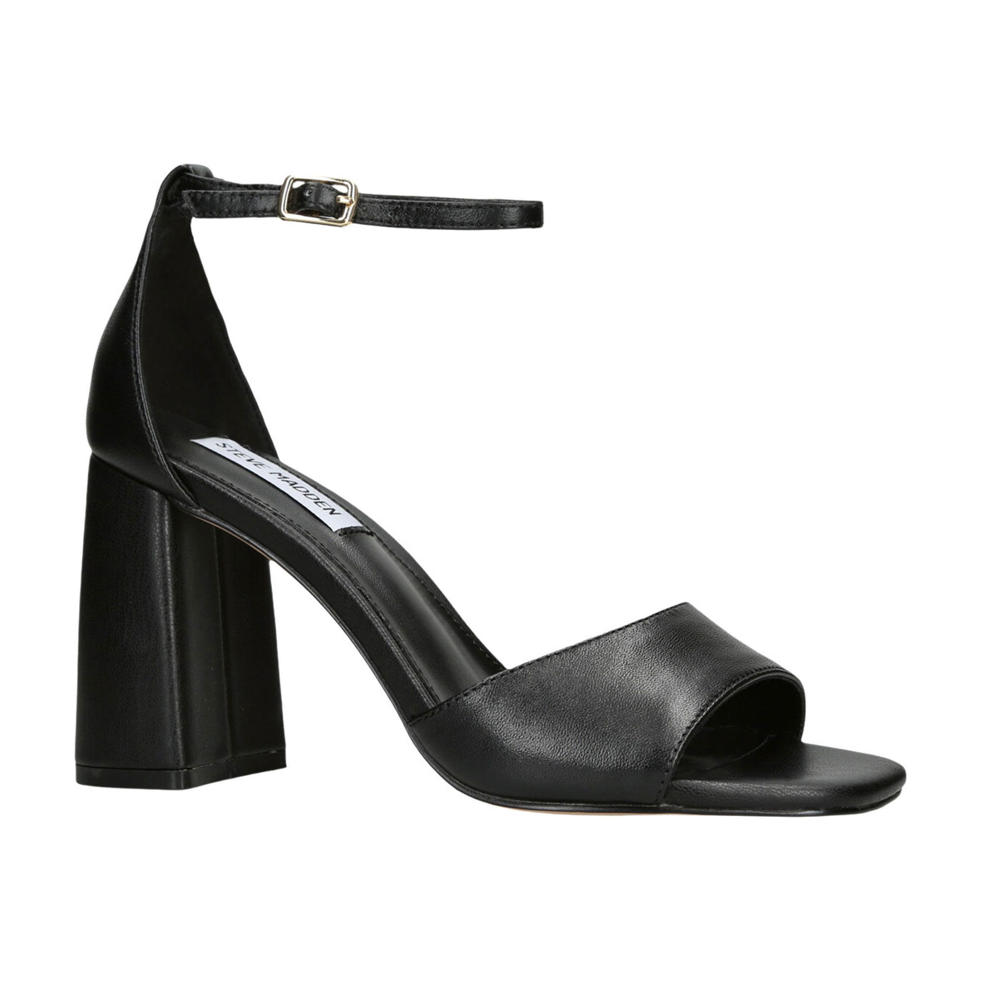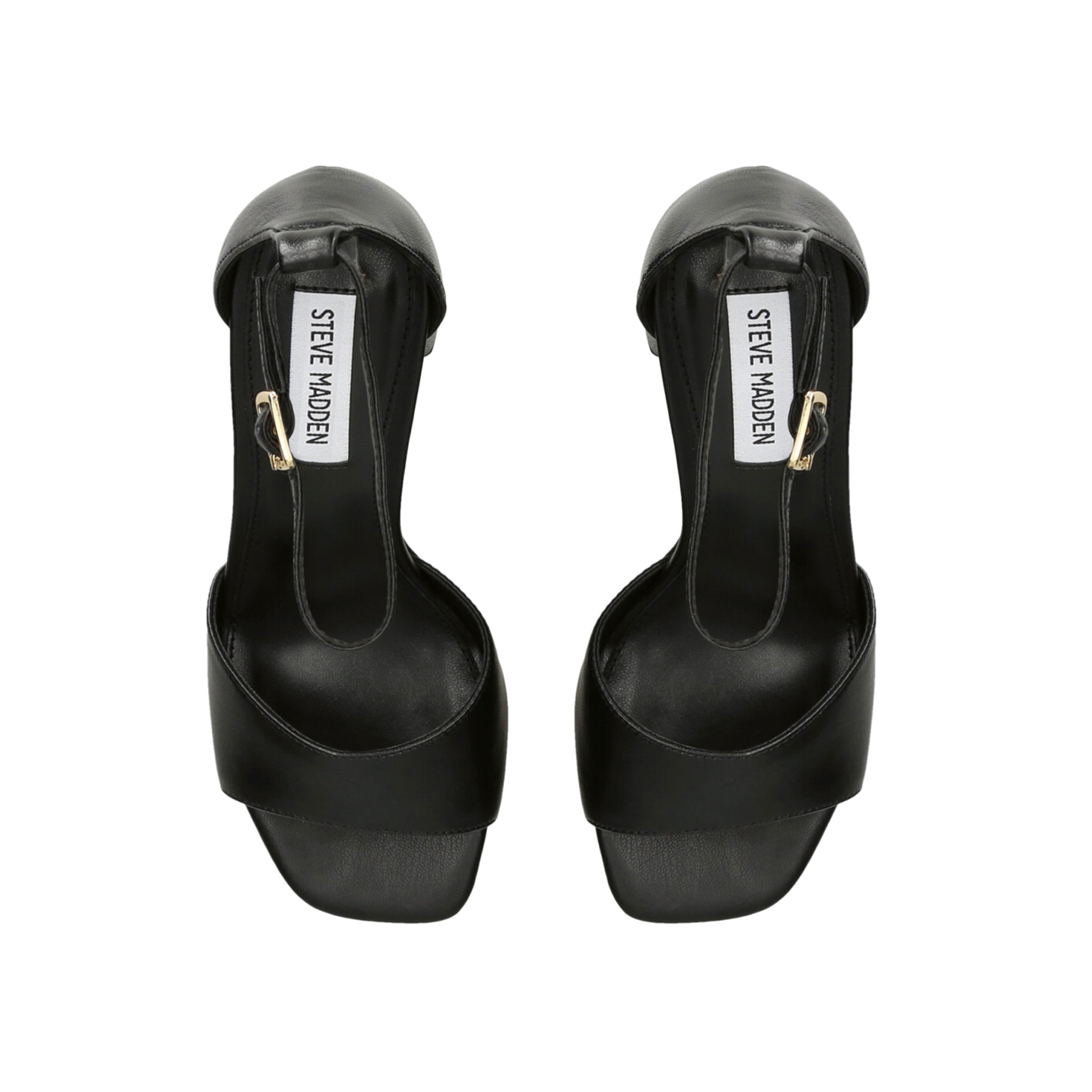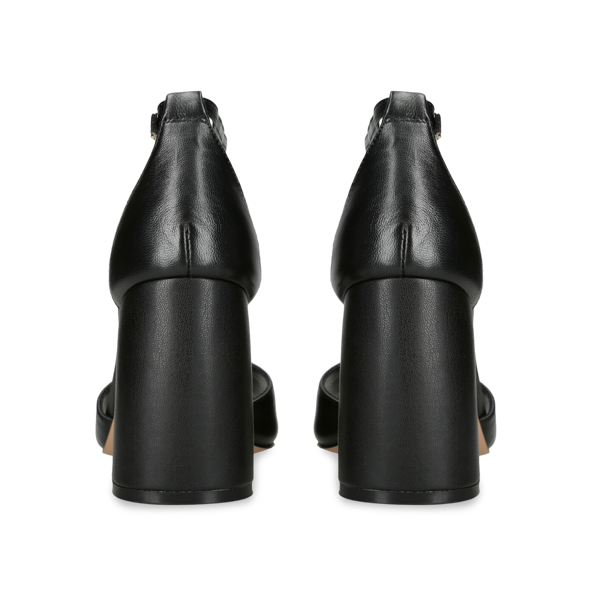 - Block heel, smooth leather, PU lining, ankle strap, buckle fastening
