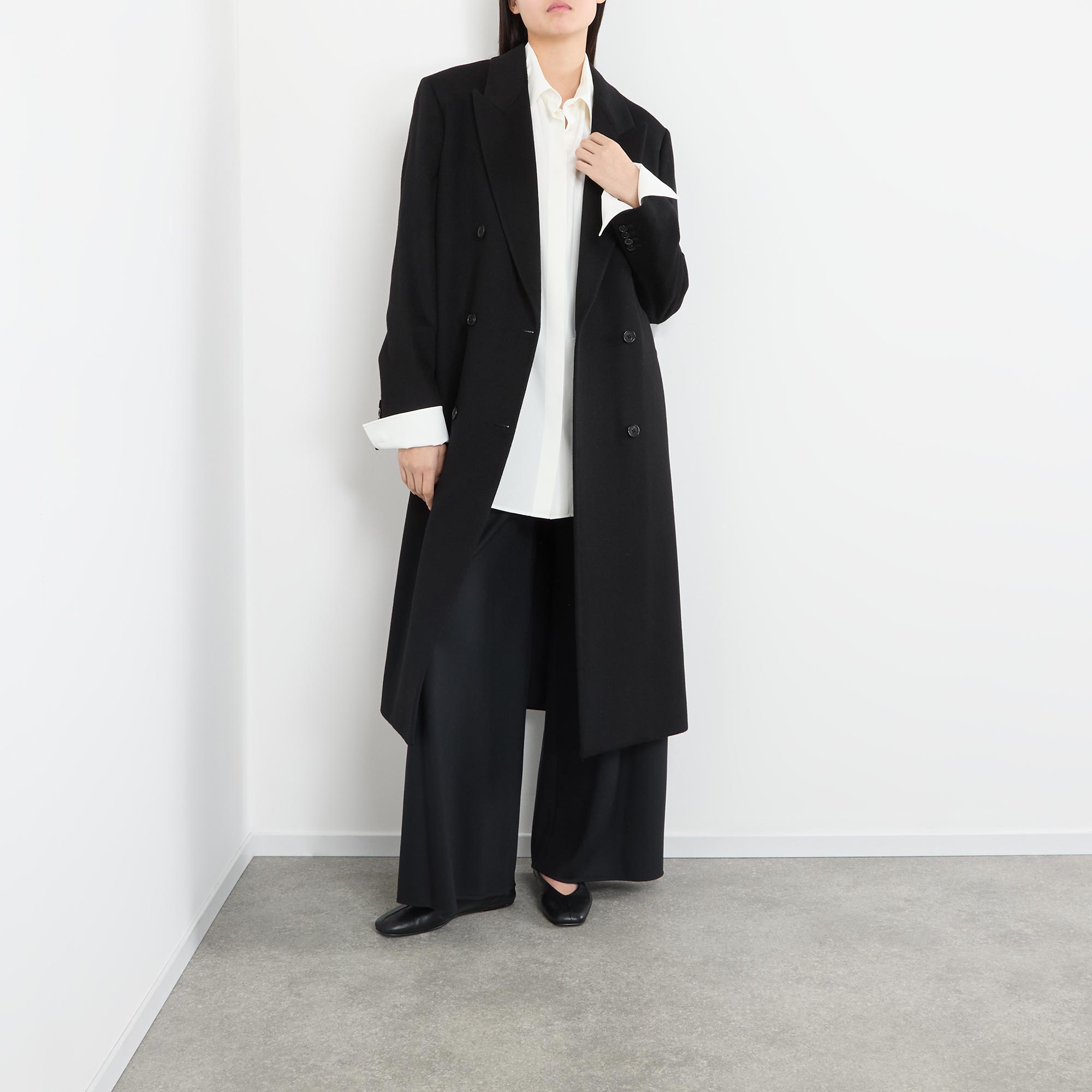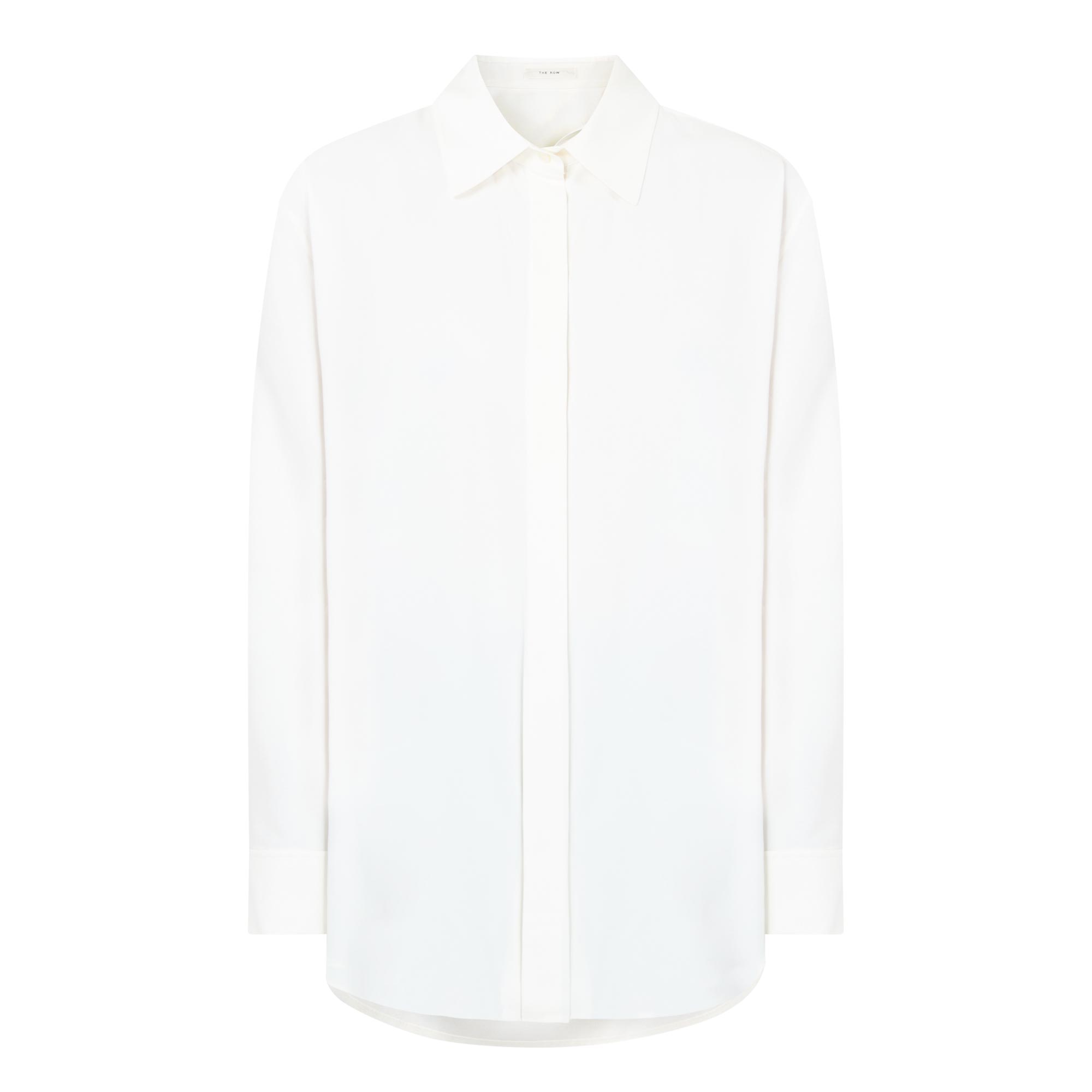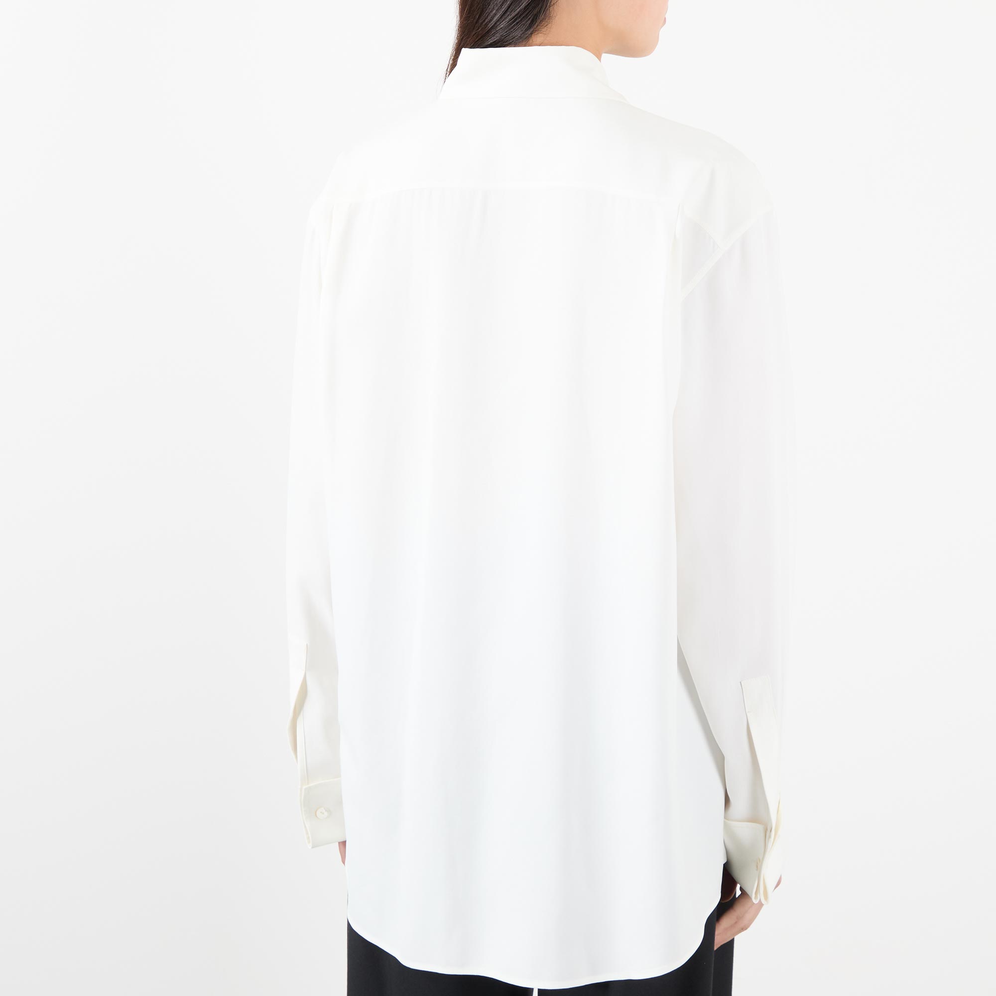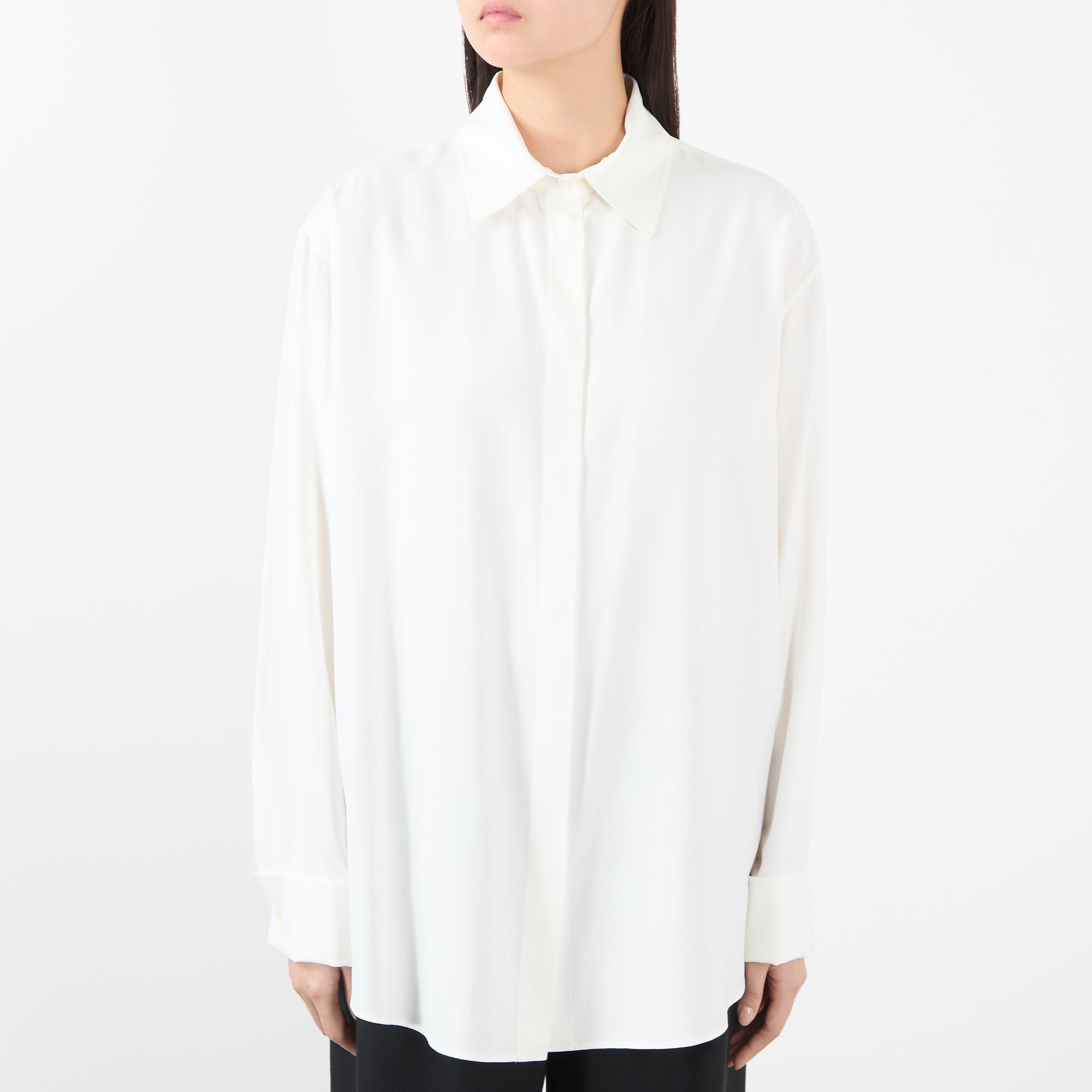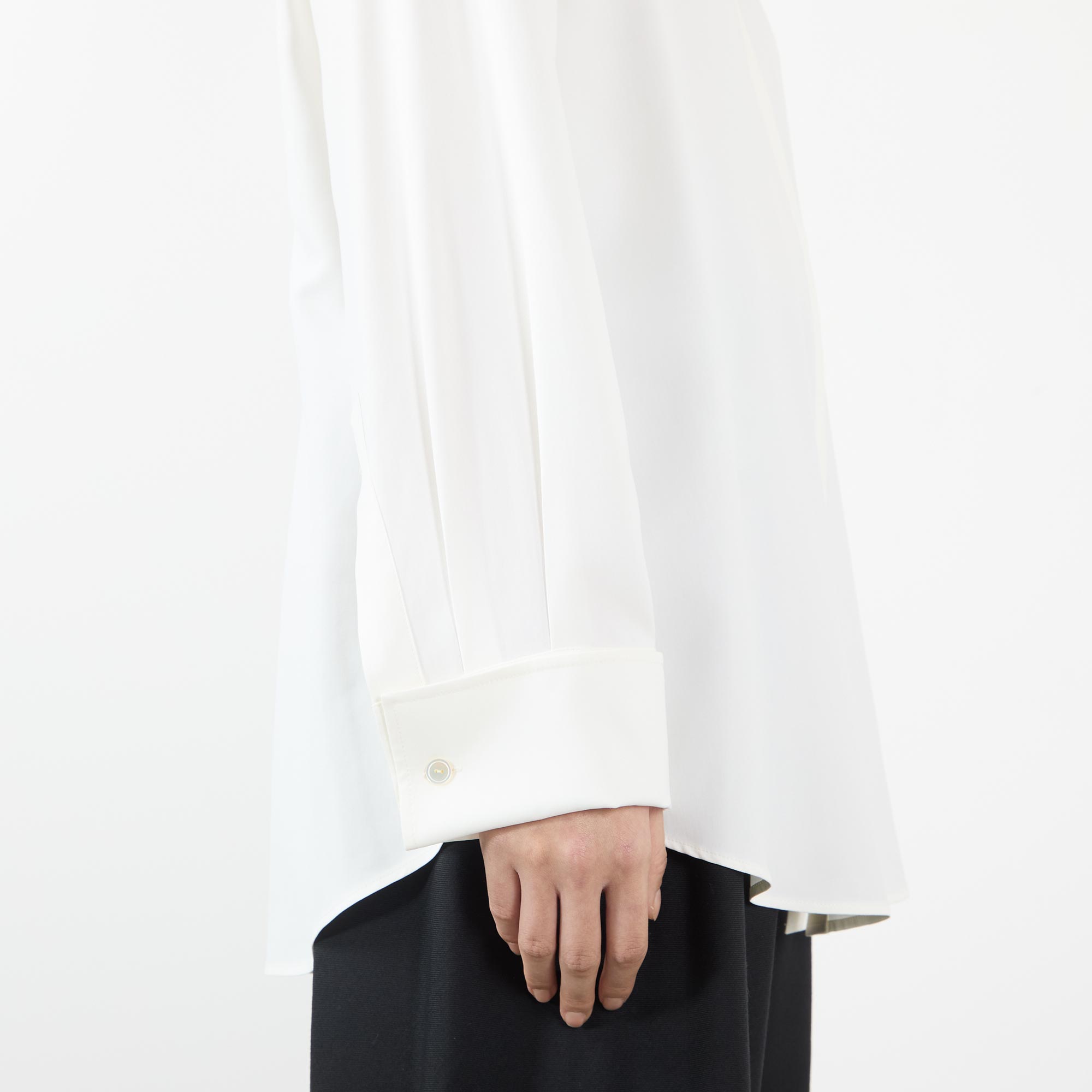 - Point collar, long sleeves, dropped shoulders, concealed button placket, single-button cuffs, draping, tonal stitching, curved hemline, smooth silk finish