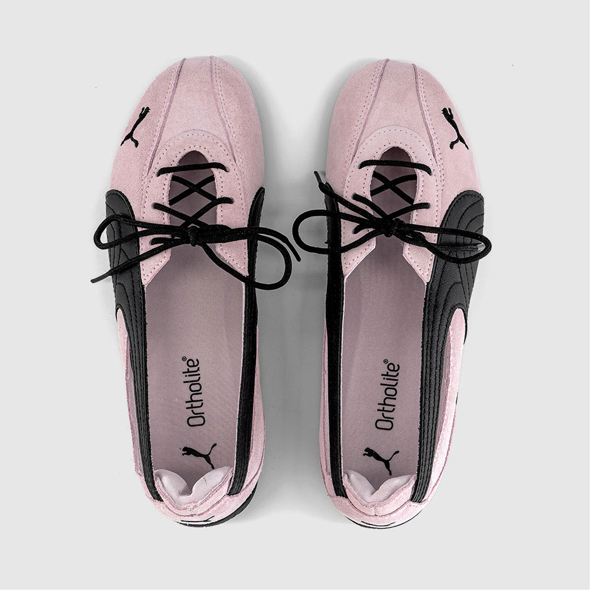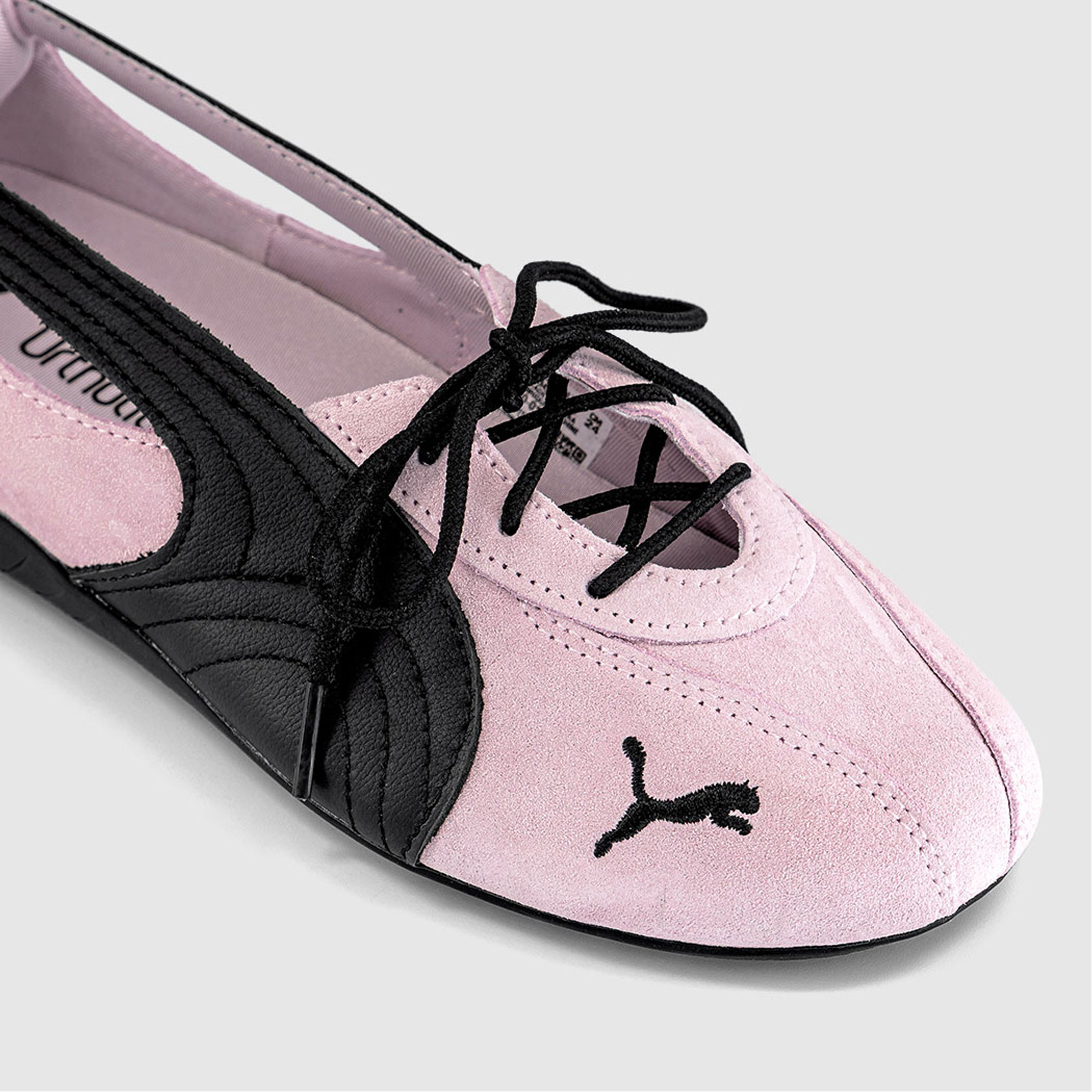 - Ballet slipper silhouette, suede finish, contrast leather detailing, lace‑up design, cut‑out side panels, signature Formstrip