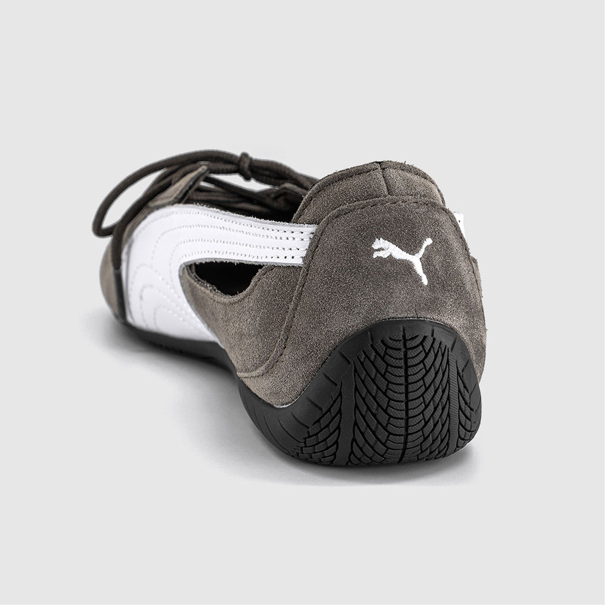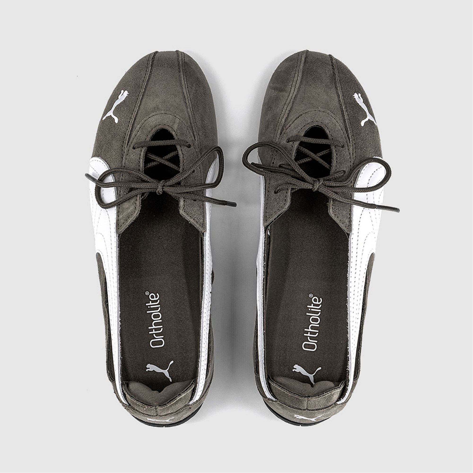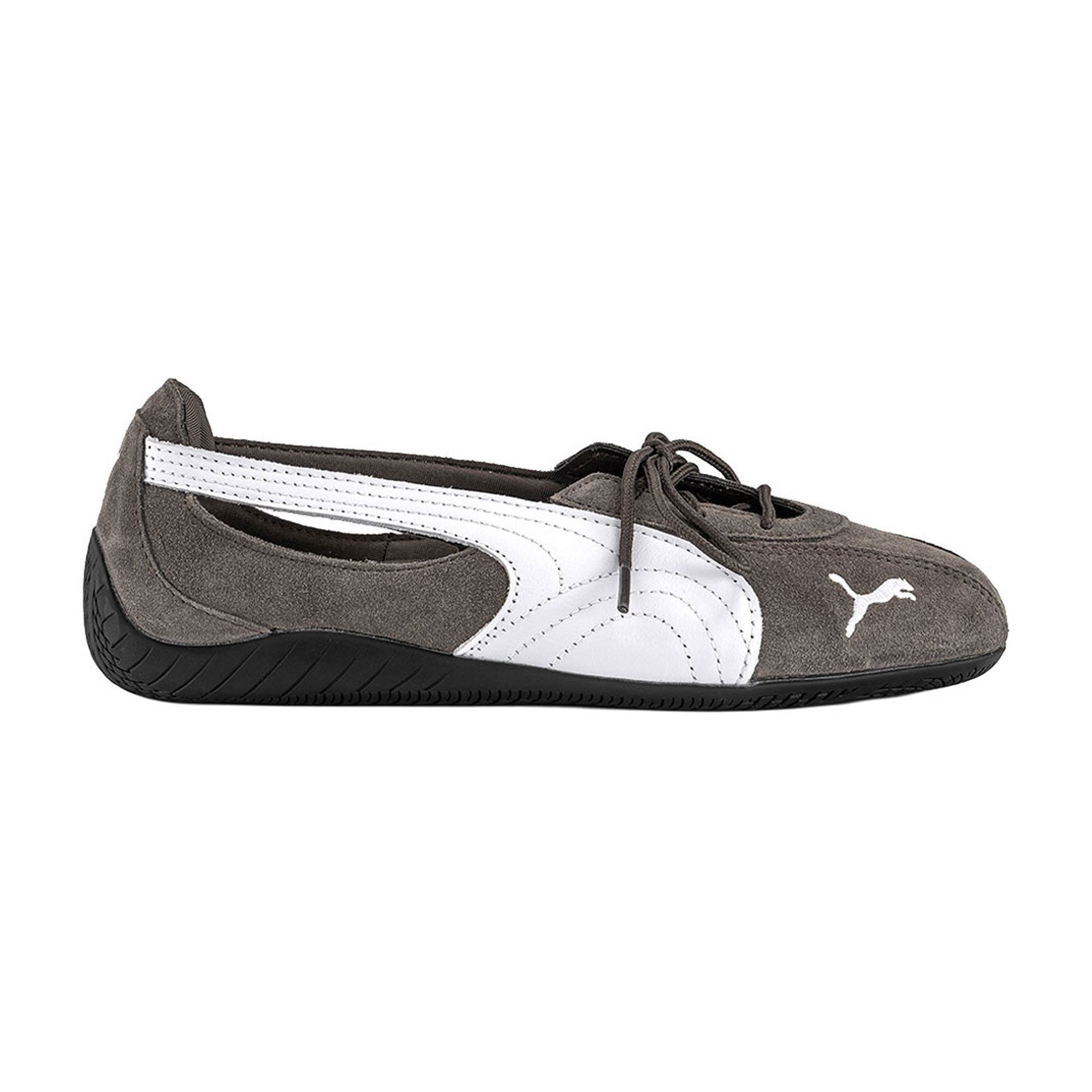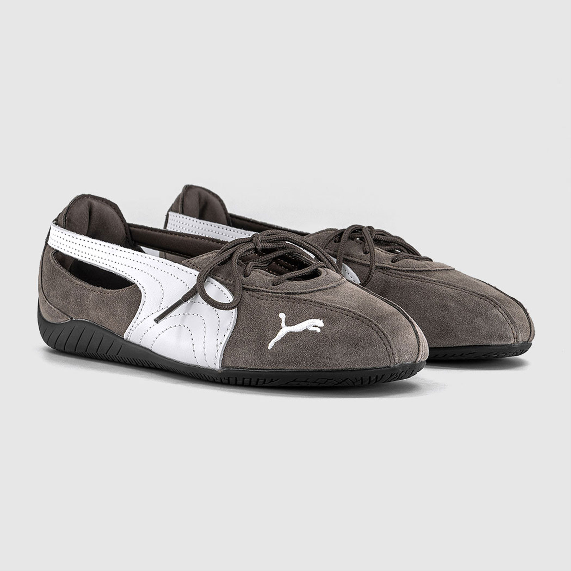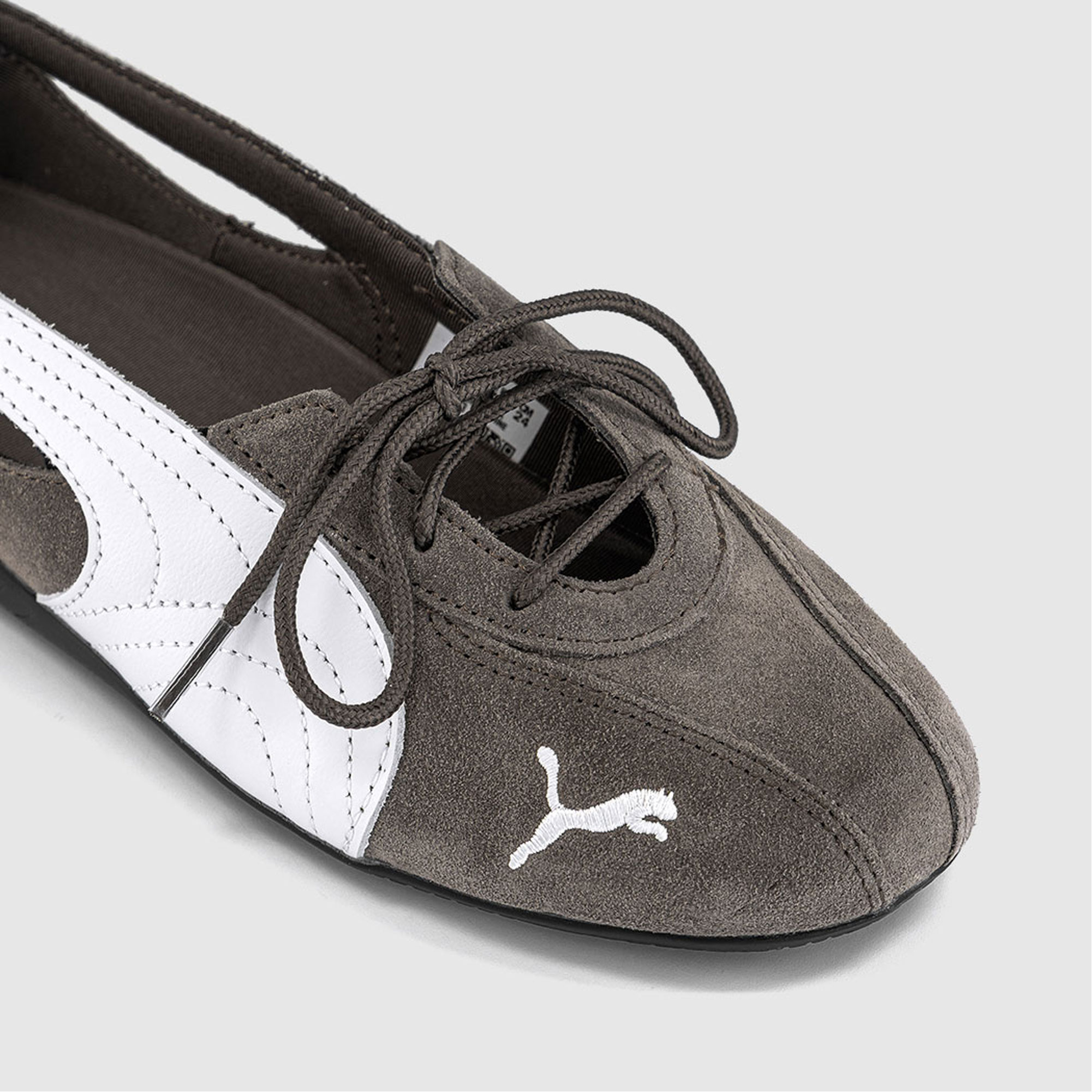 - Ballet slipper silhouette, suede finish, contrast leather detailing, lace‑up design, cut‑out side panels, signature Formstrip