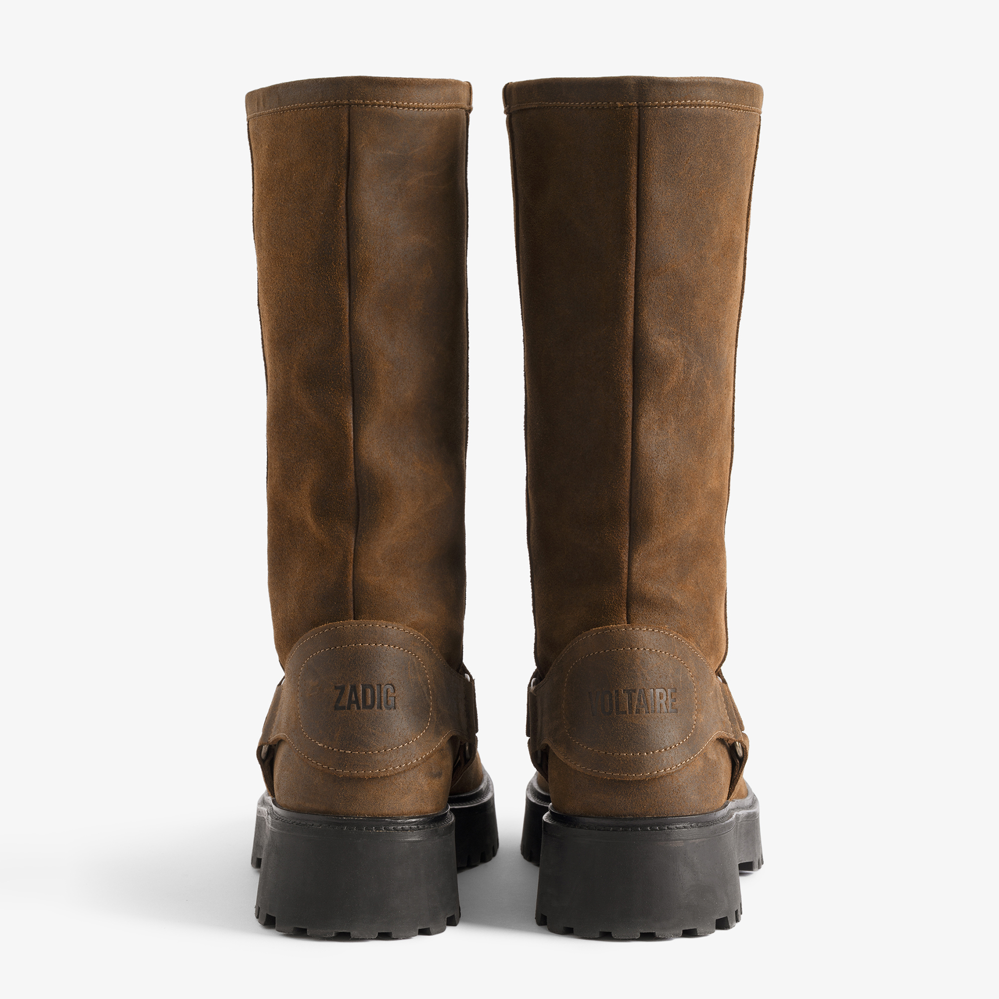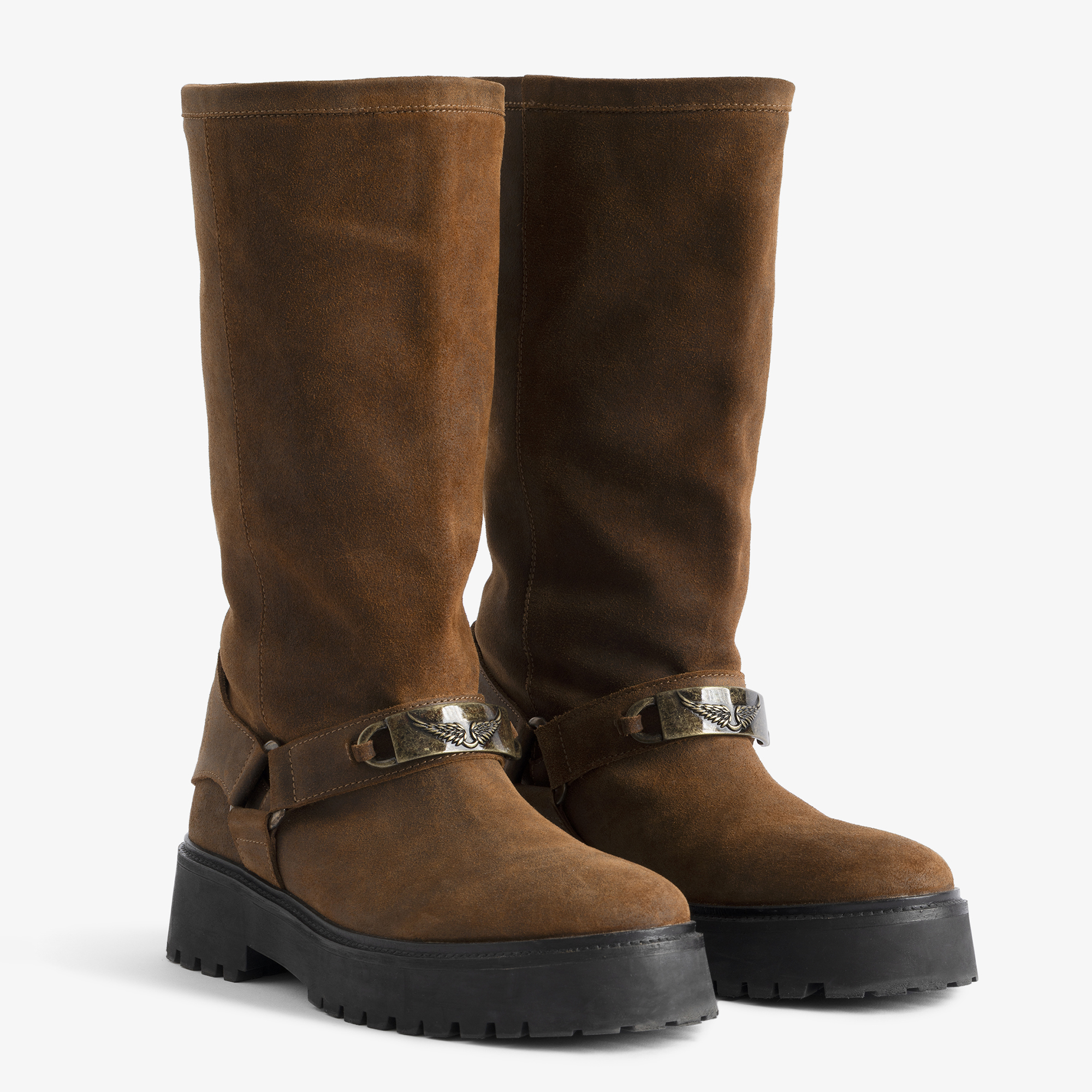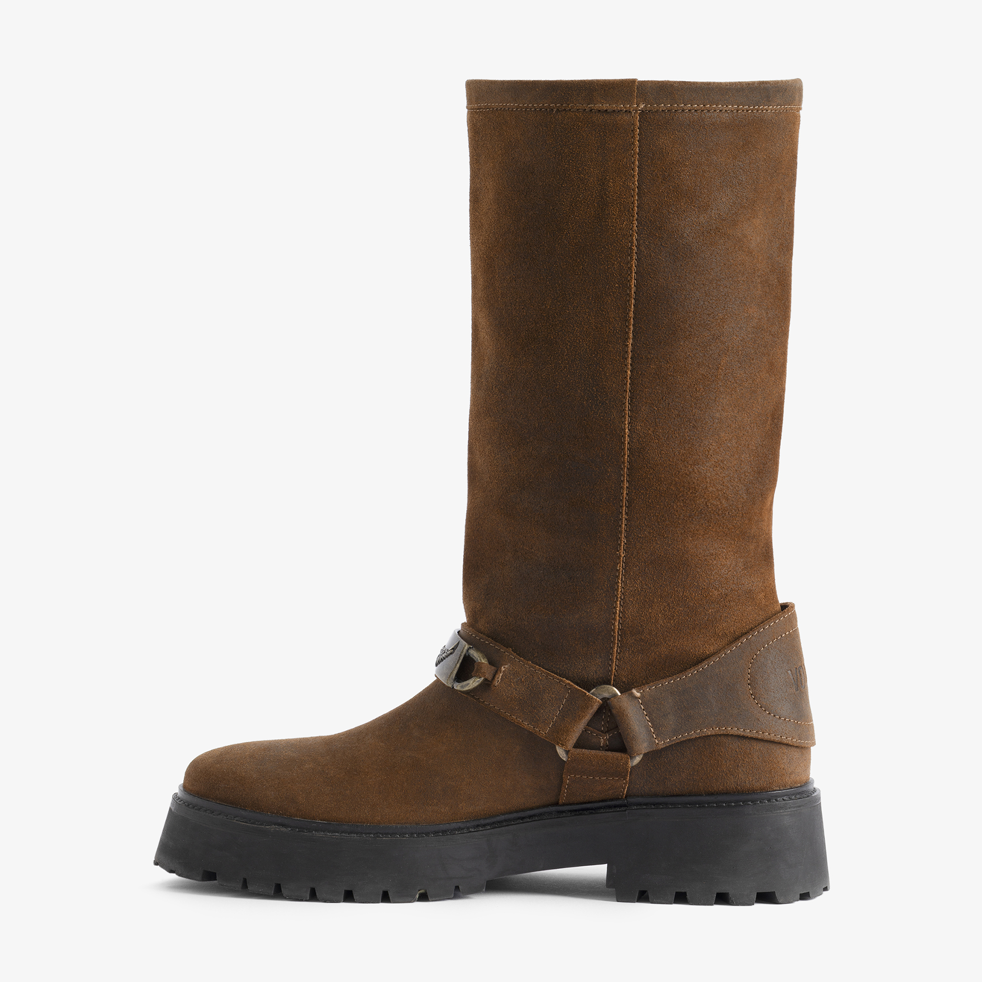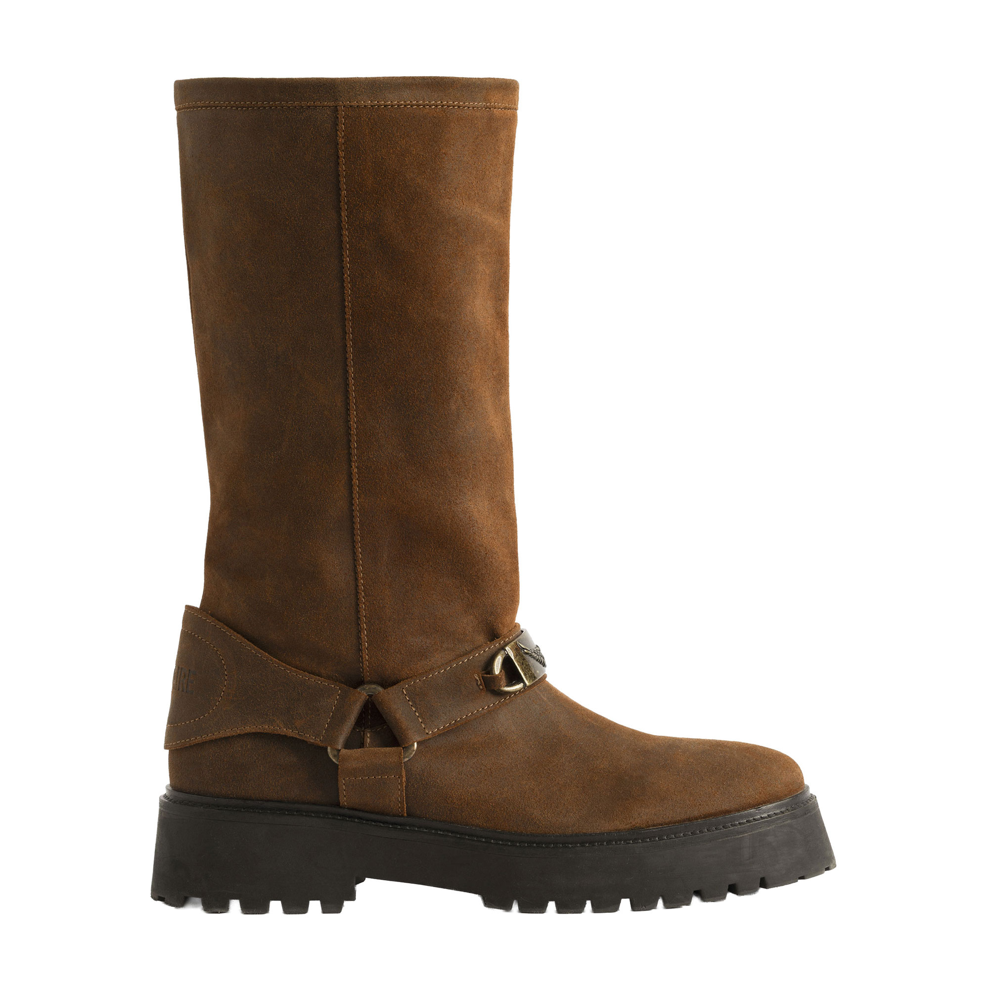 • Biker-inspired boots, suede leather, harness with curb chain plate