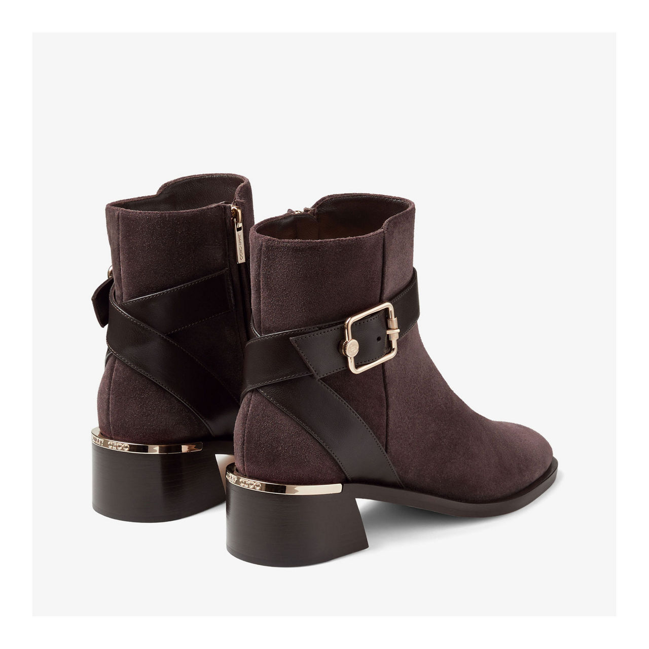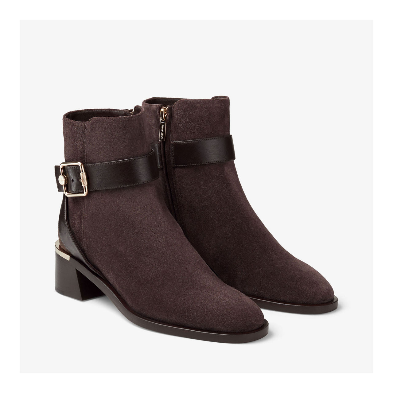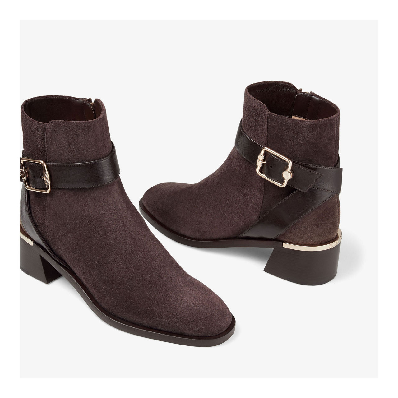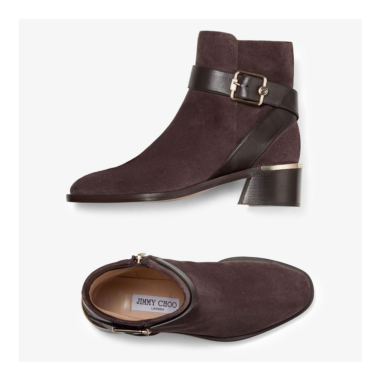 - Ankle length, crosta suede finish with nappa leather straps, equestrian-style boots, block heels, stirrup-like strapping, Jimmy Choo branding on the back counter, curved plaque, internal zip, almond toe, leather sole