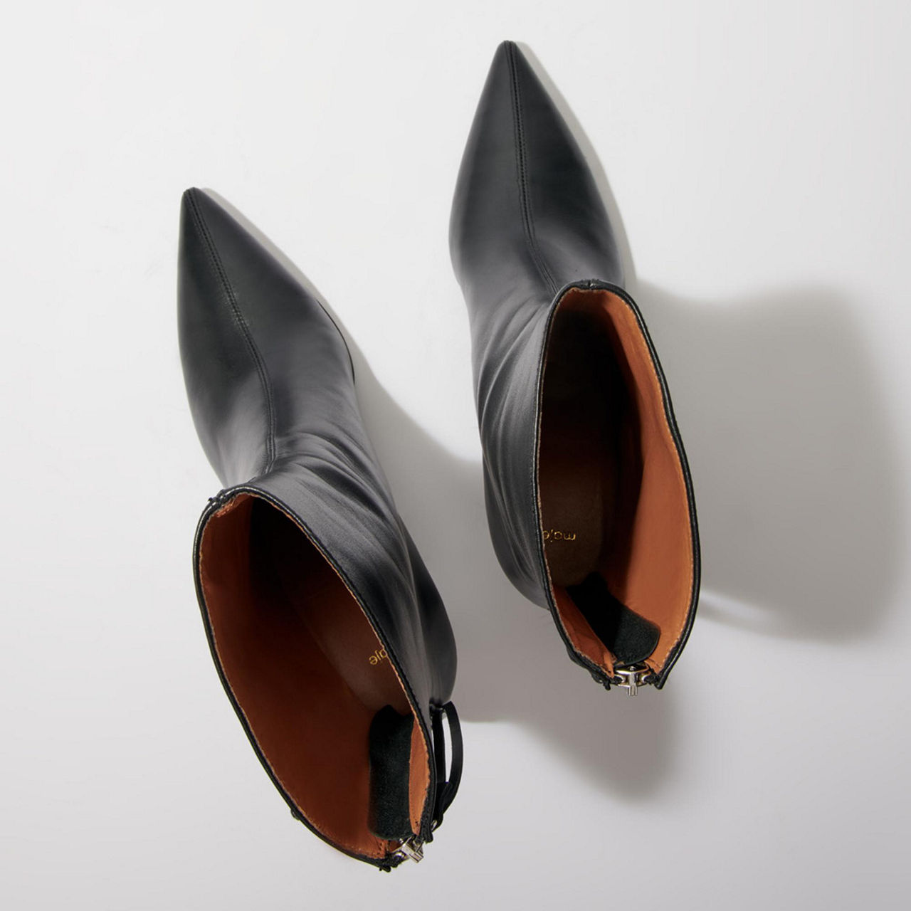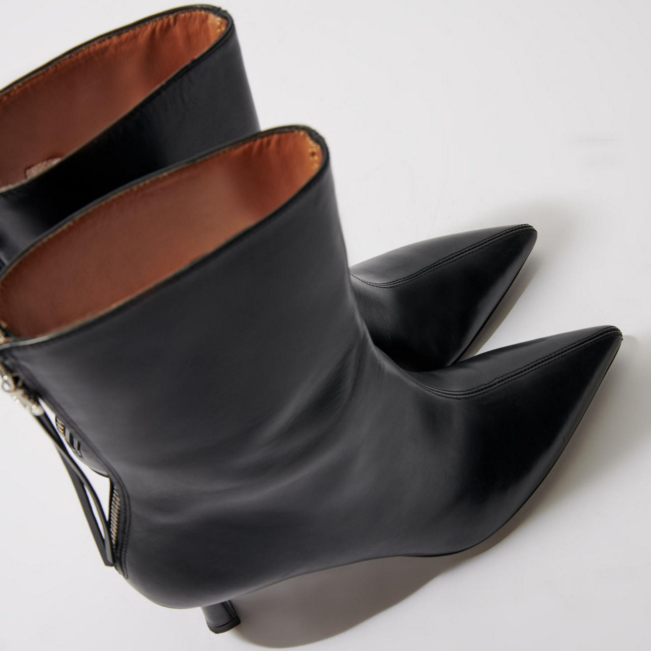 - Pointed toe, ankle length, back zip with pull, kitten heel