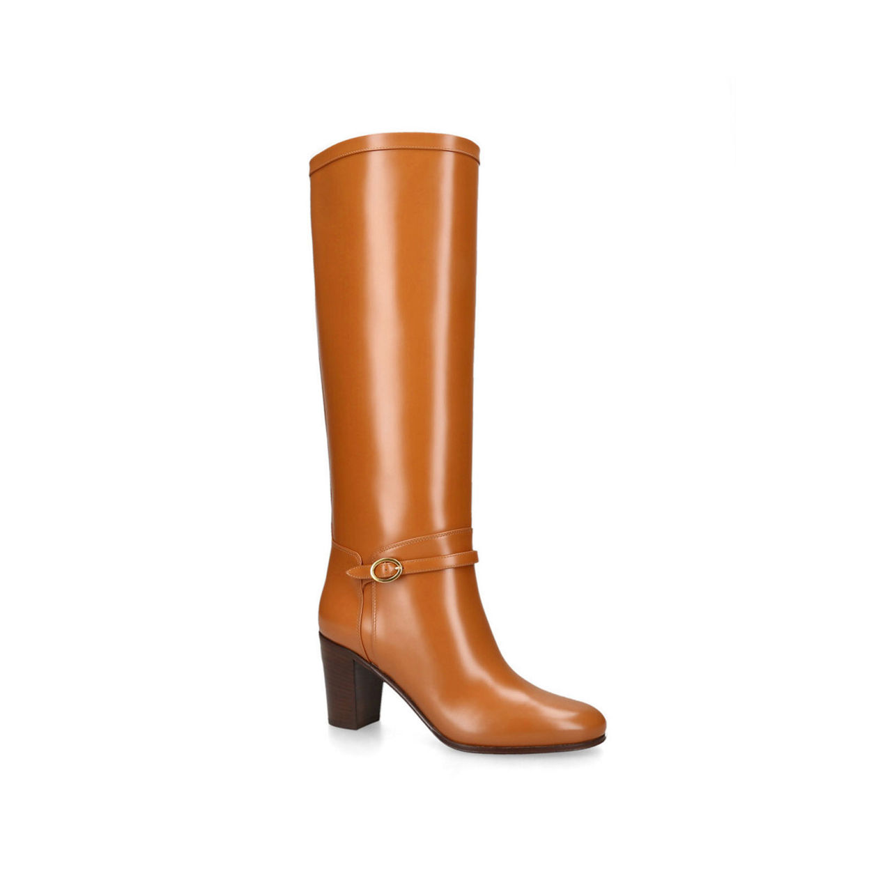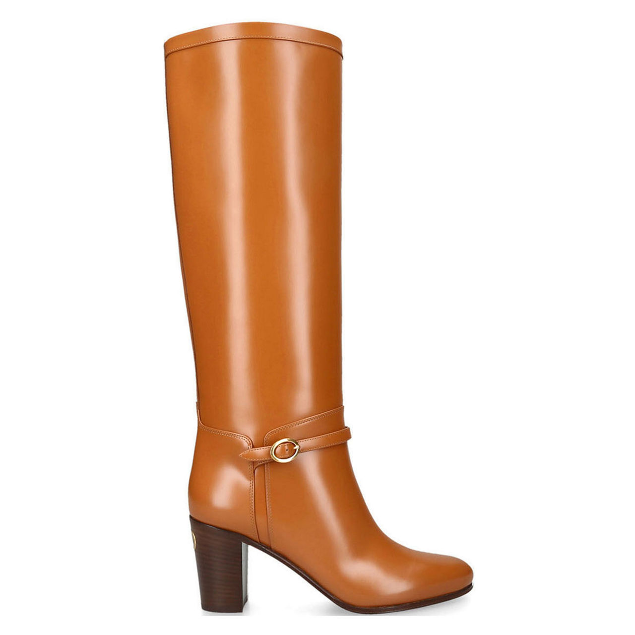 • Almond-shape toe, block heel, pull-on style, knee high, strap and buckle detail, glossy finish, logo hardware at back