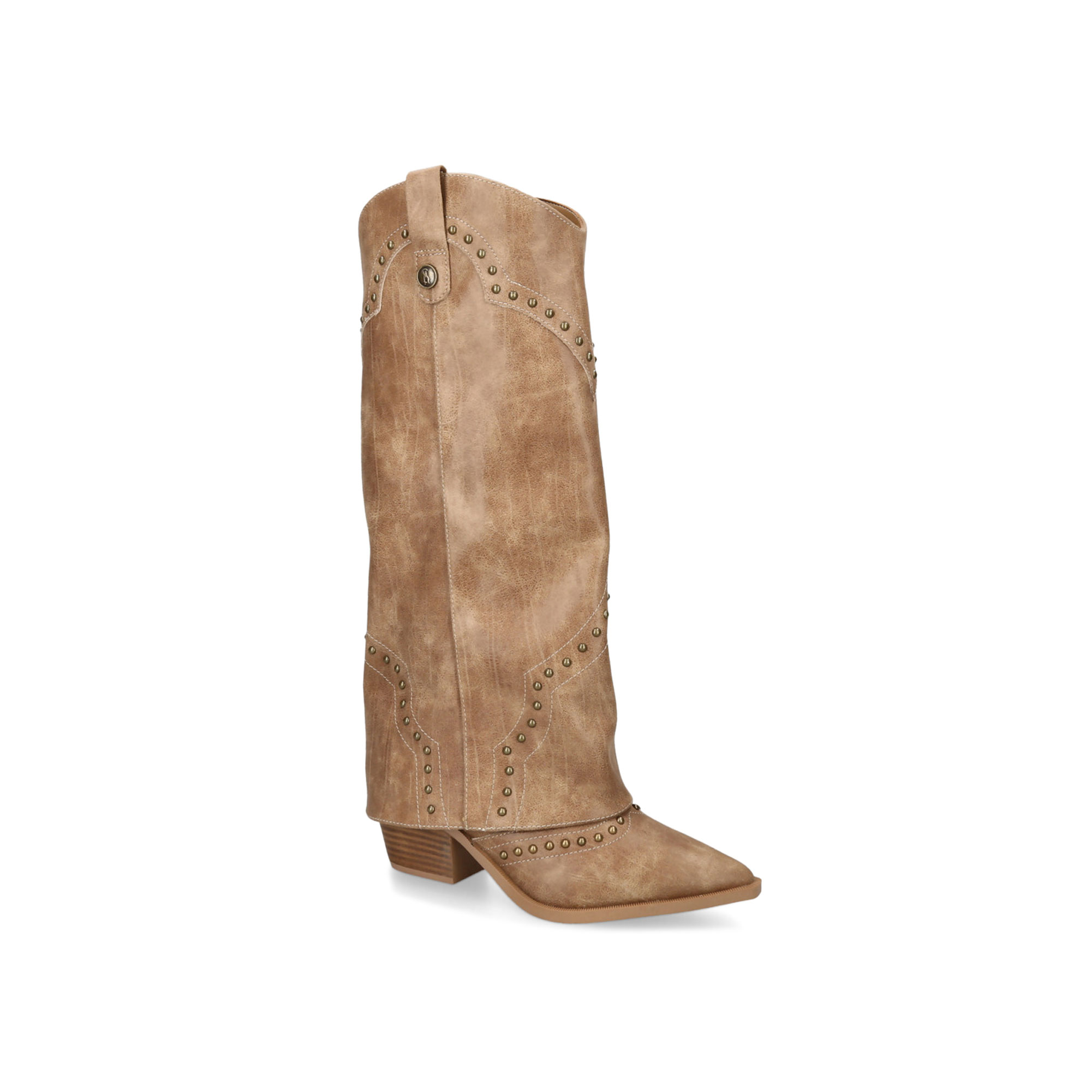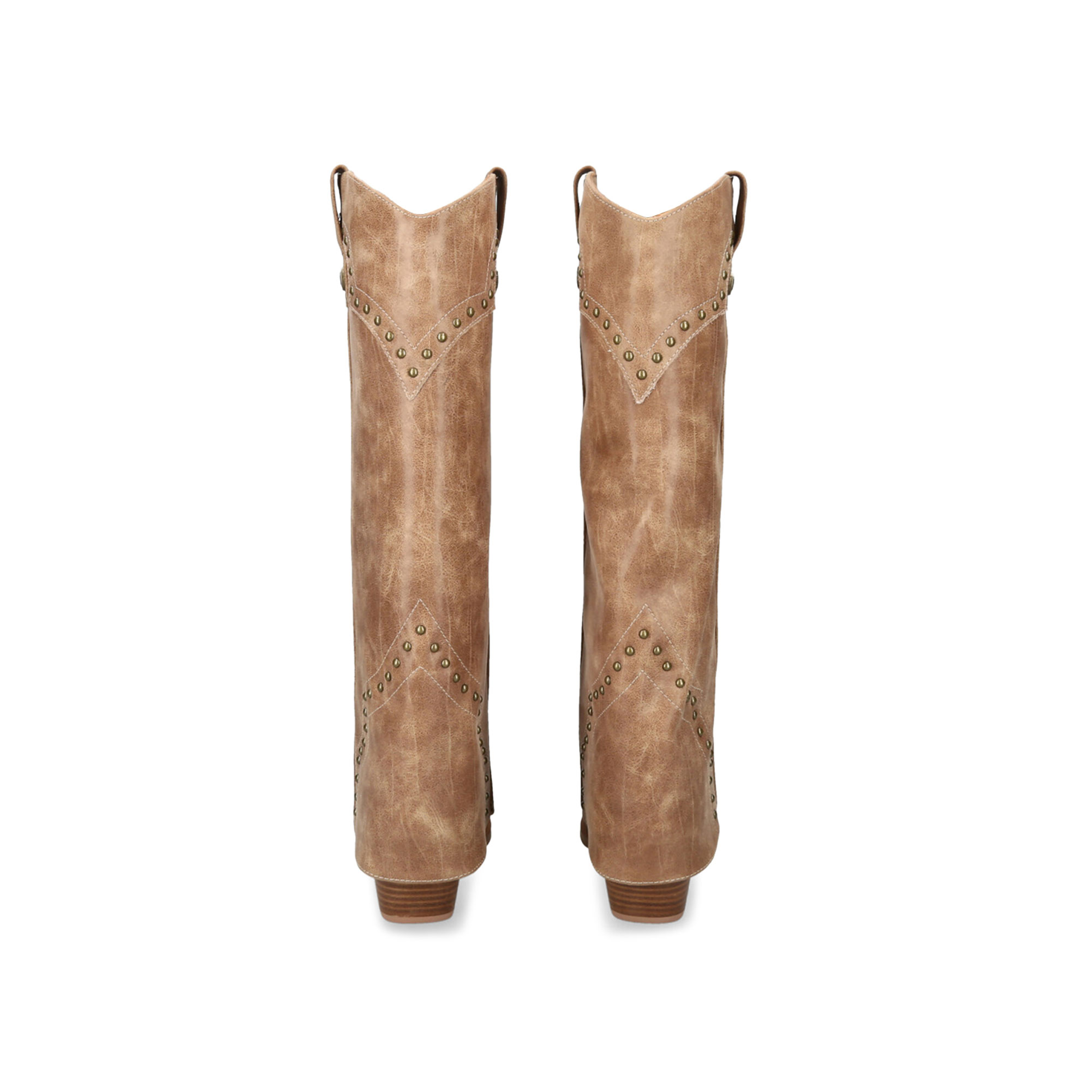 - Knee-high, low block heel, detailed with stud embellishments that trace the contours of the shaft and toe