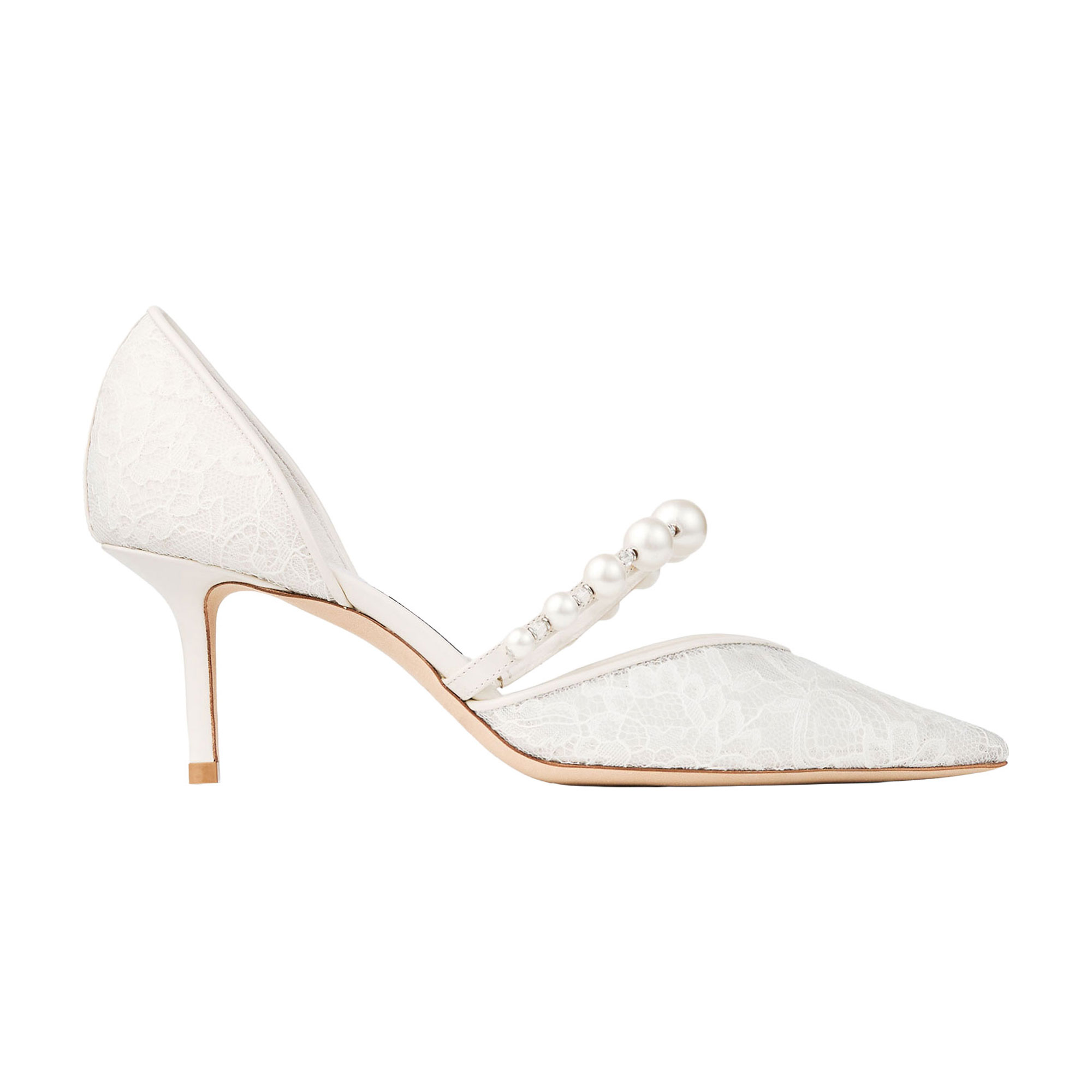 - Lace detailing, pointed toe, pearl embellishment, crystal embellishments