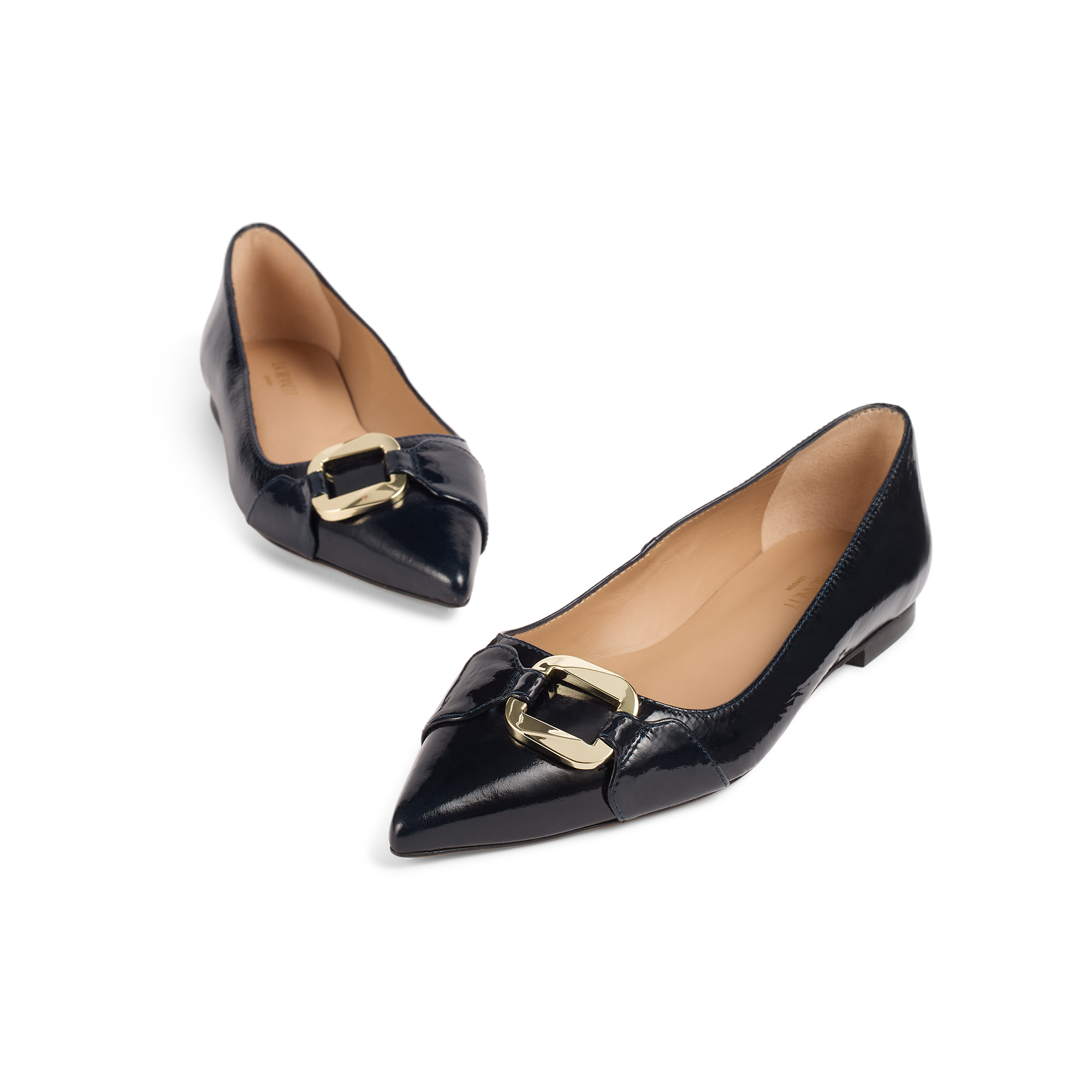 - Pointed toe, flat sole, crinkled patent leather