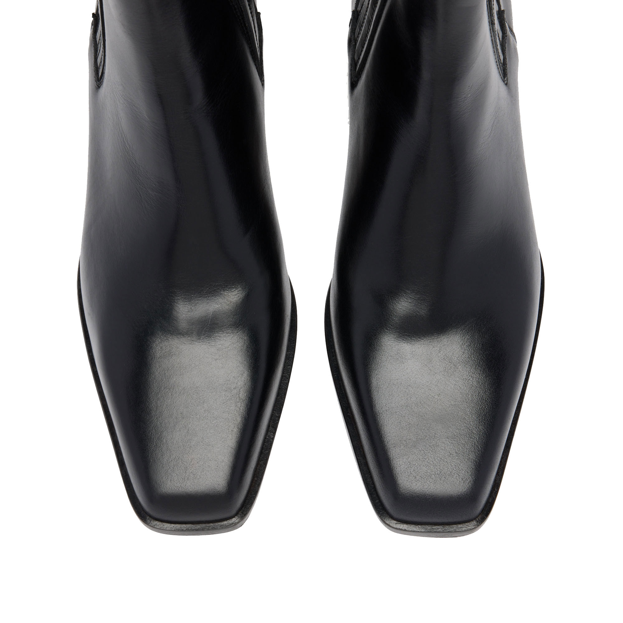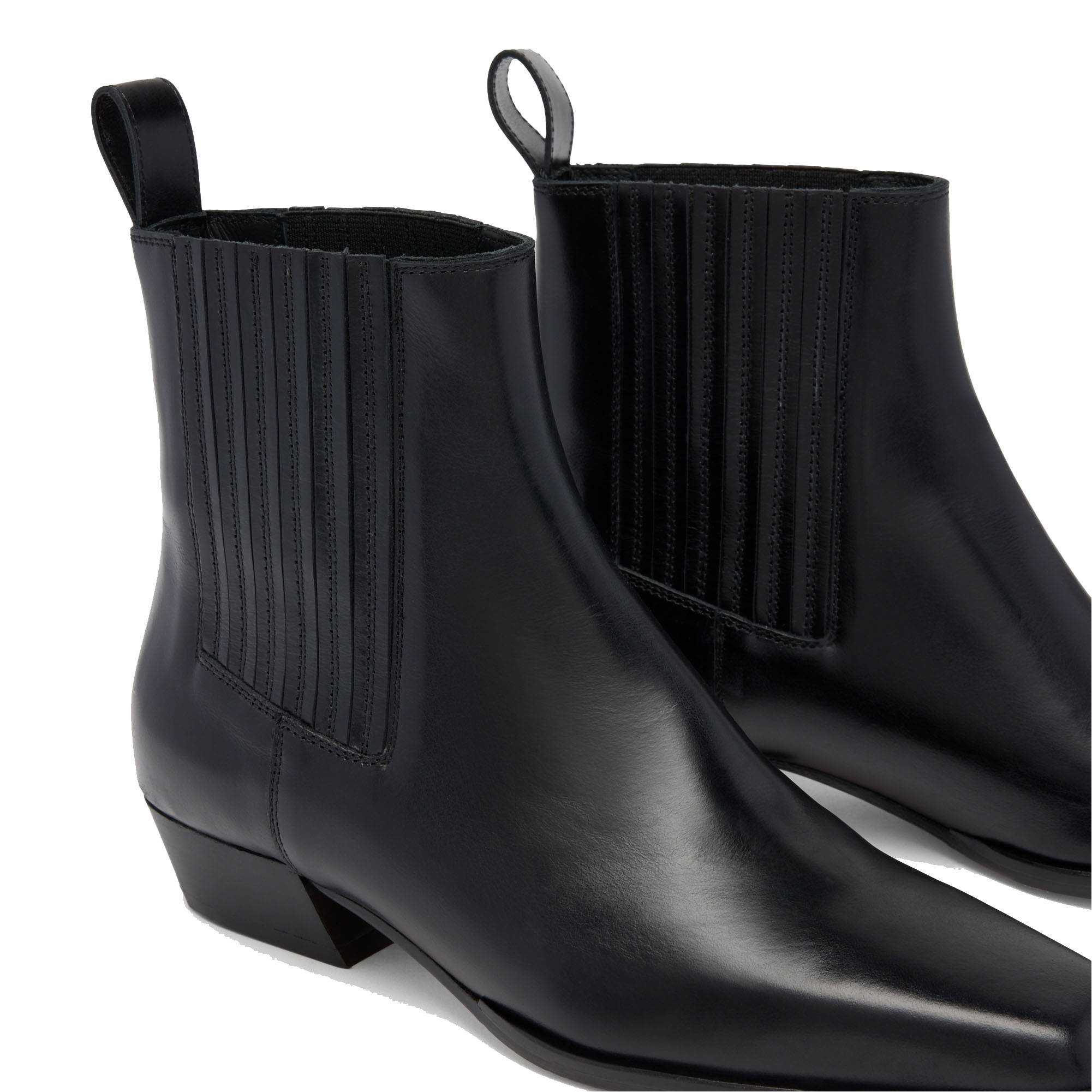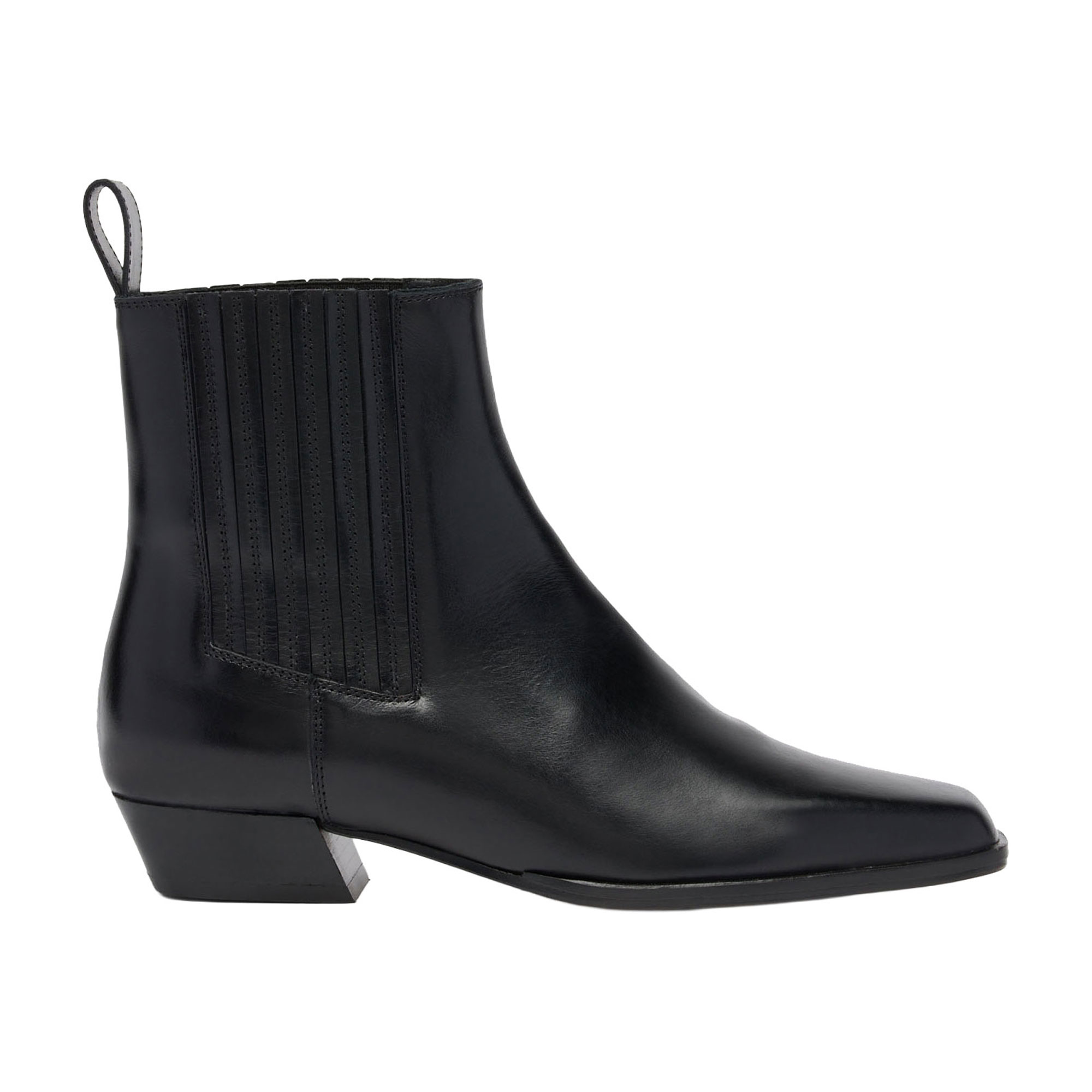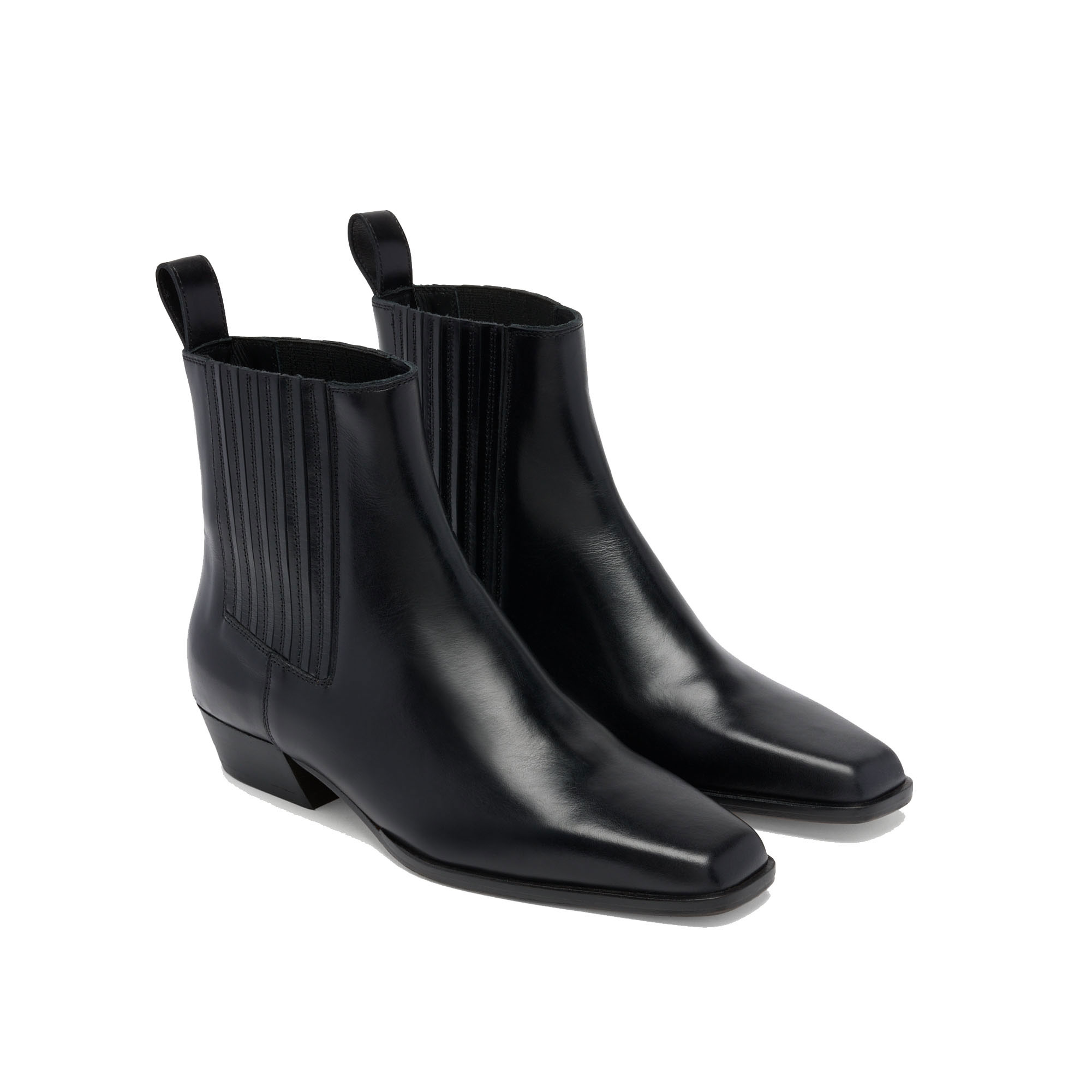 - Modern classic, subtle Western nod, soft square toe, sculpted silhouette, leather-covered gusset, tonal pull tab, low heel
