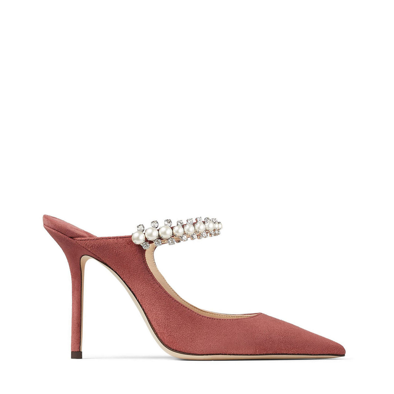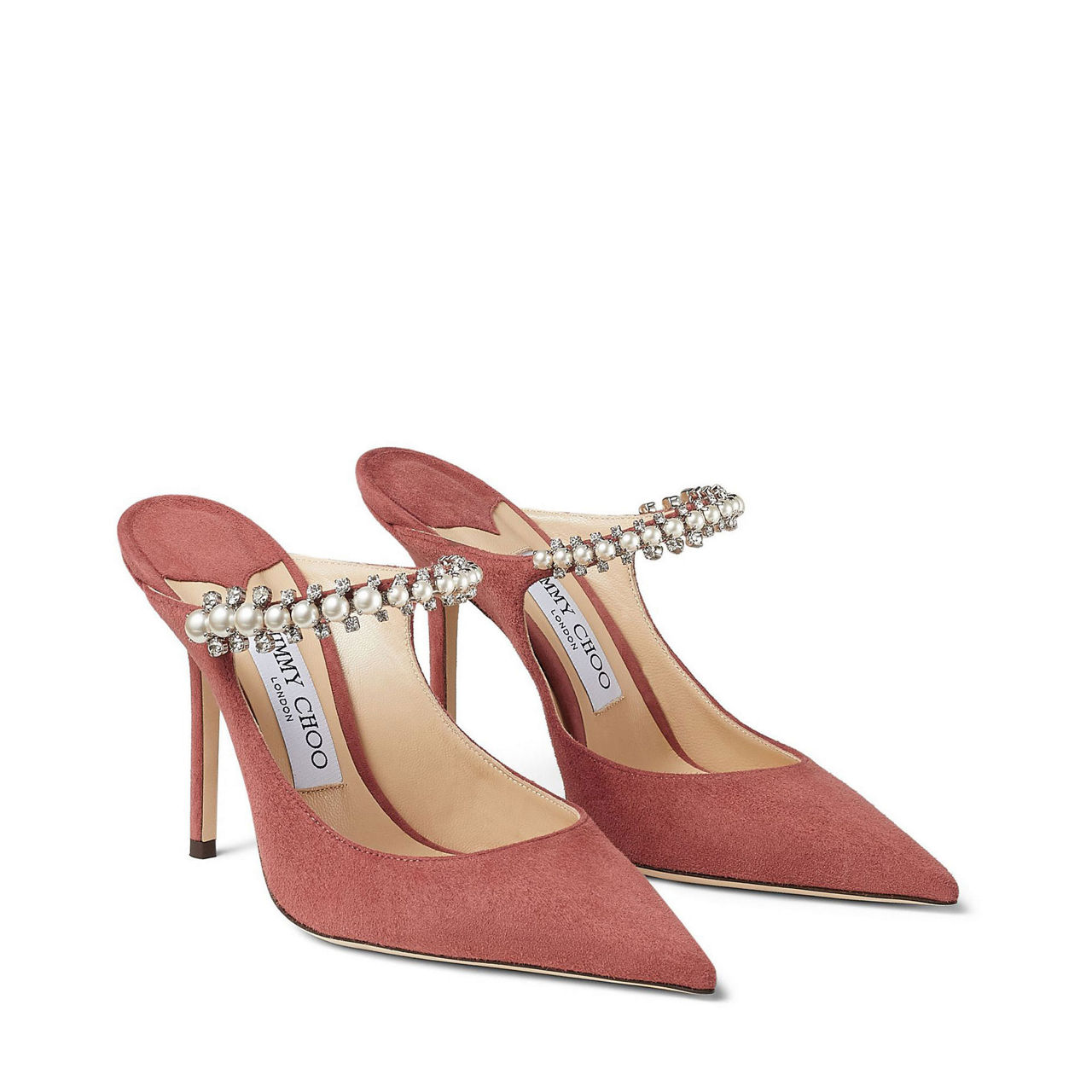 Smooth suede meets pearl and crystal embellishment in these leather mules from Jimmy Choo, crafting a sleek stiletto style with drama and modernity.