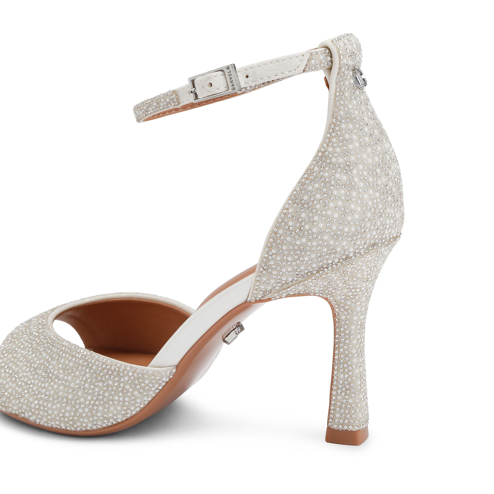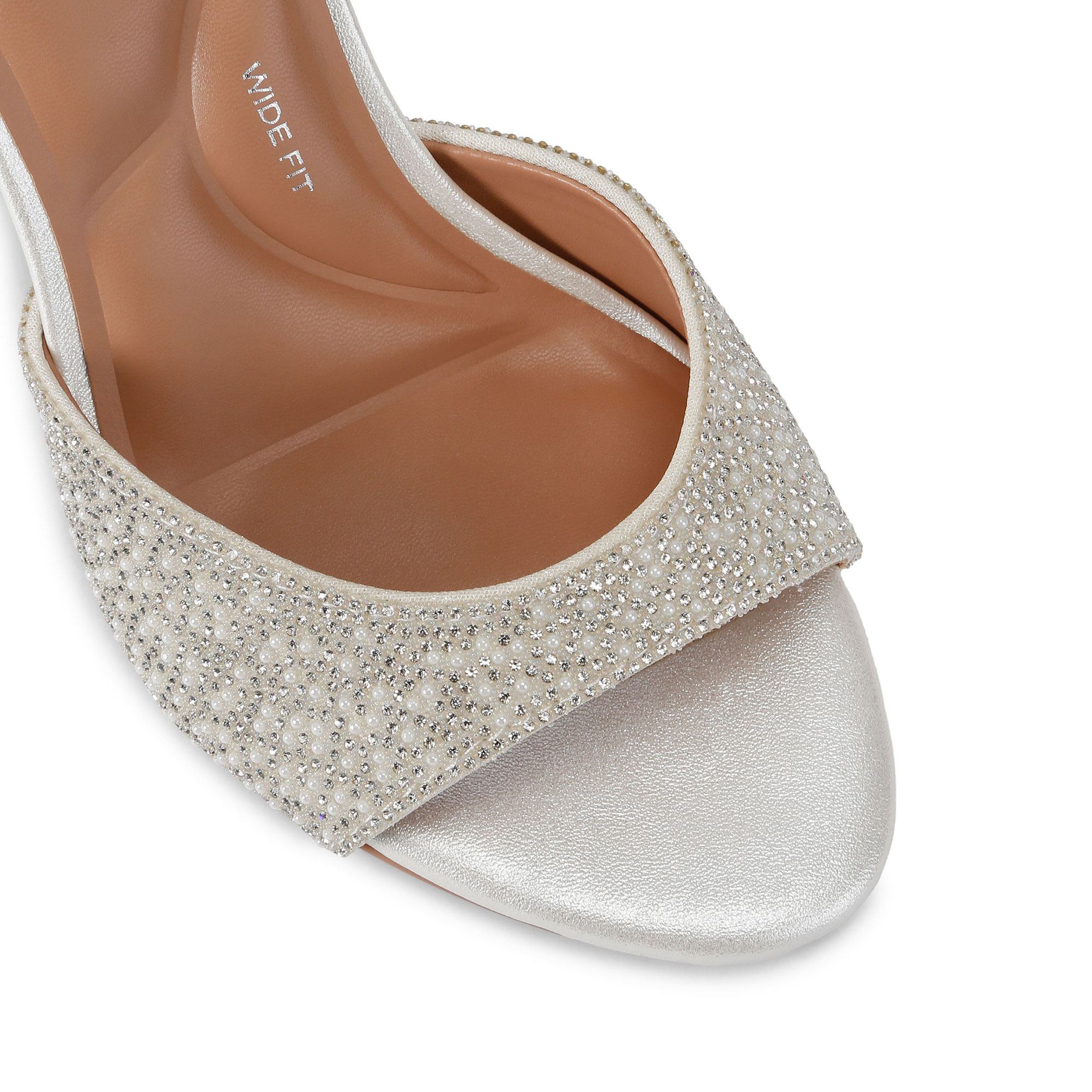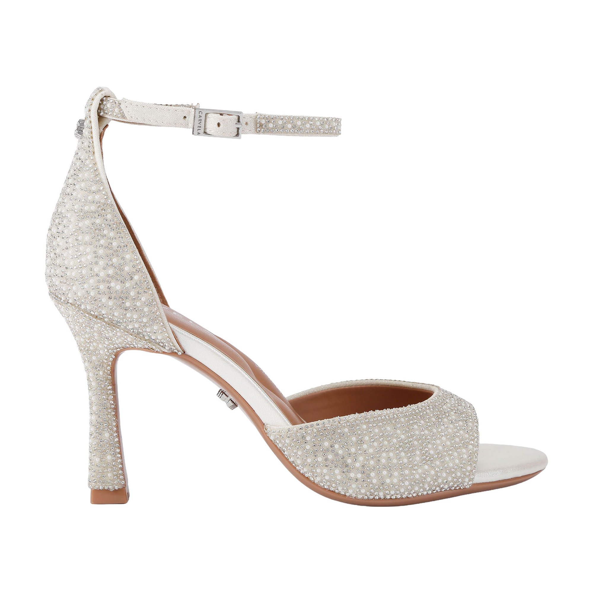 - Faux pearl and crystal embellishment, open toe, small ankle strap, silver-tone buckle