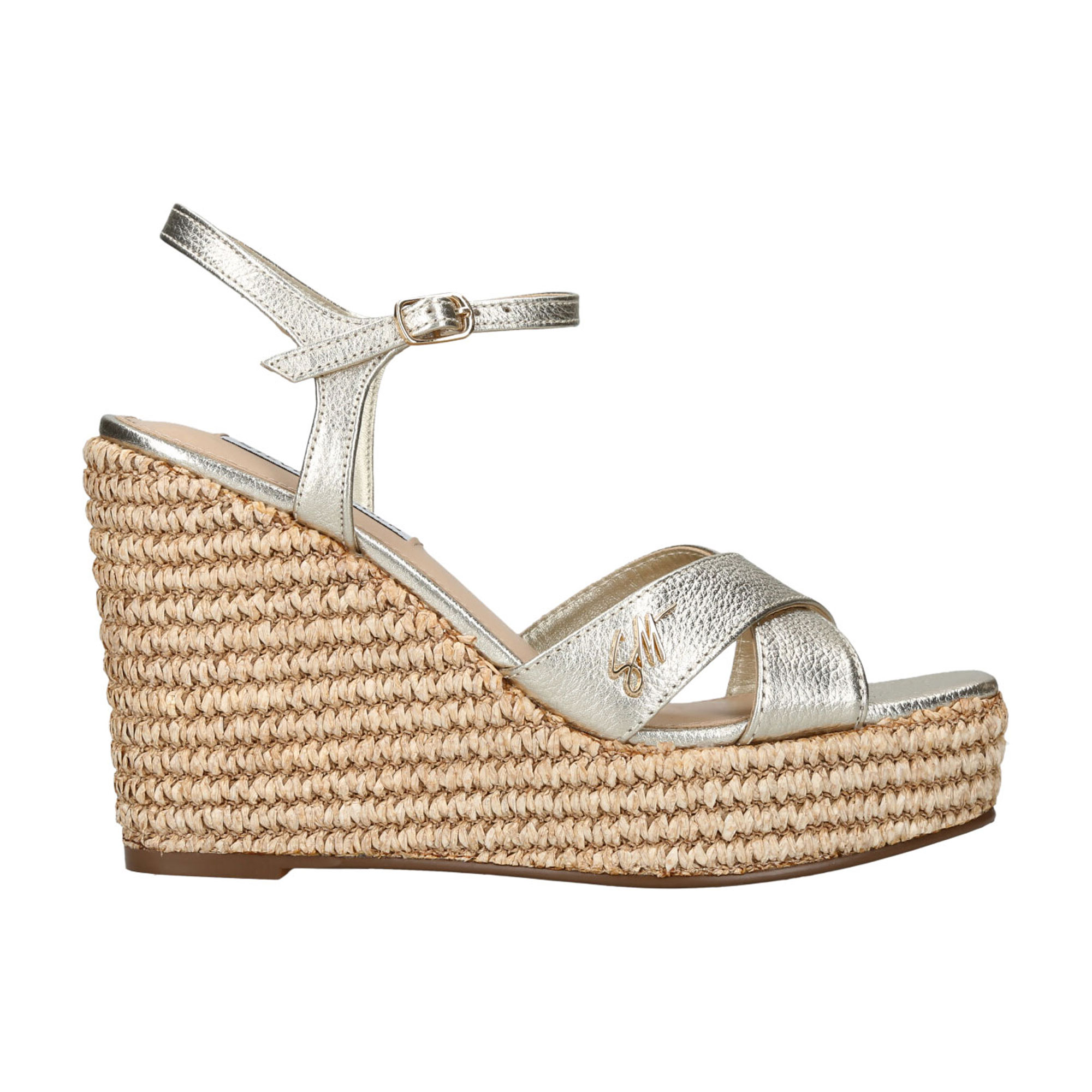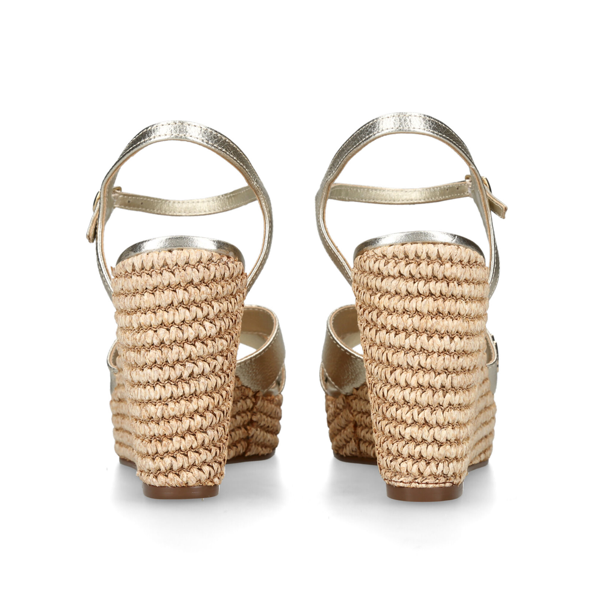 - Wedge sandal, metallic leather upper, ankle strap, buckle fastening, woven rope wedge heel