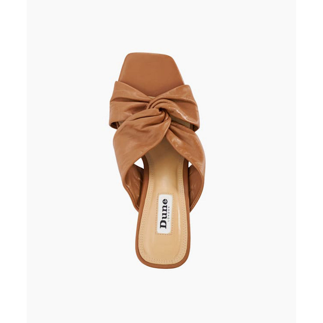 - Block heel, square open toe, crossover knot-detail toe strap, slip-on style