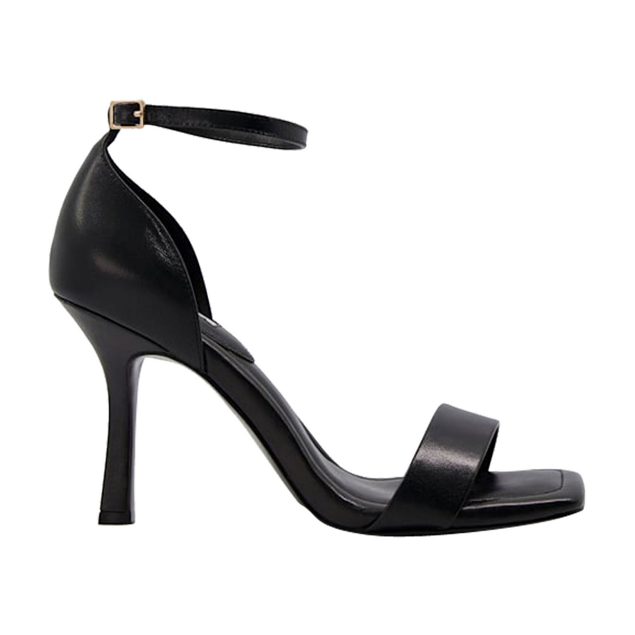 - Open toe, square toe, covered heel, ankle strap, buckle fastening, stiletto heel.