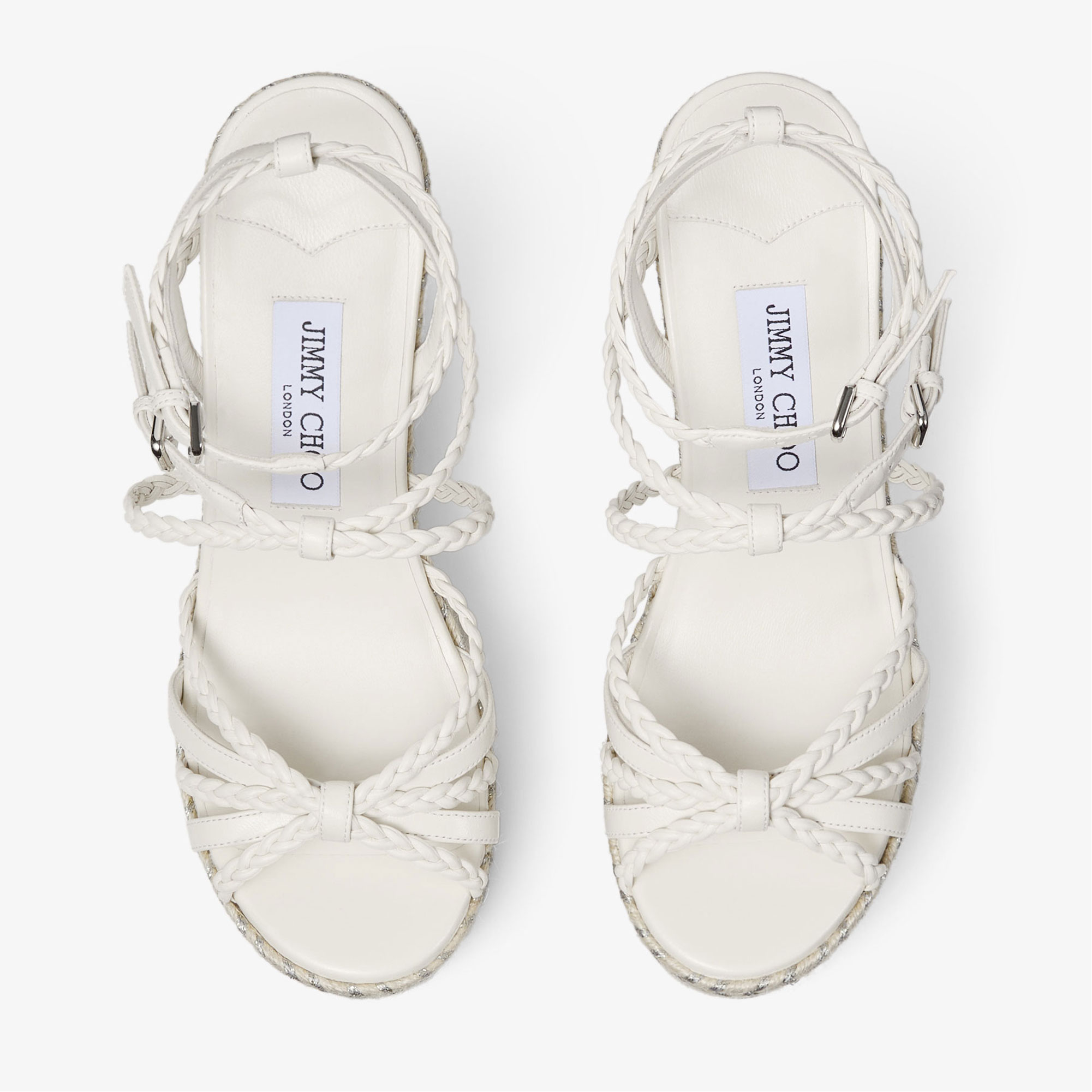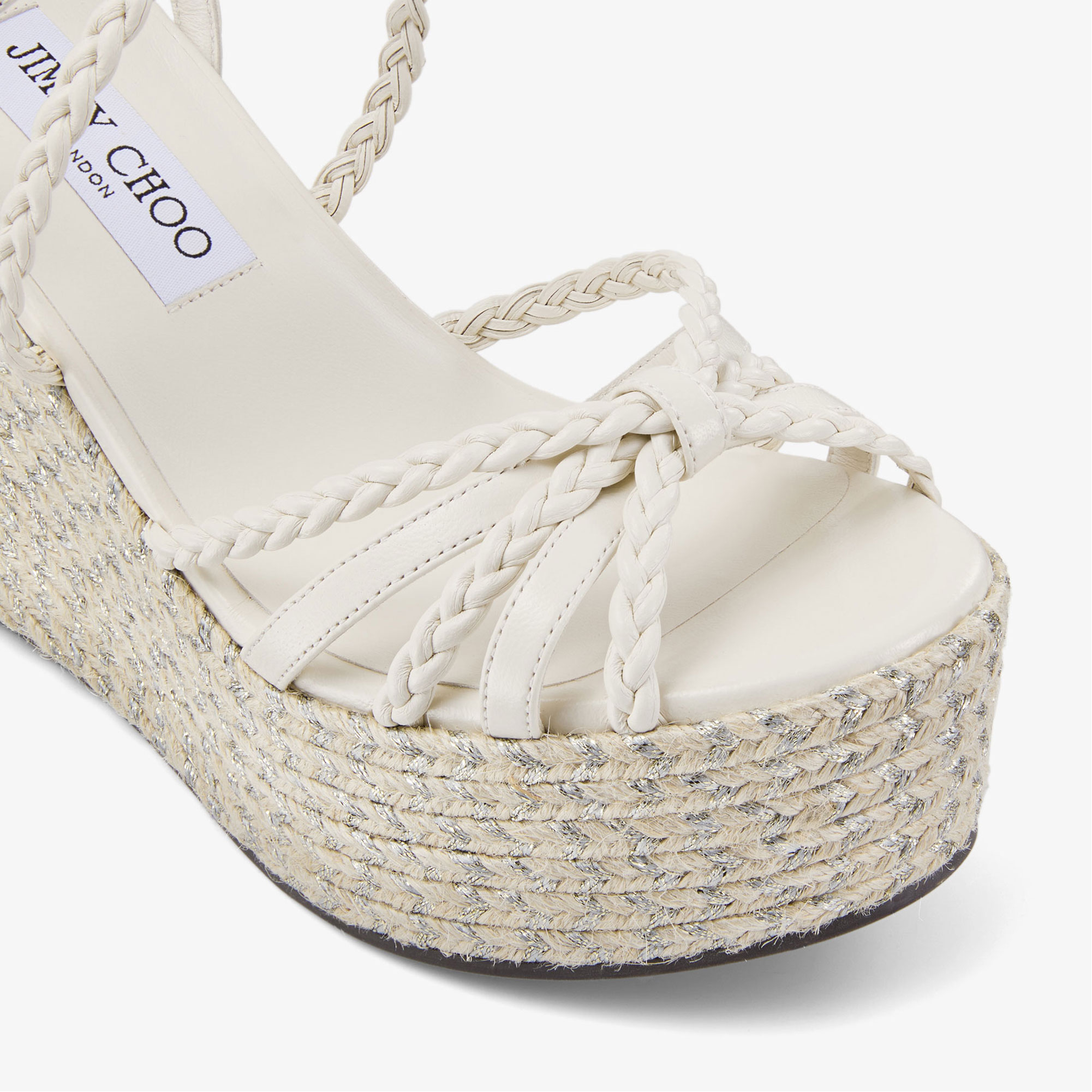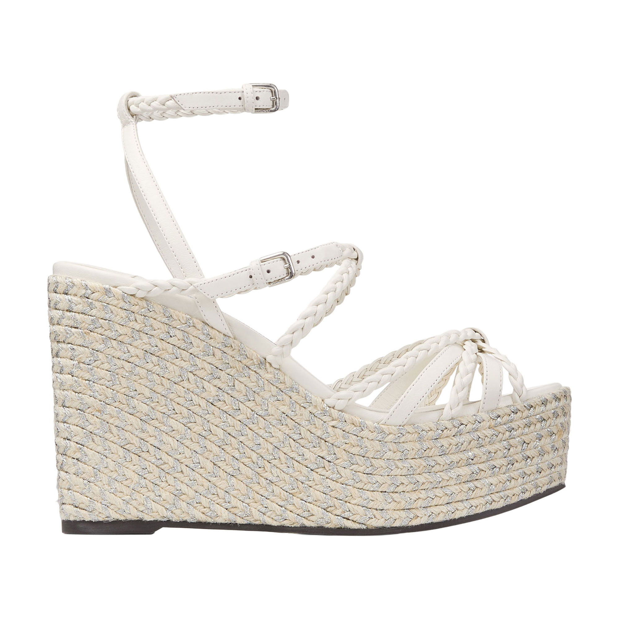 - Nappa leather, metallic jute platform, braided straps, lather knot, adjustable ankle strap, rubber sole