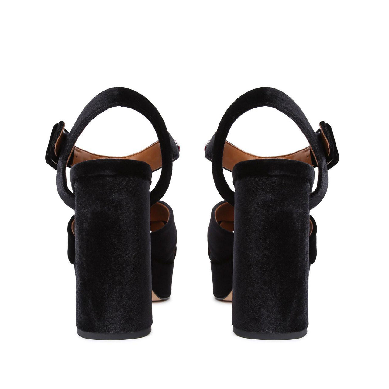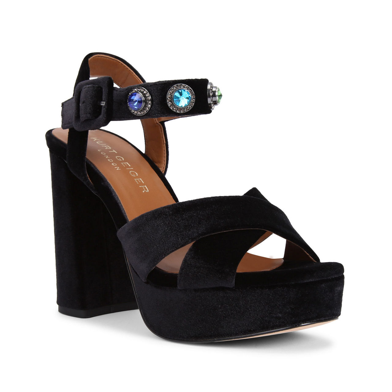 - Black velvet, crossed straps at the toe topped with multi-colour crystals, ankle fastening, velvet buckle