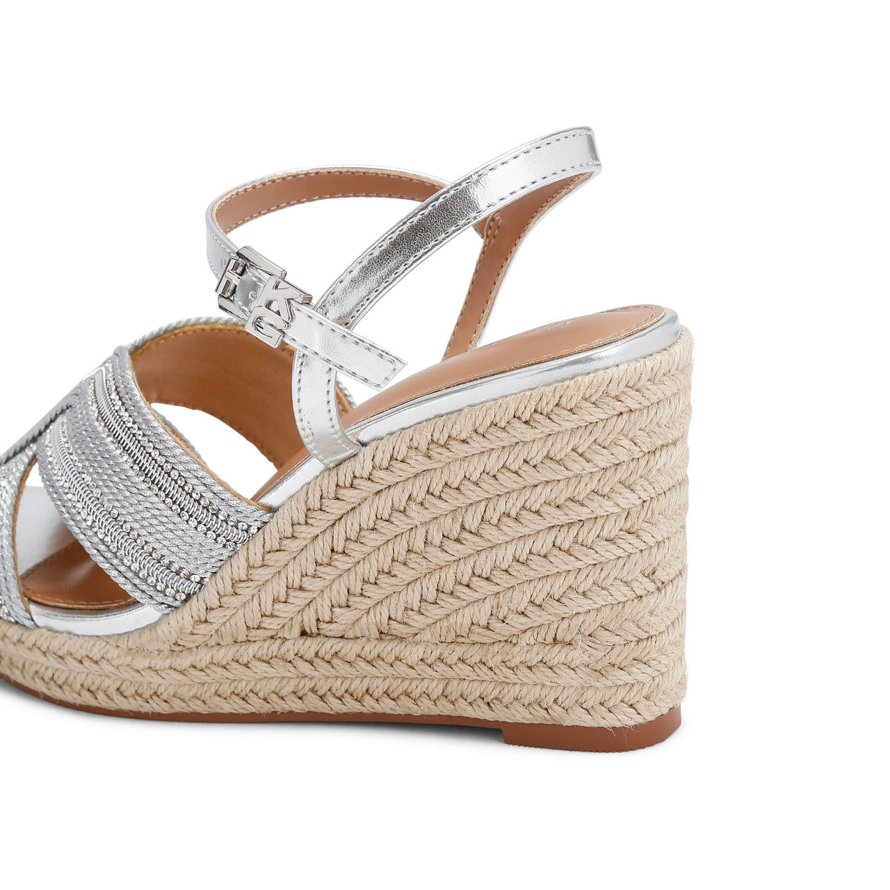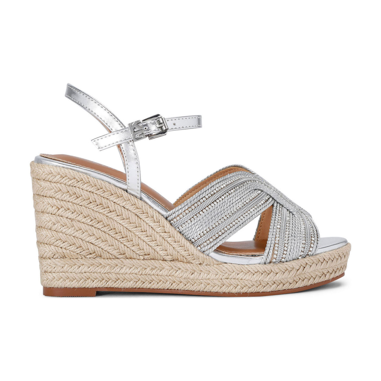 - Wedge heel, rope and crystal embellished strap across the foot, adjustable ankle strap, silver-tone buckle fastening