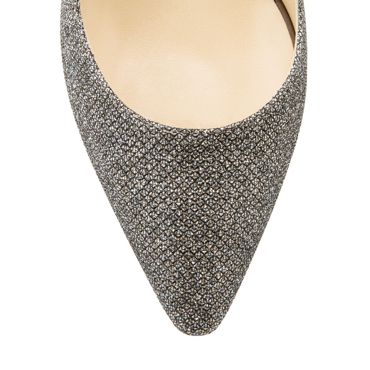 - Pointed toe, lamé glitter finish, stiletto heel.