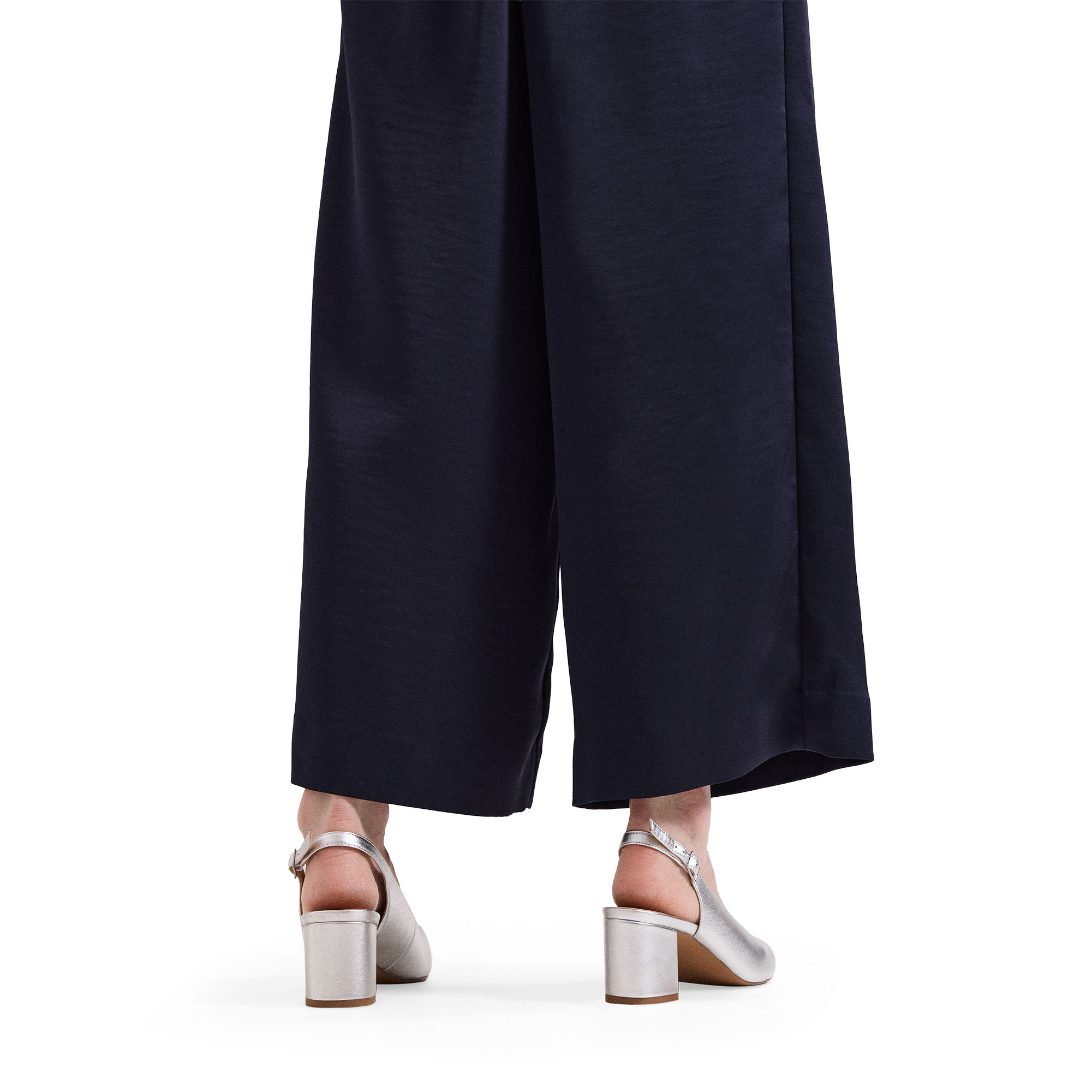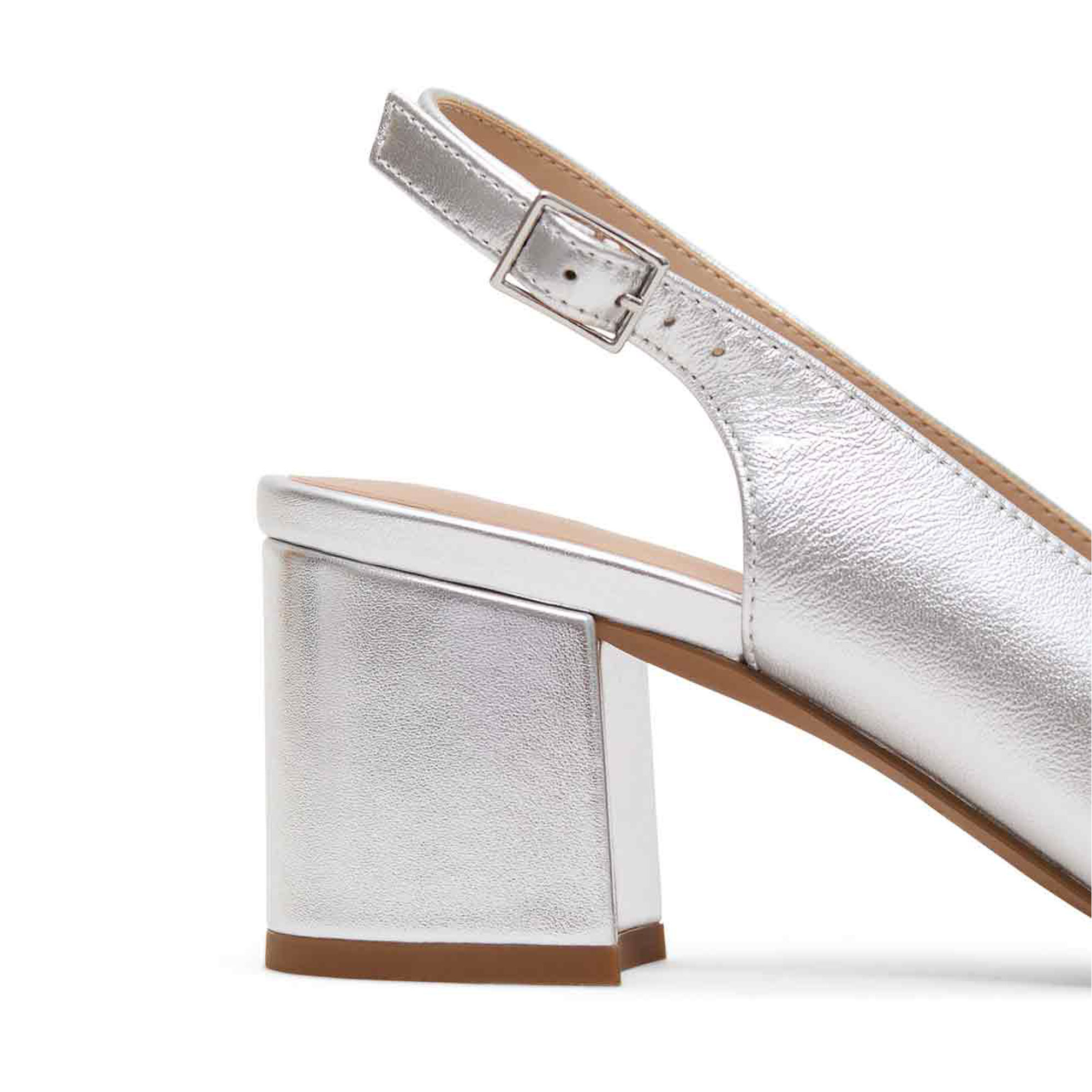 - Metallic finish, leather construction, pointed toe, slingback silhouette, block heel, buckle fastening