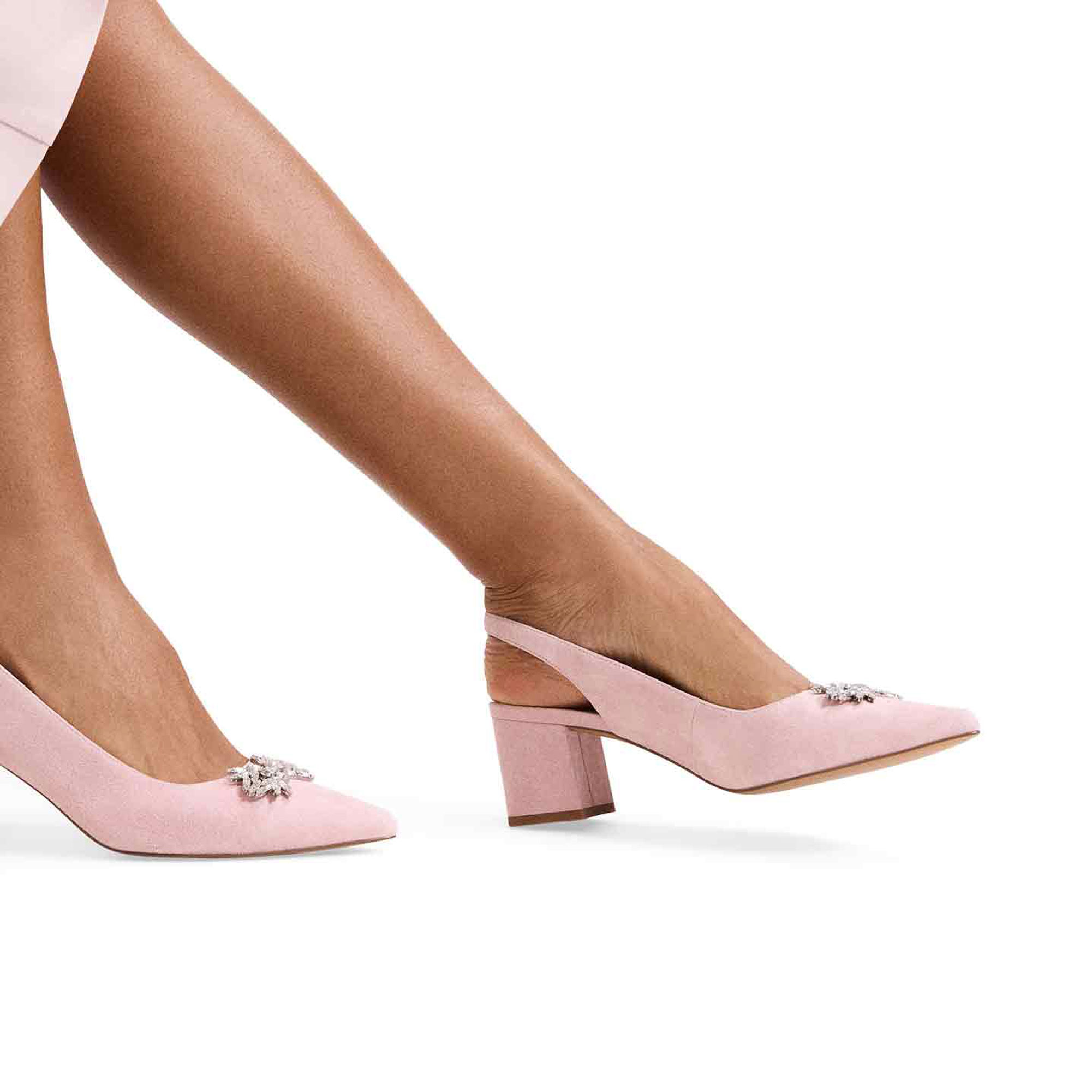 - Pointed toe, block heel, slingback silhouette, embellishment, buckle fastening