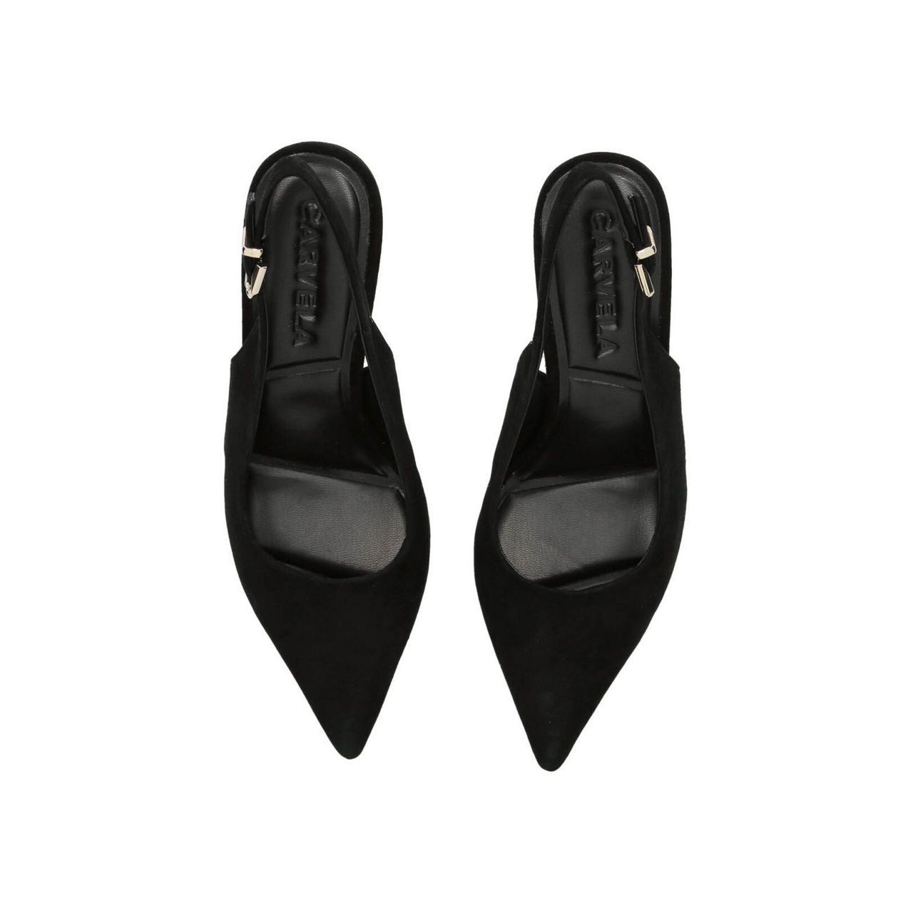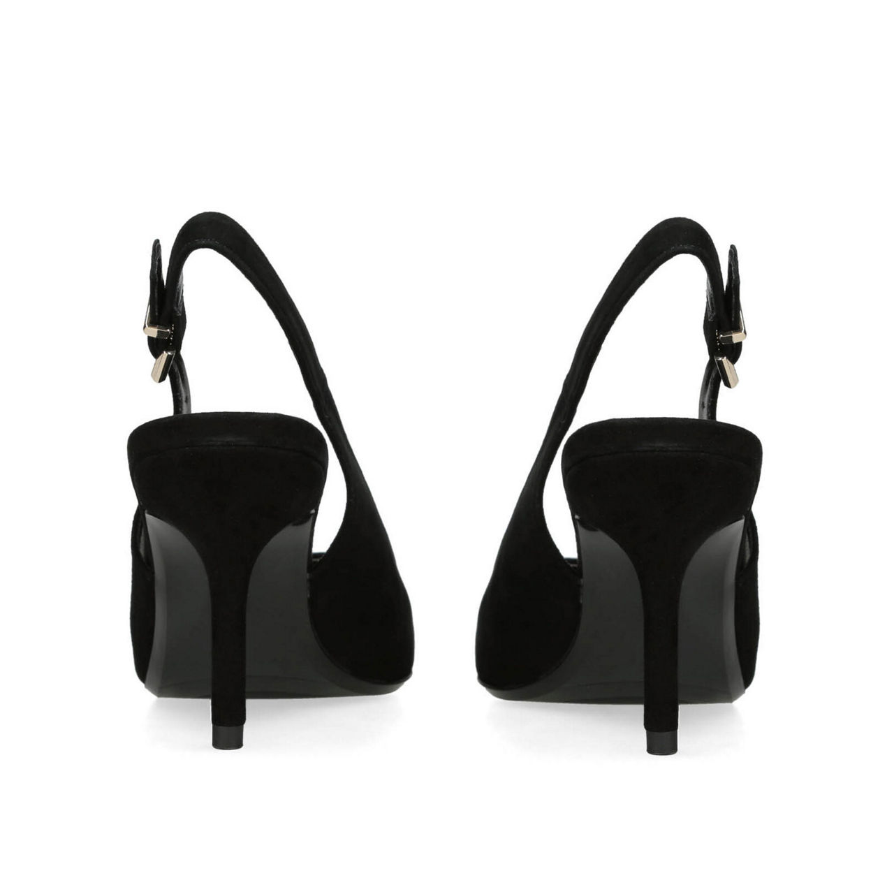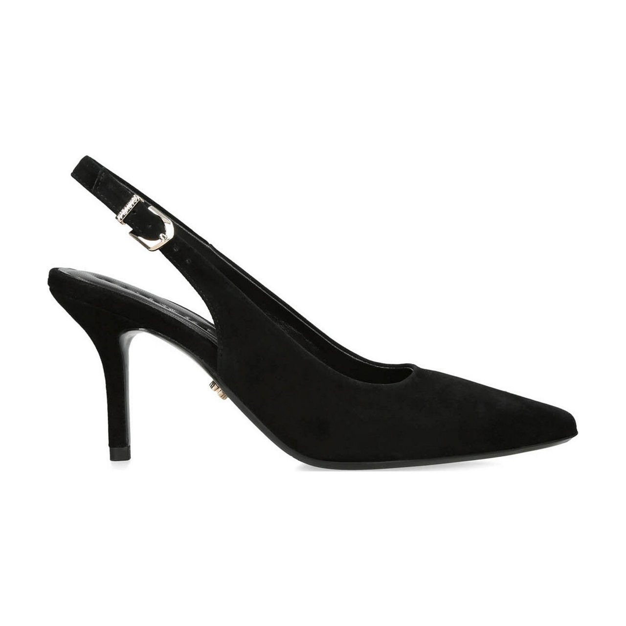 - Pointed toe, stiletto heel, sling-back style, buckle fastening, adjustable fit, logo hardware, suede finish
