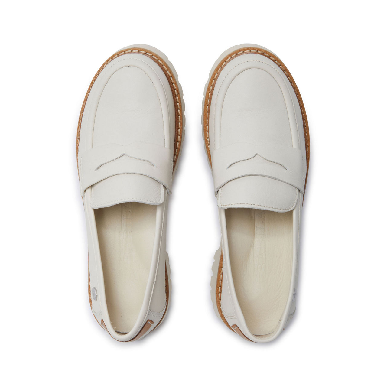 - Leather upper, platform heel, rounded toe, loafer silhouette, contrasting sole, embossed medallion, leather lining, cushioned insole