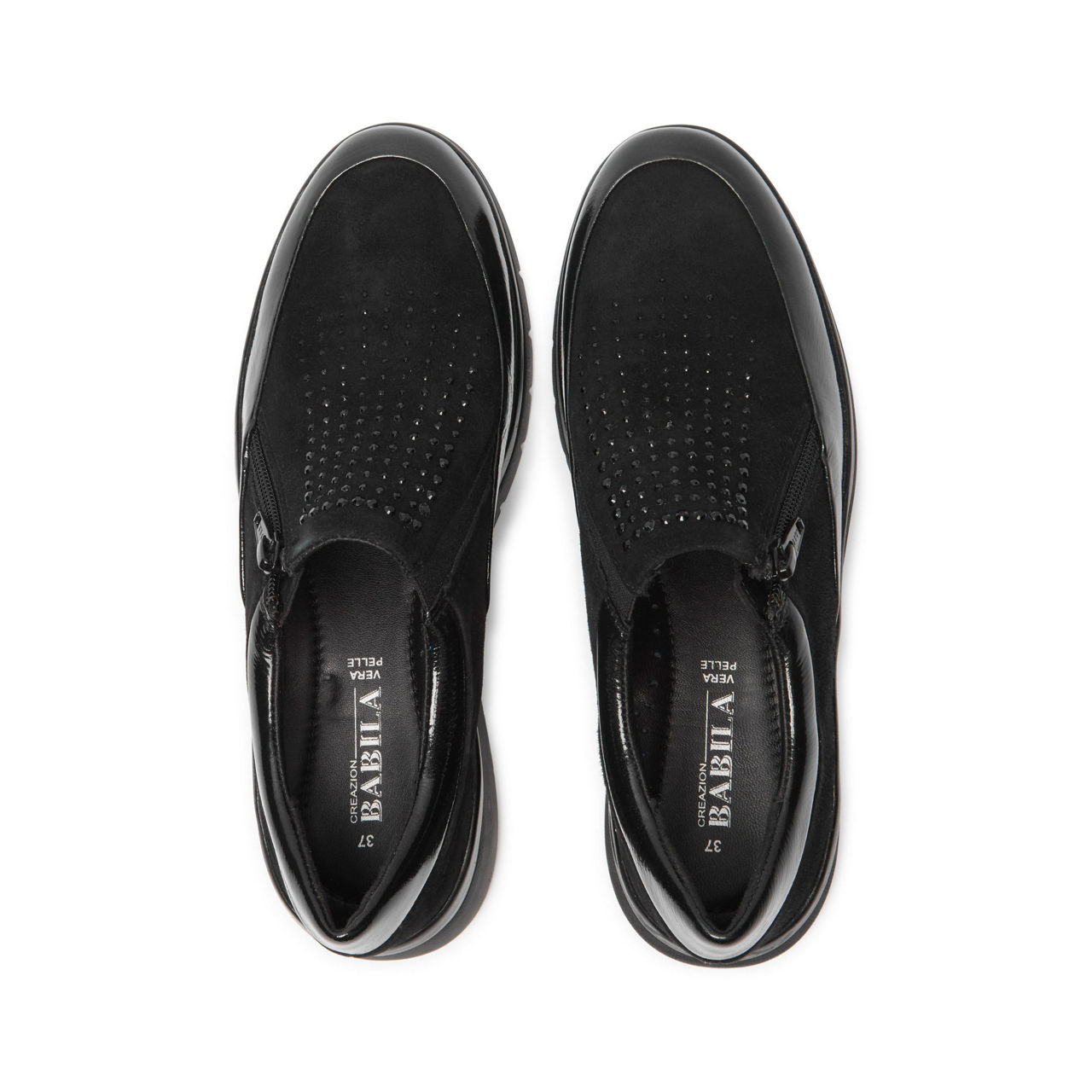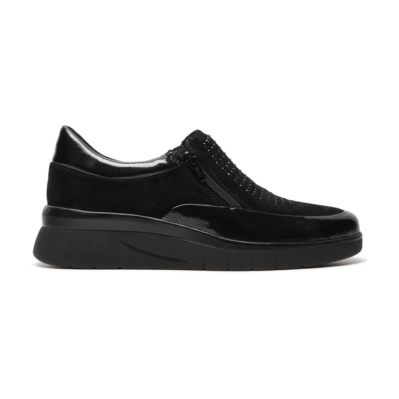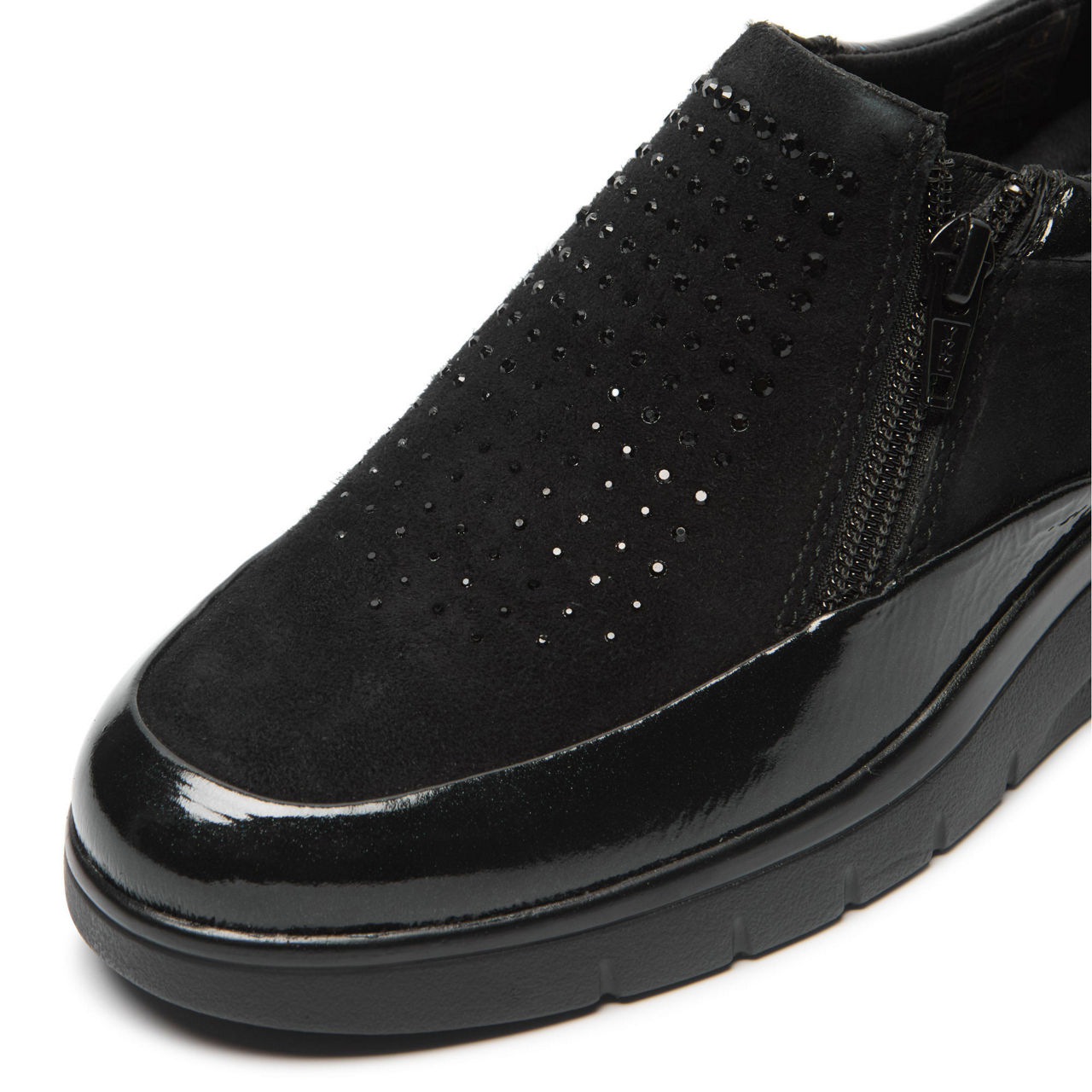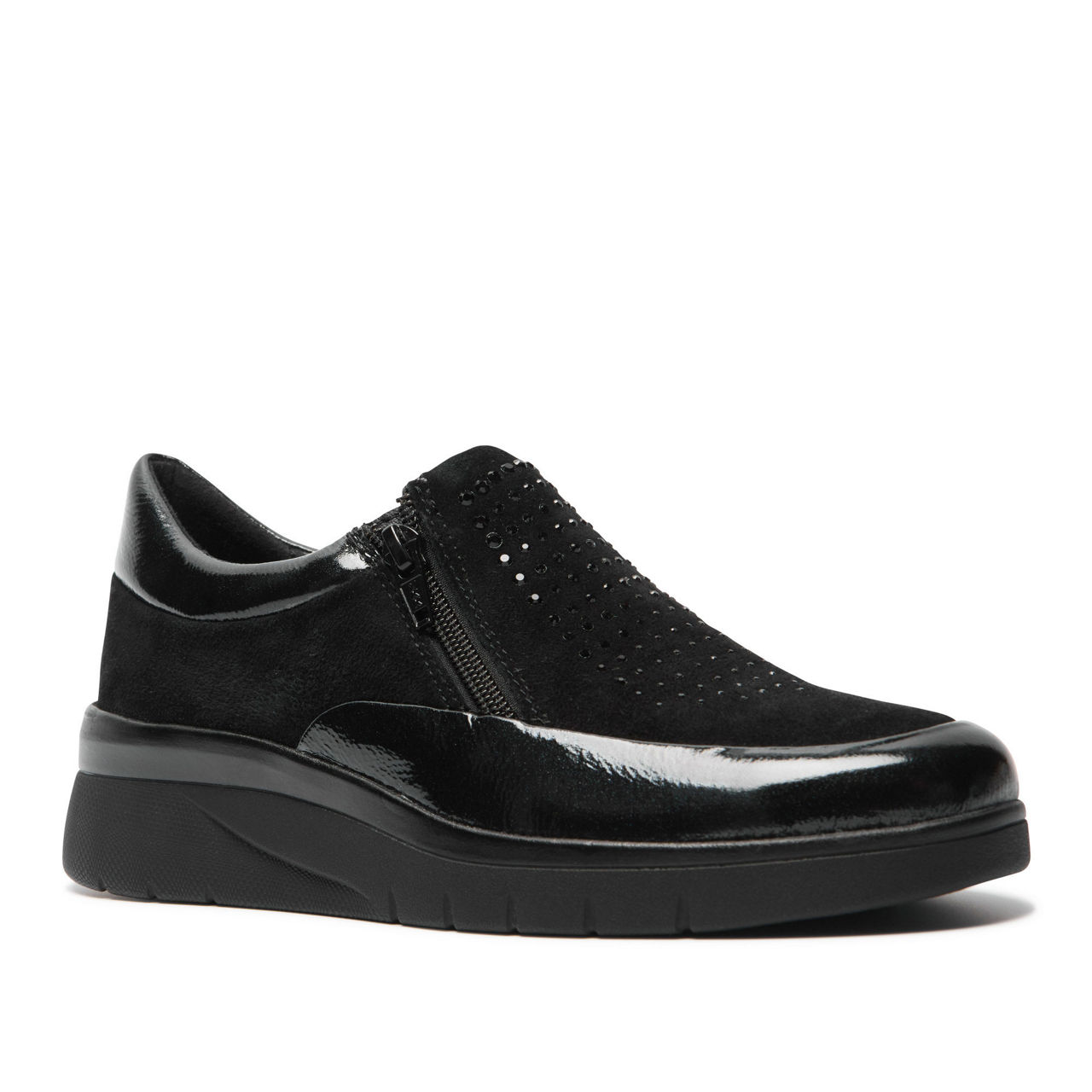 - Suede upper, low sporty profile, patent leather foxing and collar, diamante vamp design, wedge platform sole, outside zip, slip-on