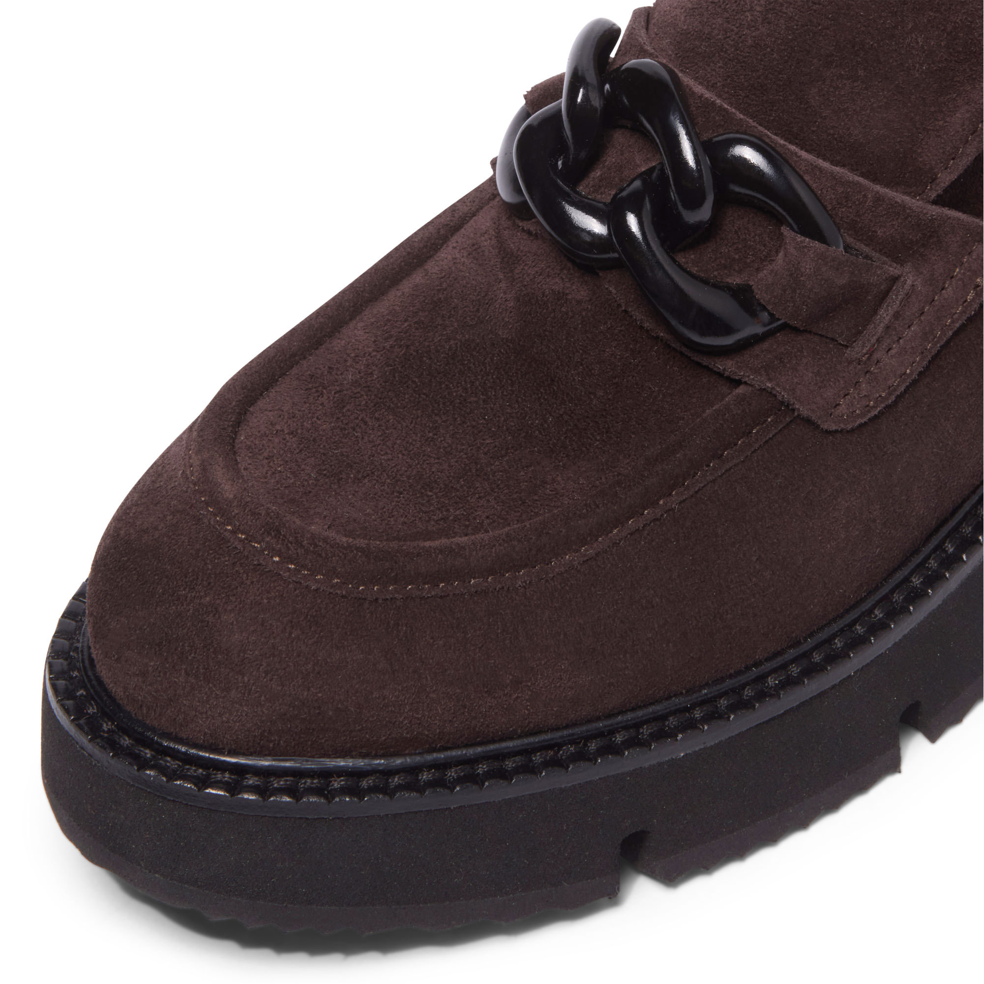 - Flatform sole, glossed chain detail, leather lined, cushioned insole, logo detail