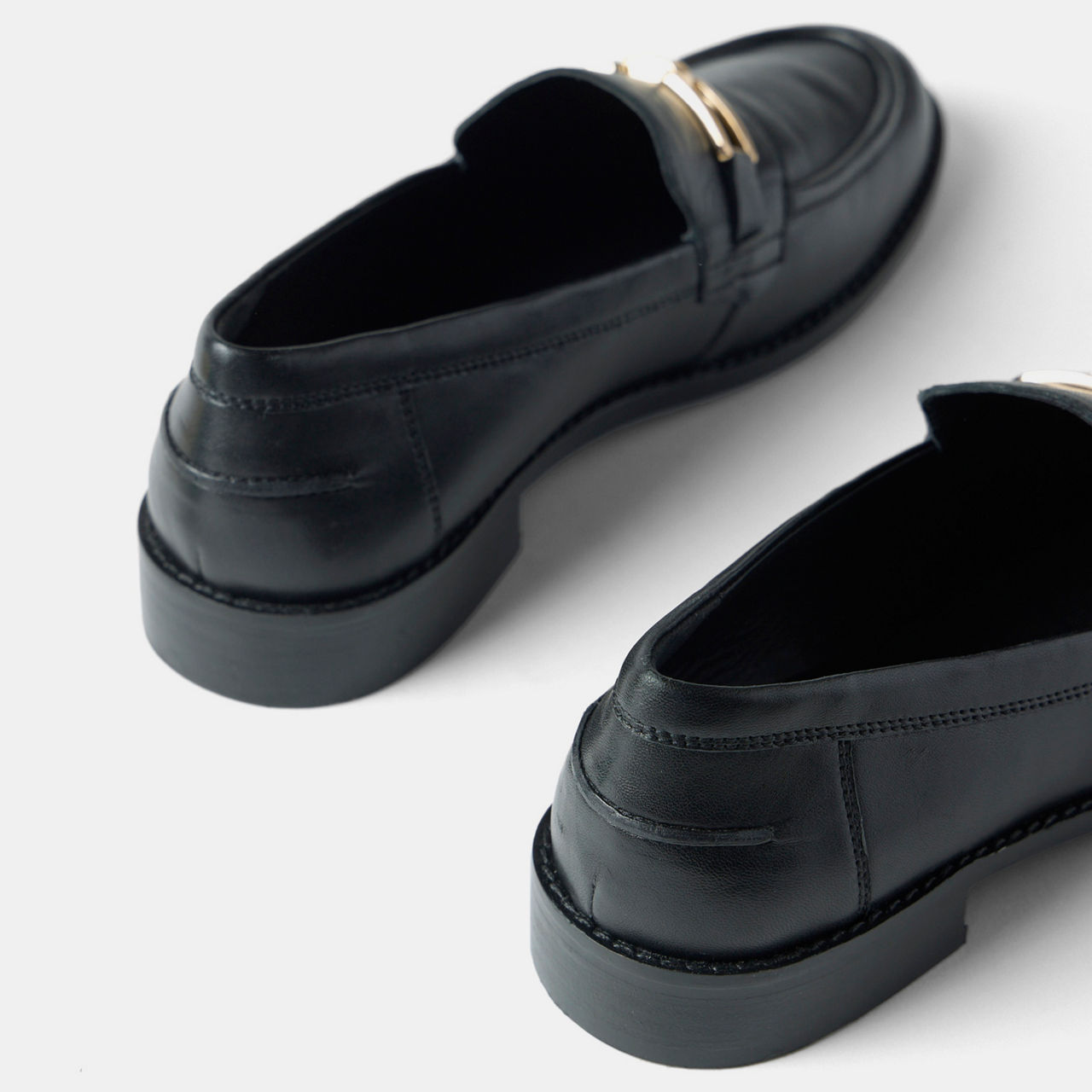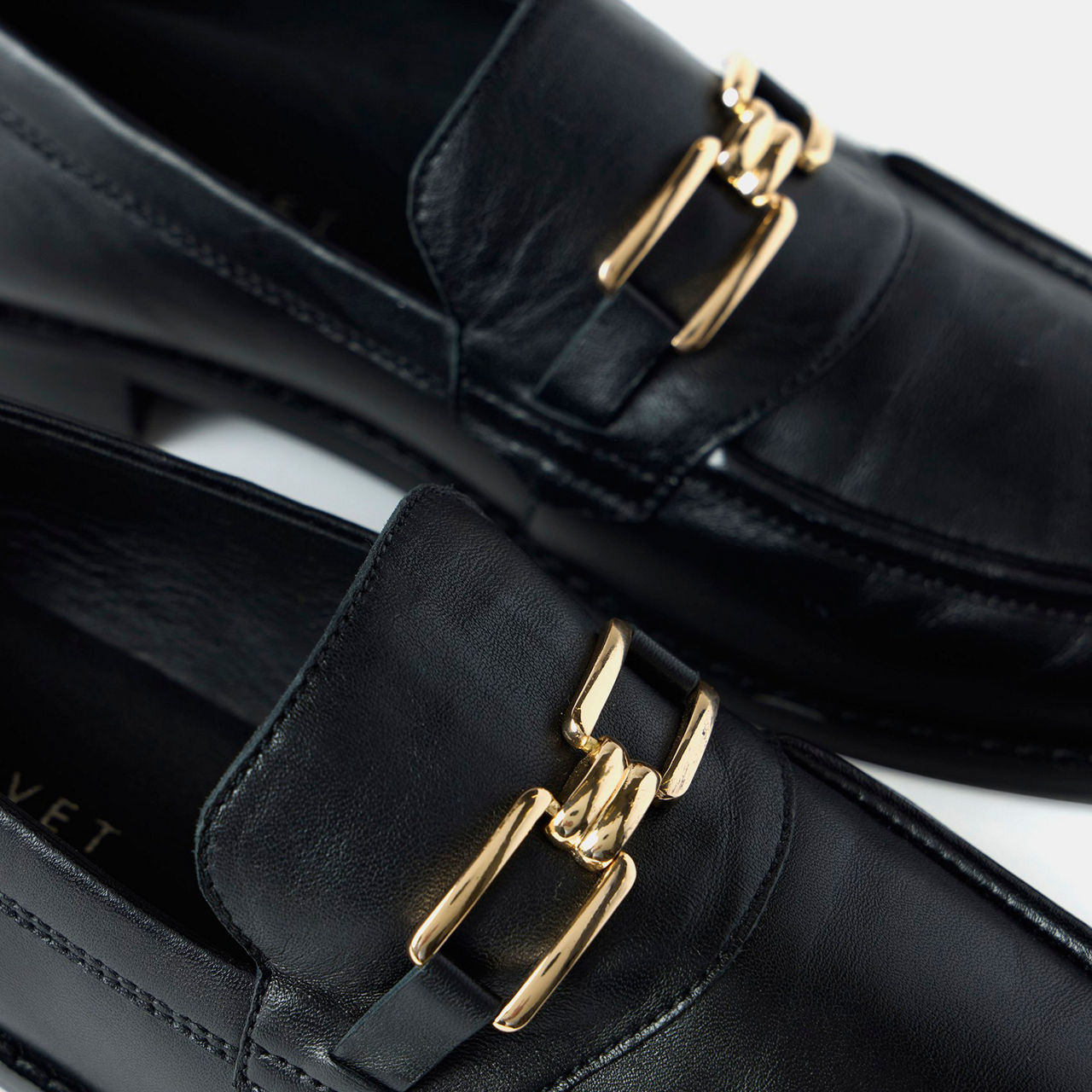 - Slip-on style, almond toe, gold hardware detailing across the foot, smooth finish