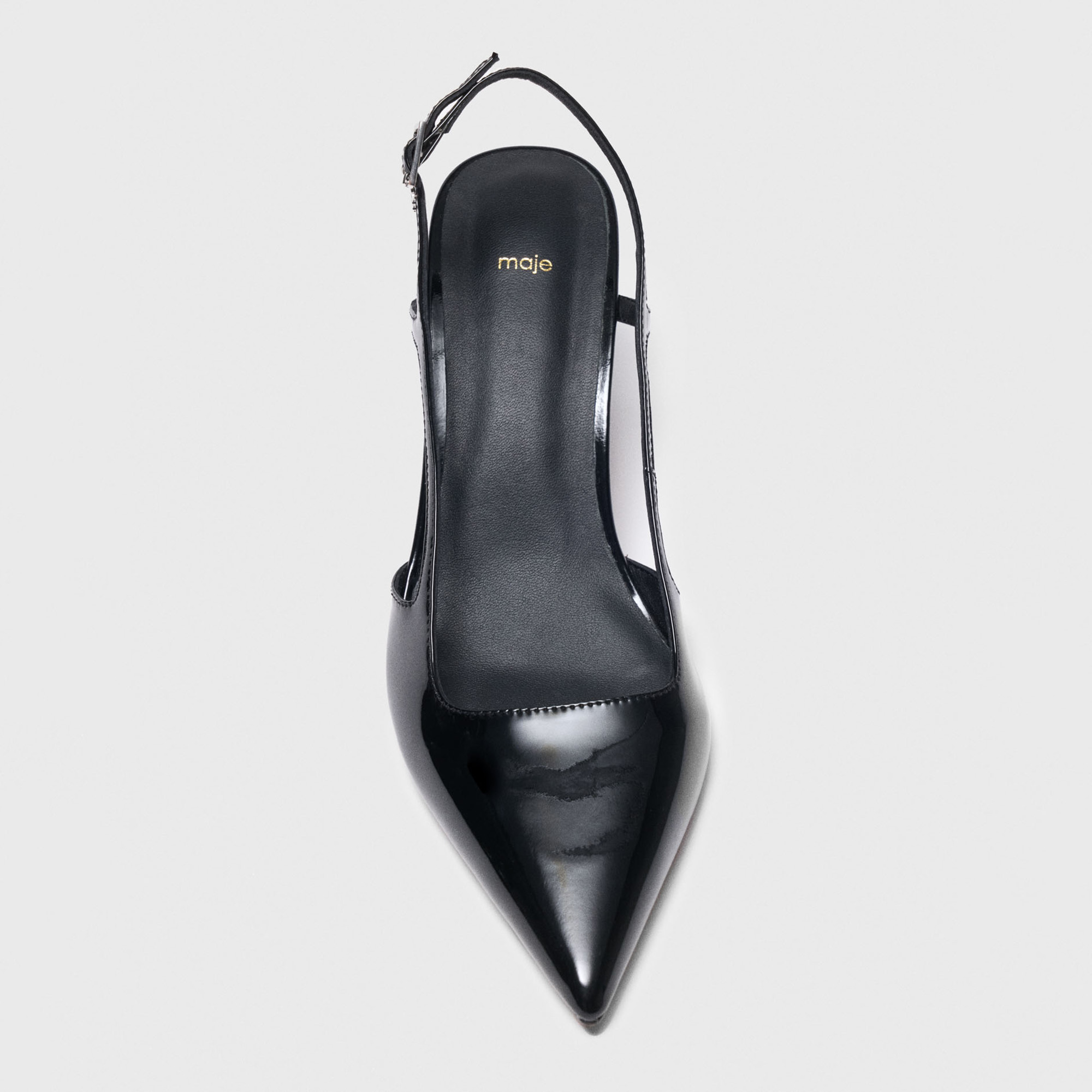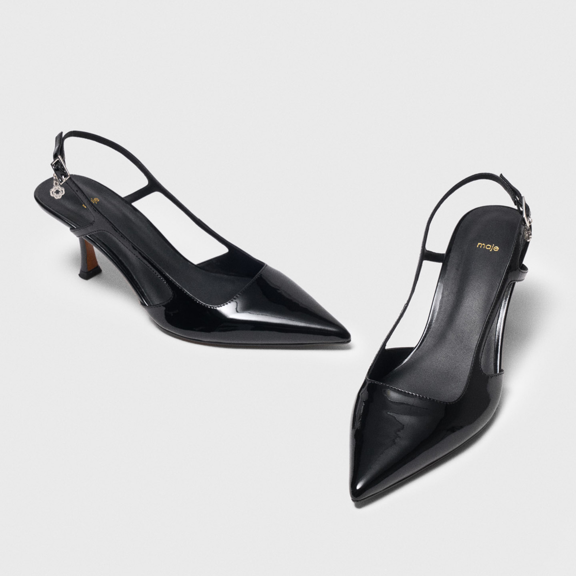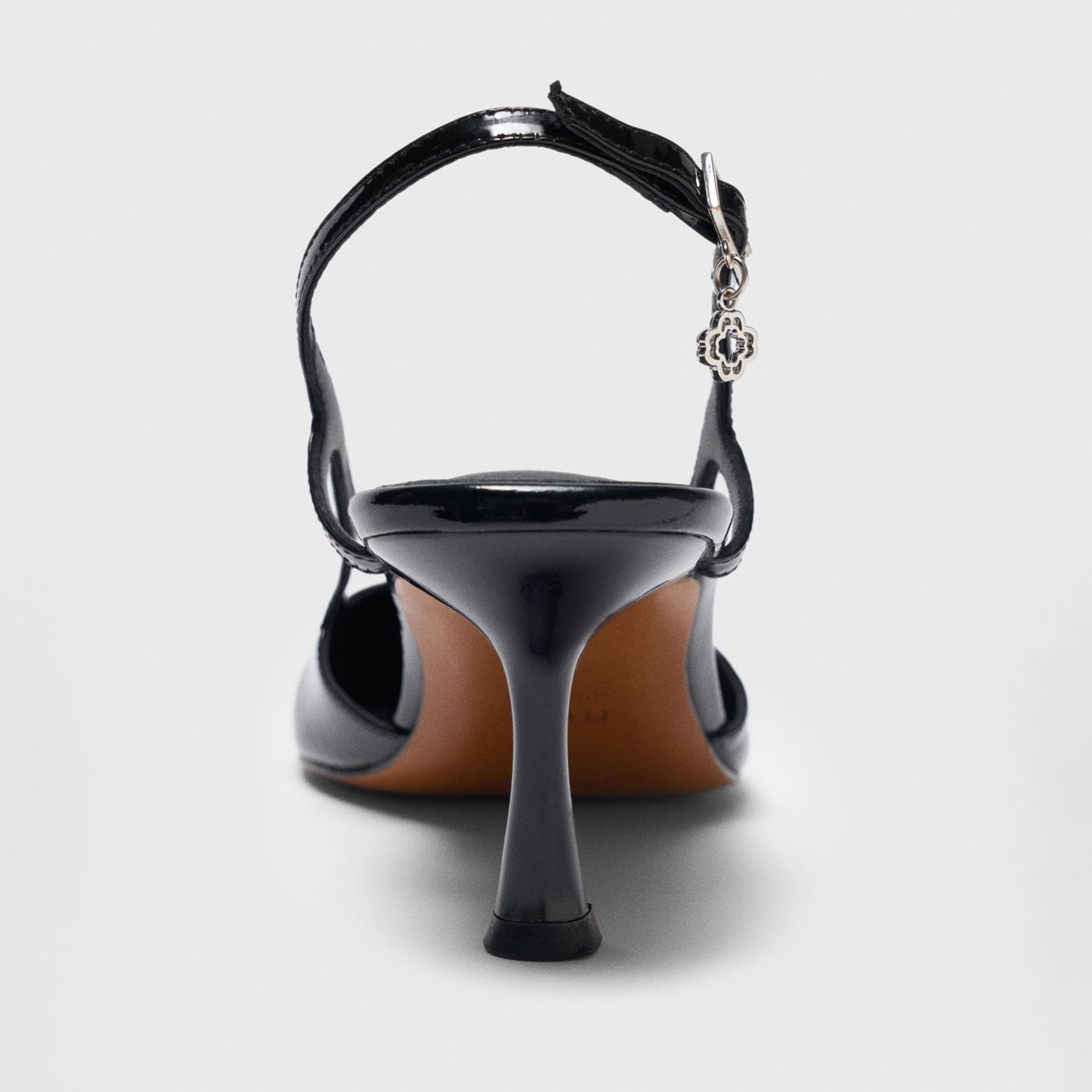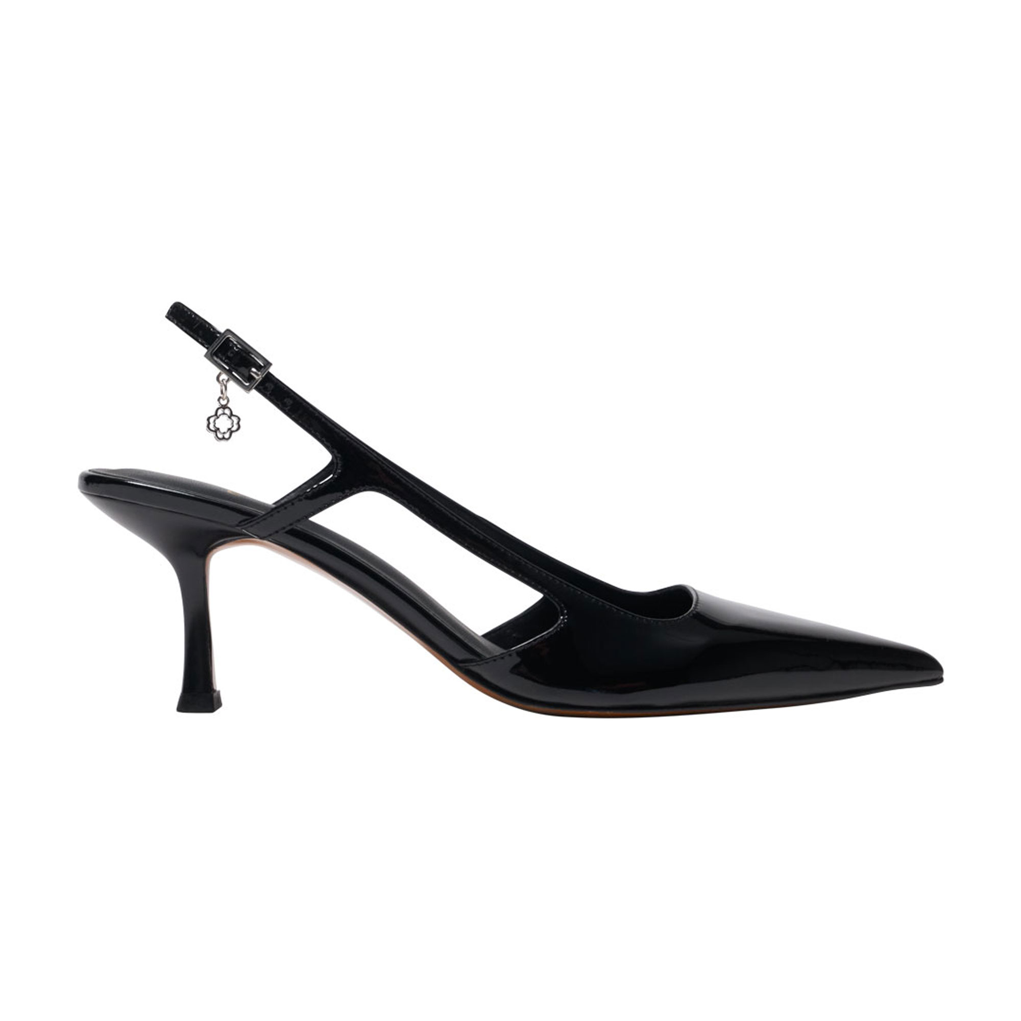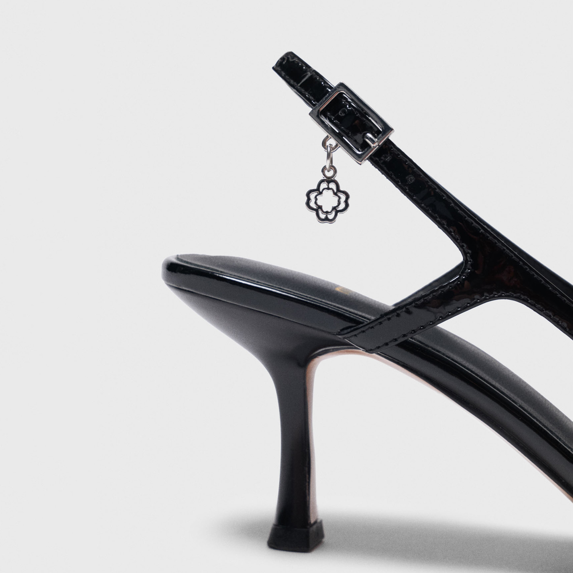 • Pointed toe, stiletto heel, adjustable buckle with clover charm, patent finish