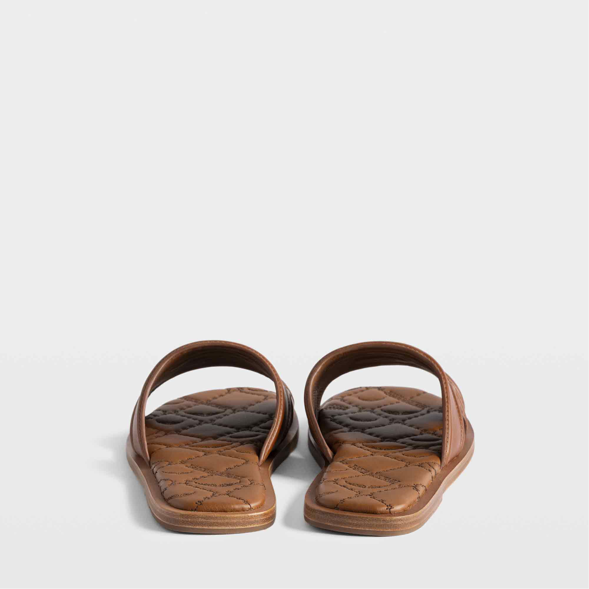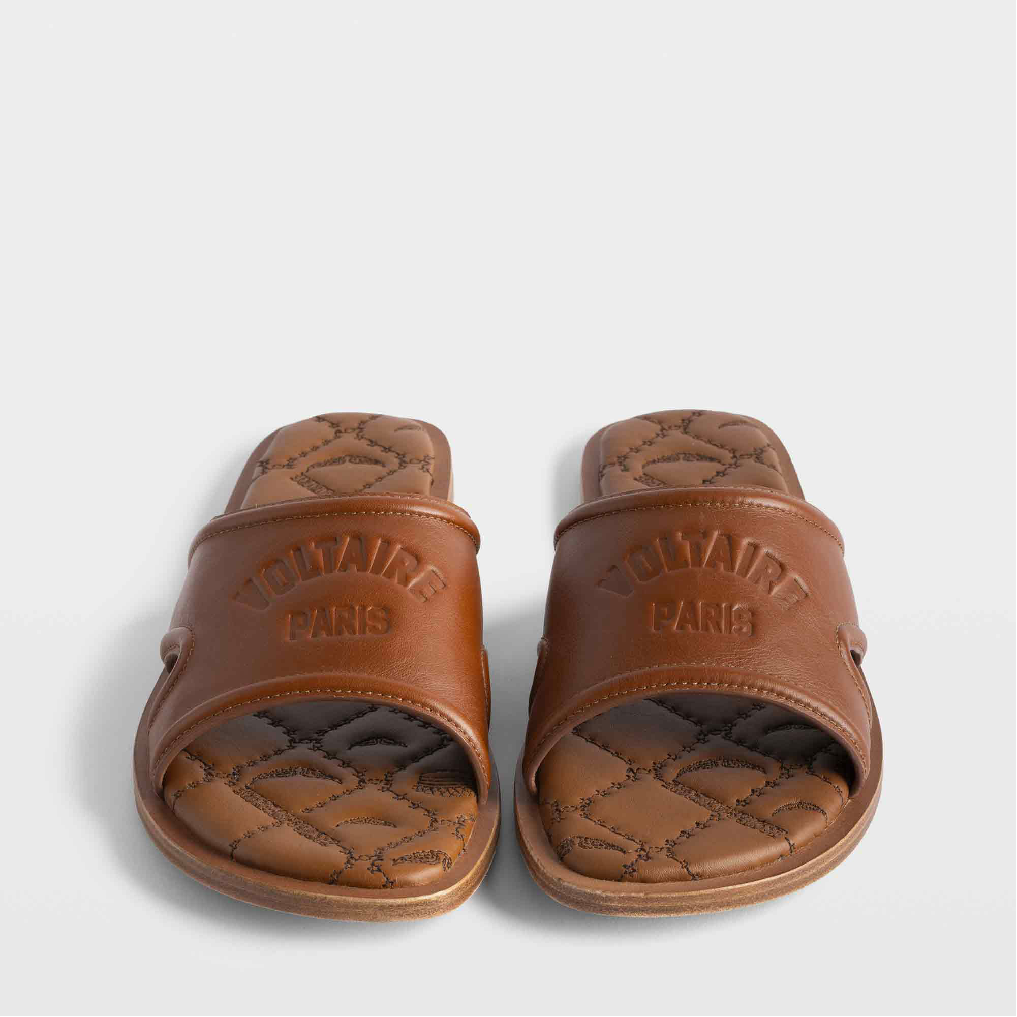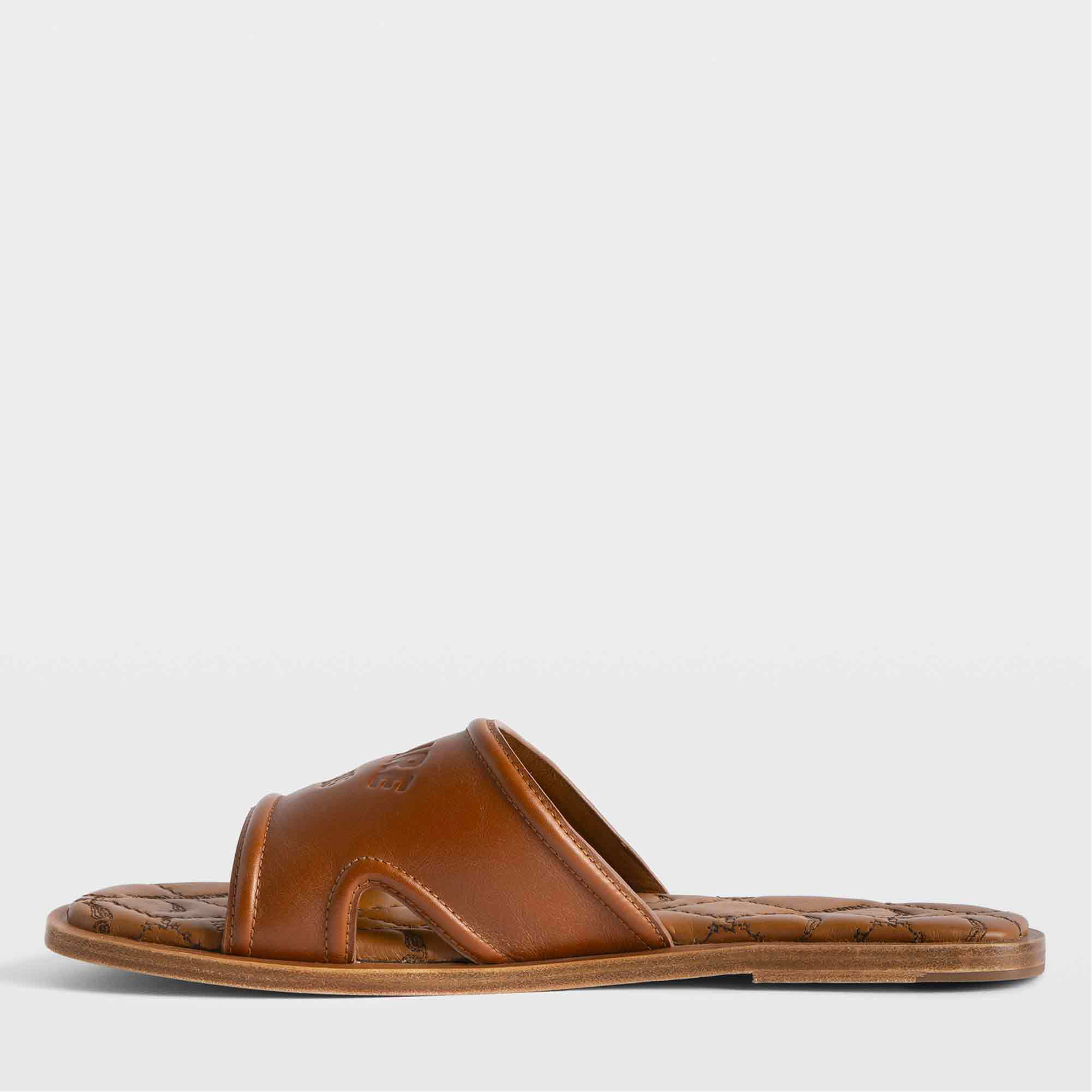 - Leather, mule style, open toe, embossed logo detail, embroidered foam insole