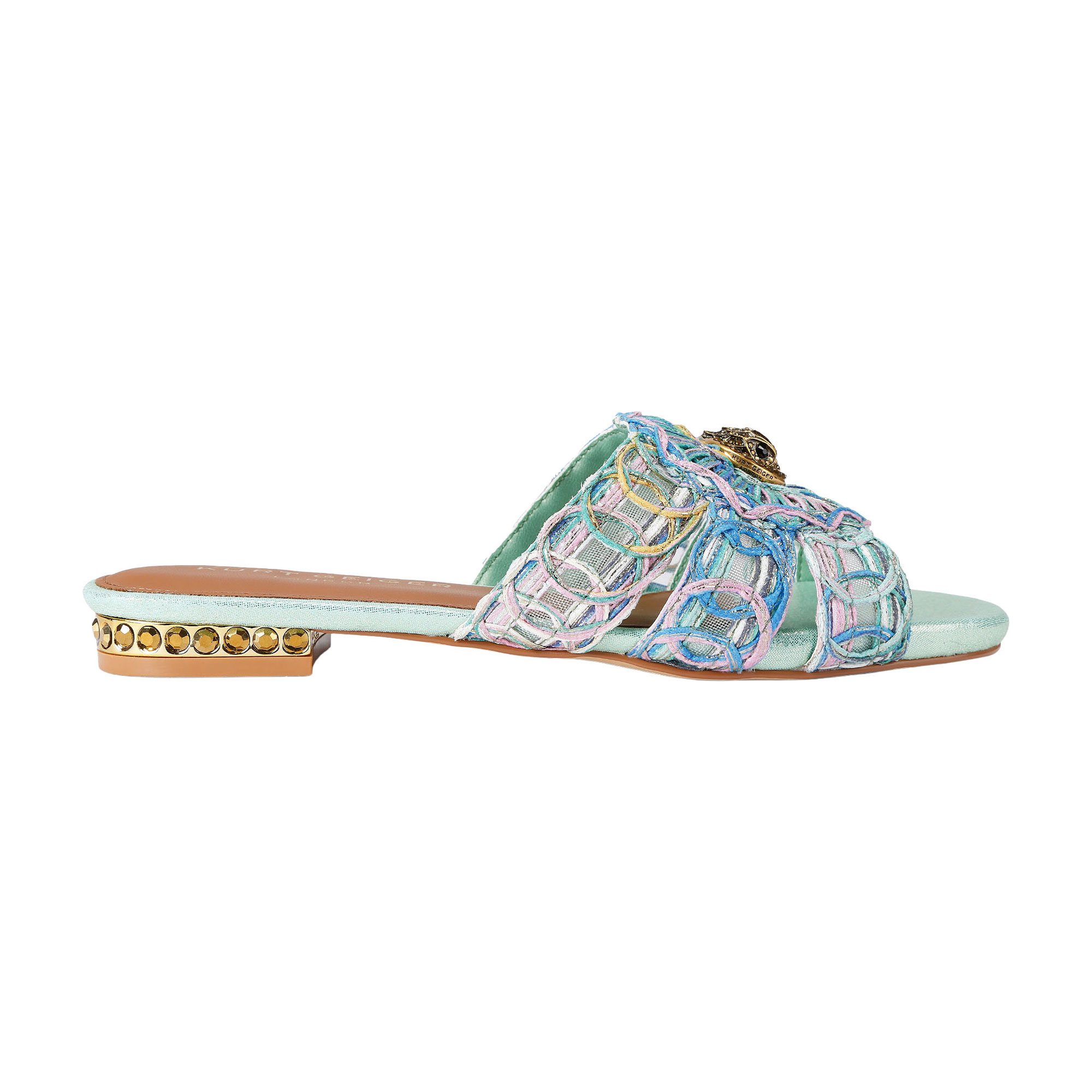 - Flat sandal design, woven fabric strap, oval trim with Eagle Head detail, brass crystal heel embellishment
