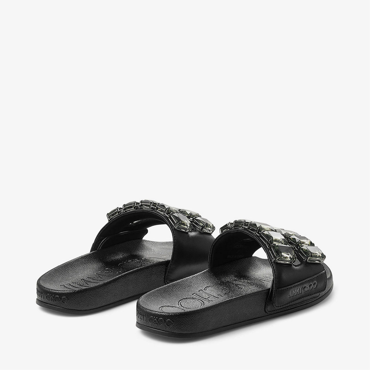 • Crystal-adorned foot straps, nappa leather, adjustable tape and loop fastening, flexible rubber sole, moulded innersole, backless silhouette, rounded open toe, brand logo details