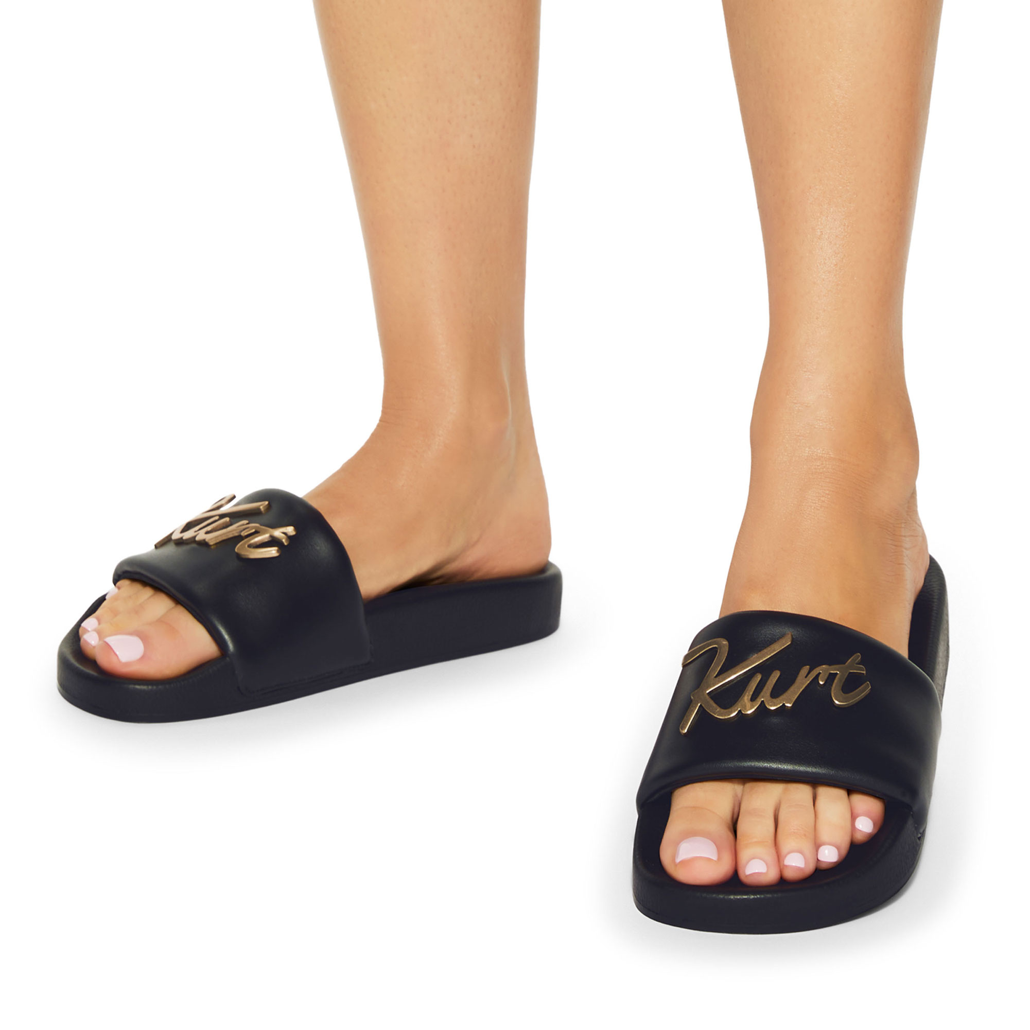 - Sandal design, slip-on style, leather alternative, antiqued brass cursive branding on strap