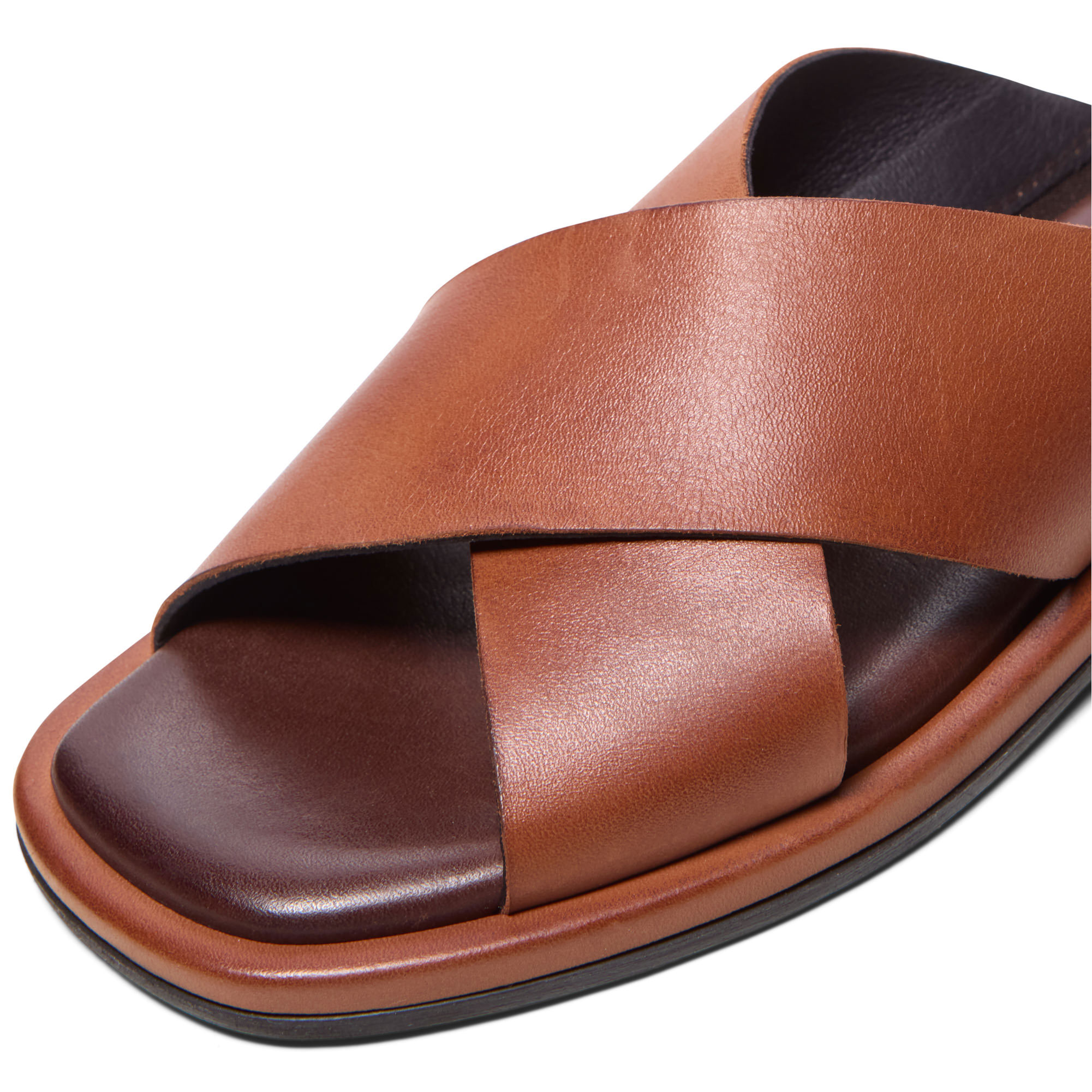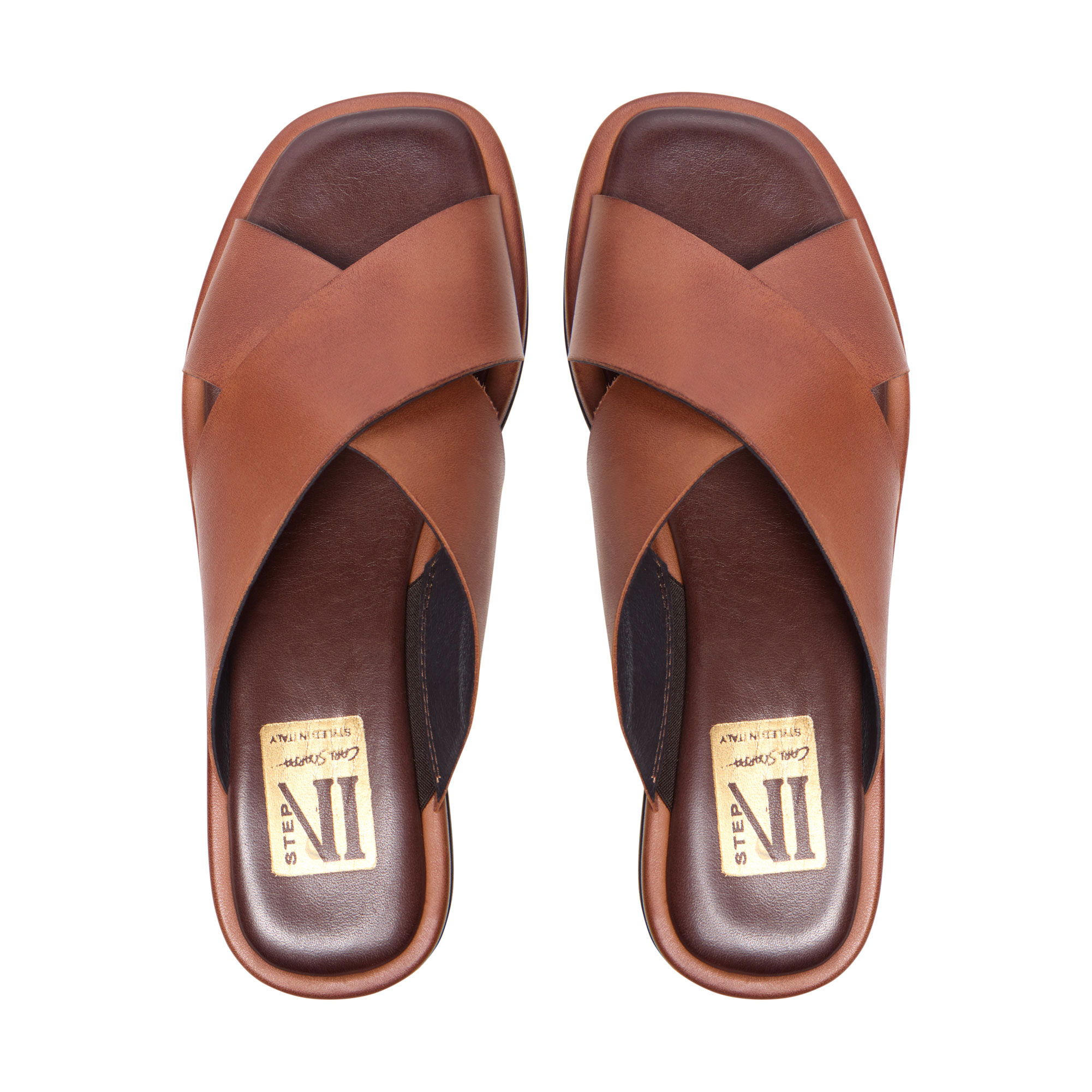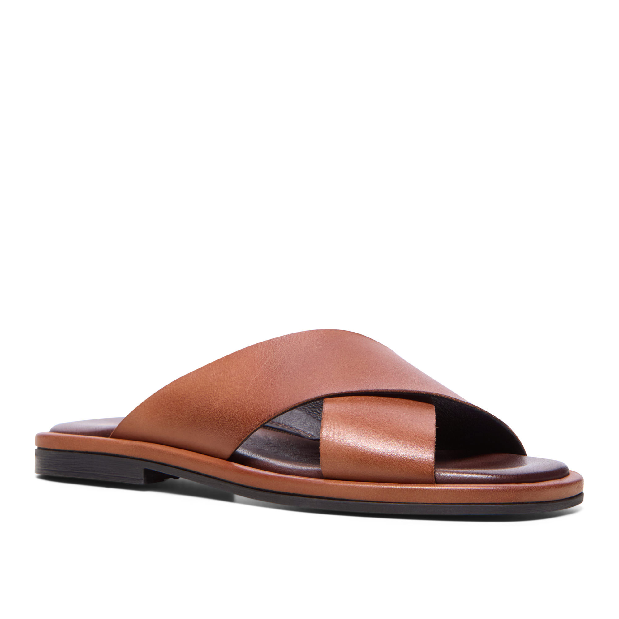 - Smooth leather, crossover straps, slip-on style, open square toe, breathable comfort, leather-lined footbed, low stacked heel, lightweight, durable outsole