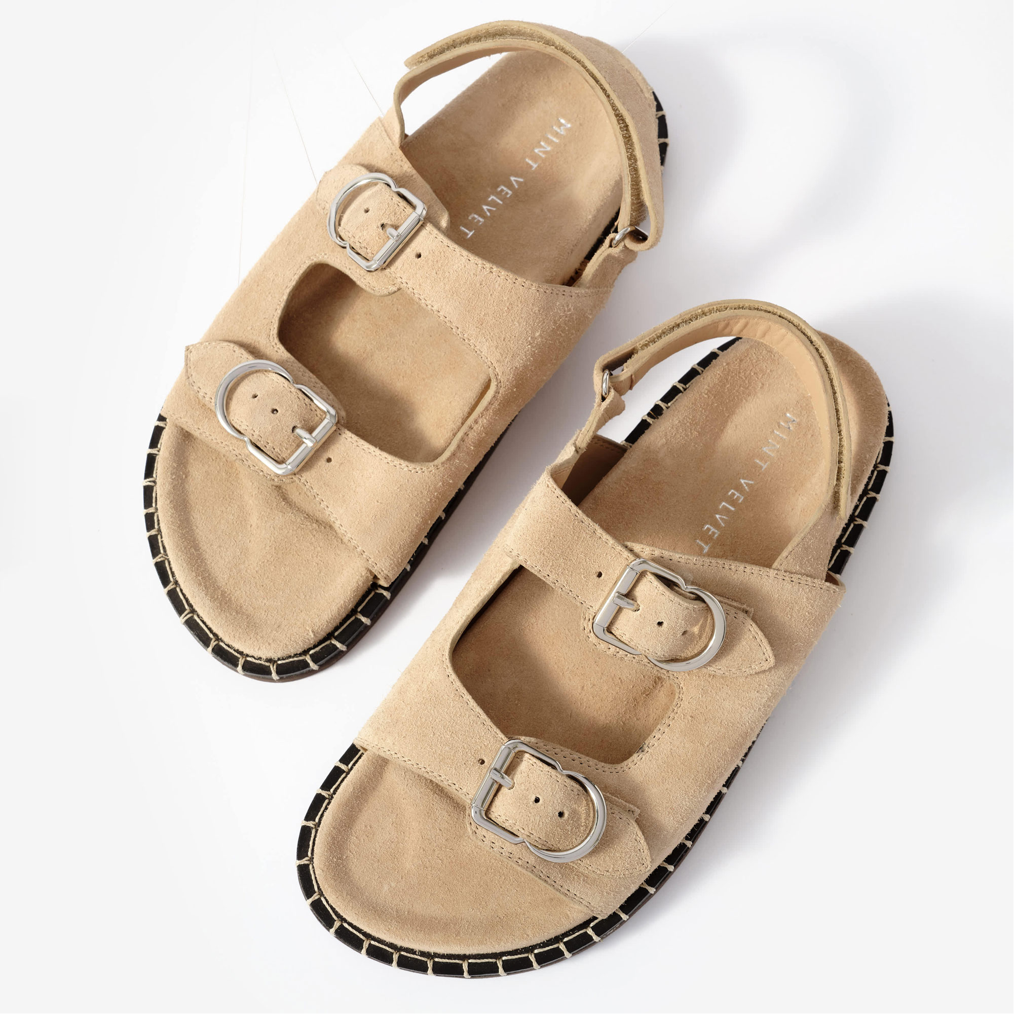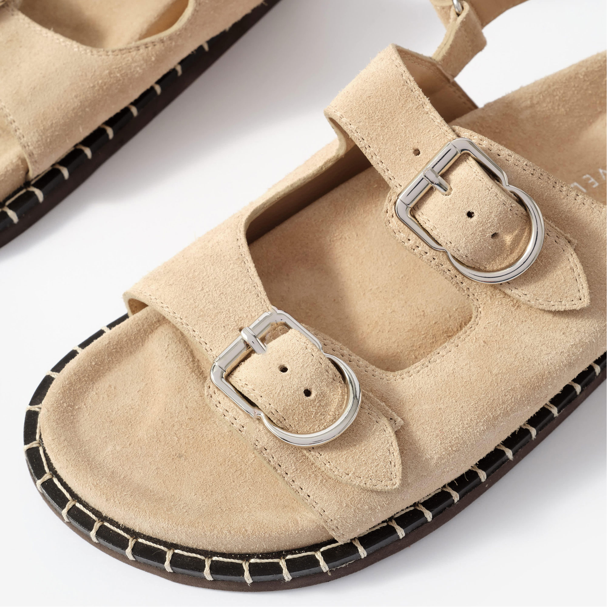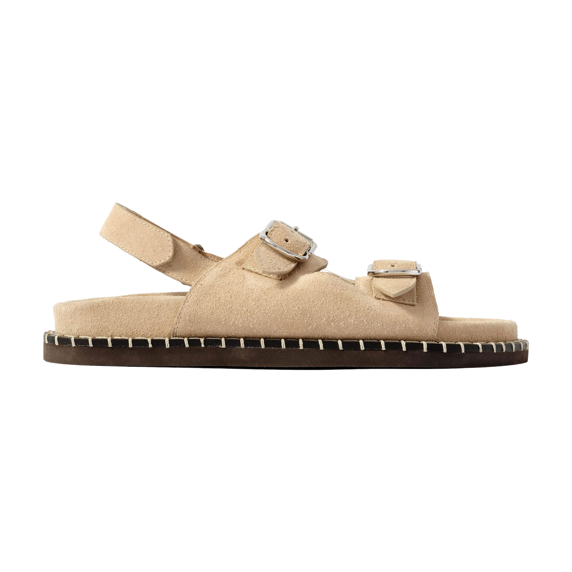 - Suede, double buckle design, silver-tone hardware, open stitch trim, flat sole