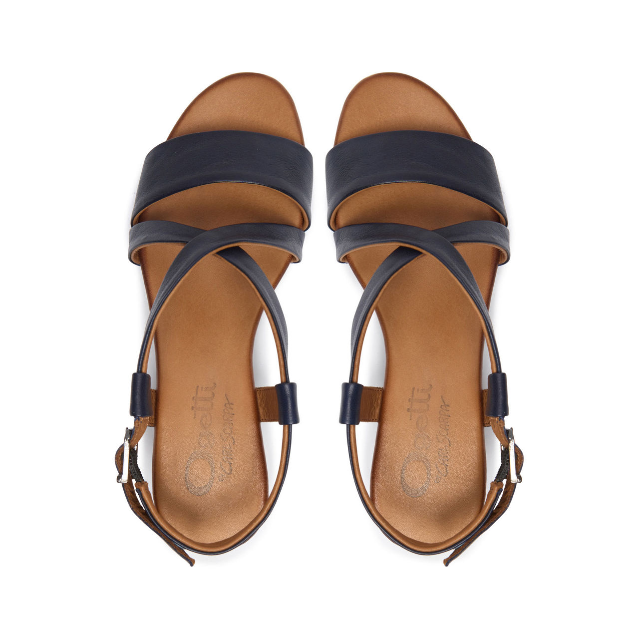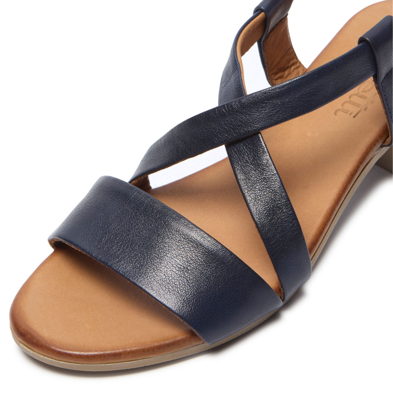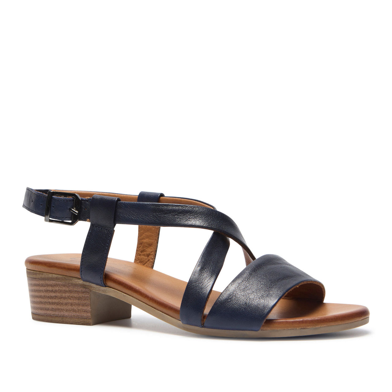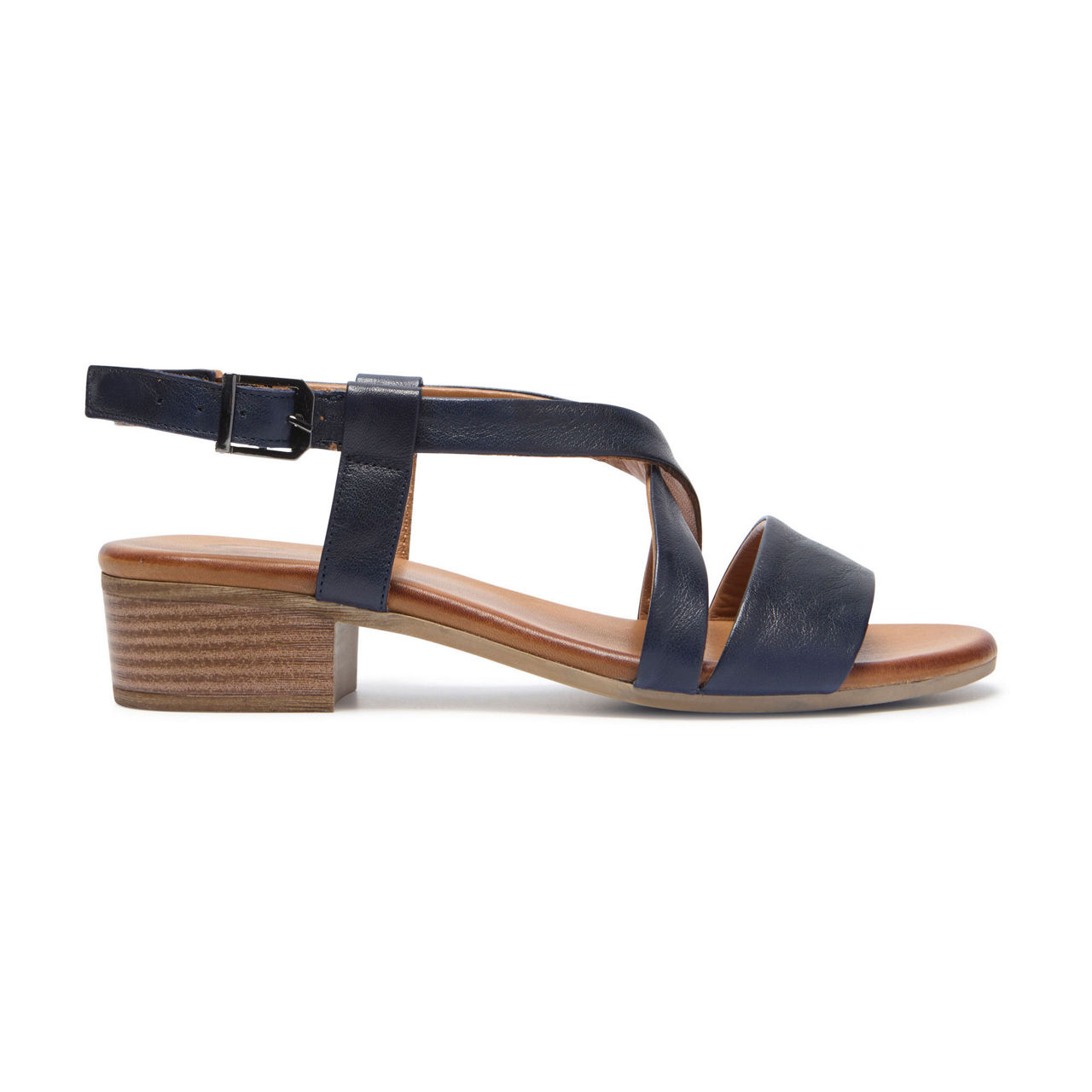 - Almond toe, low block heel, open-toe strappy design, adjustable buckle fastening, leather lining, cushioned insole