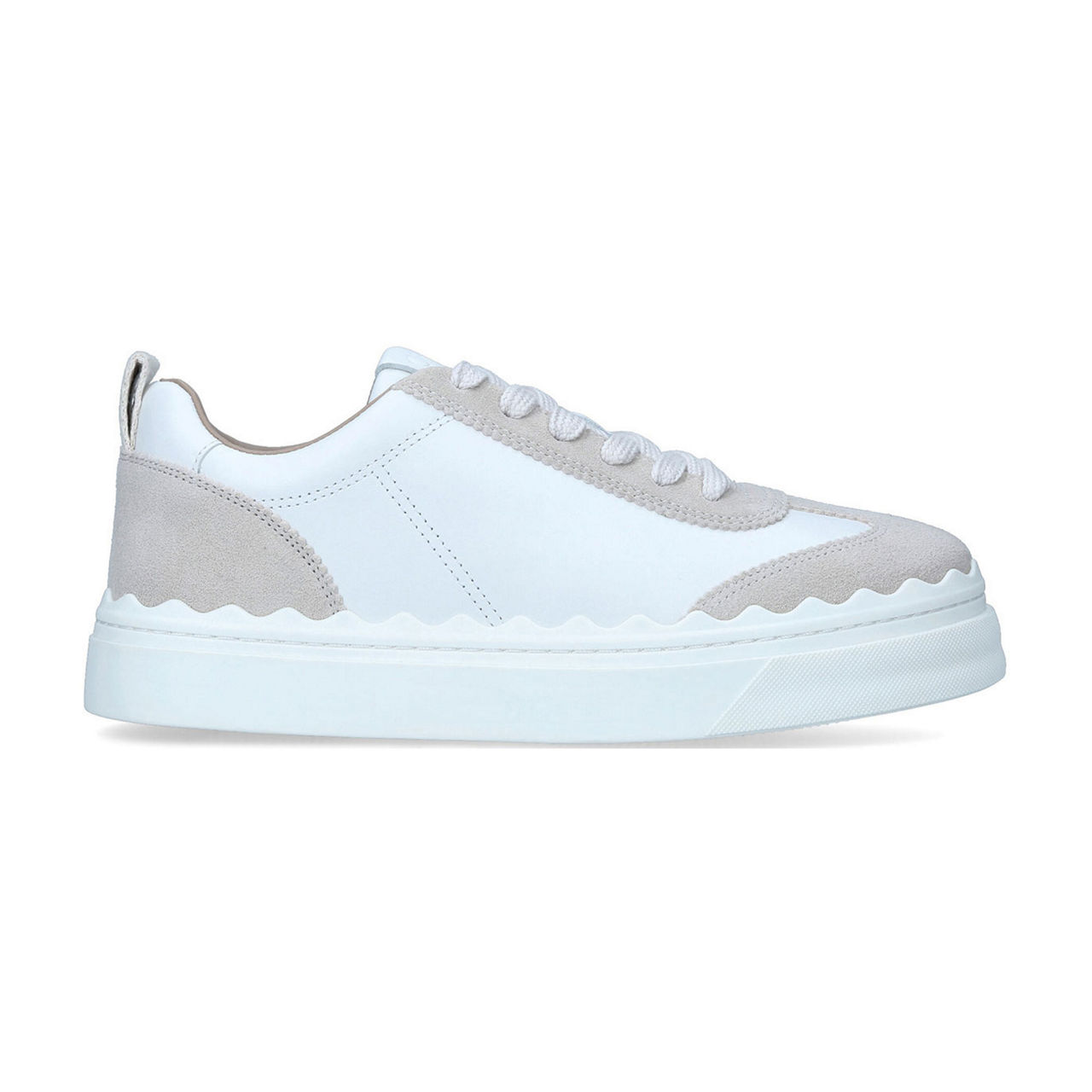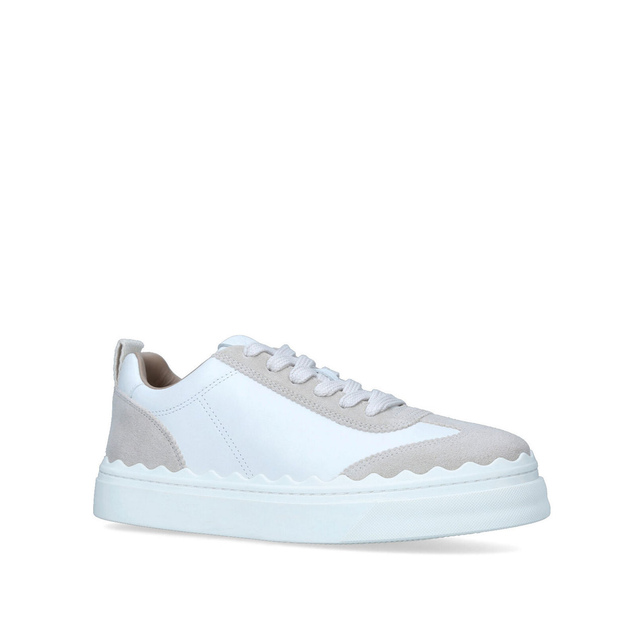 - Flat sole, platform sole, lace fastening, suede panelling, scallop trim, branded heel loop.