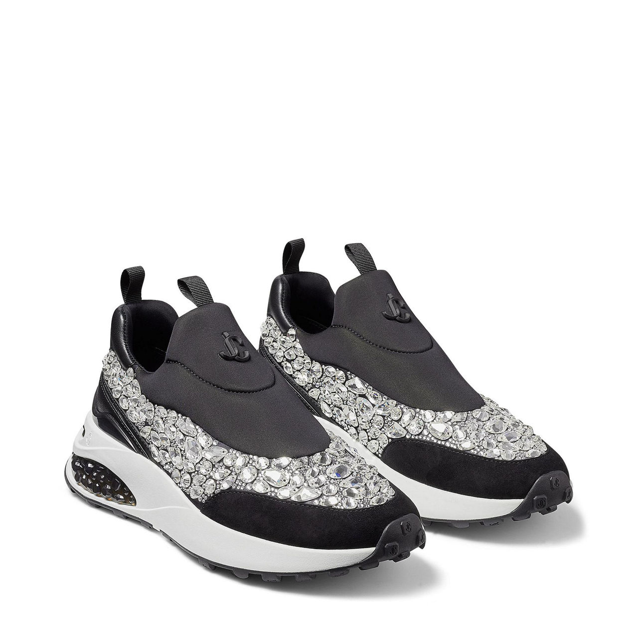 - Slip on style, low top, pull tabs, chunky sole, JC emblem, crystal embellishment.
